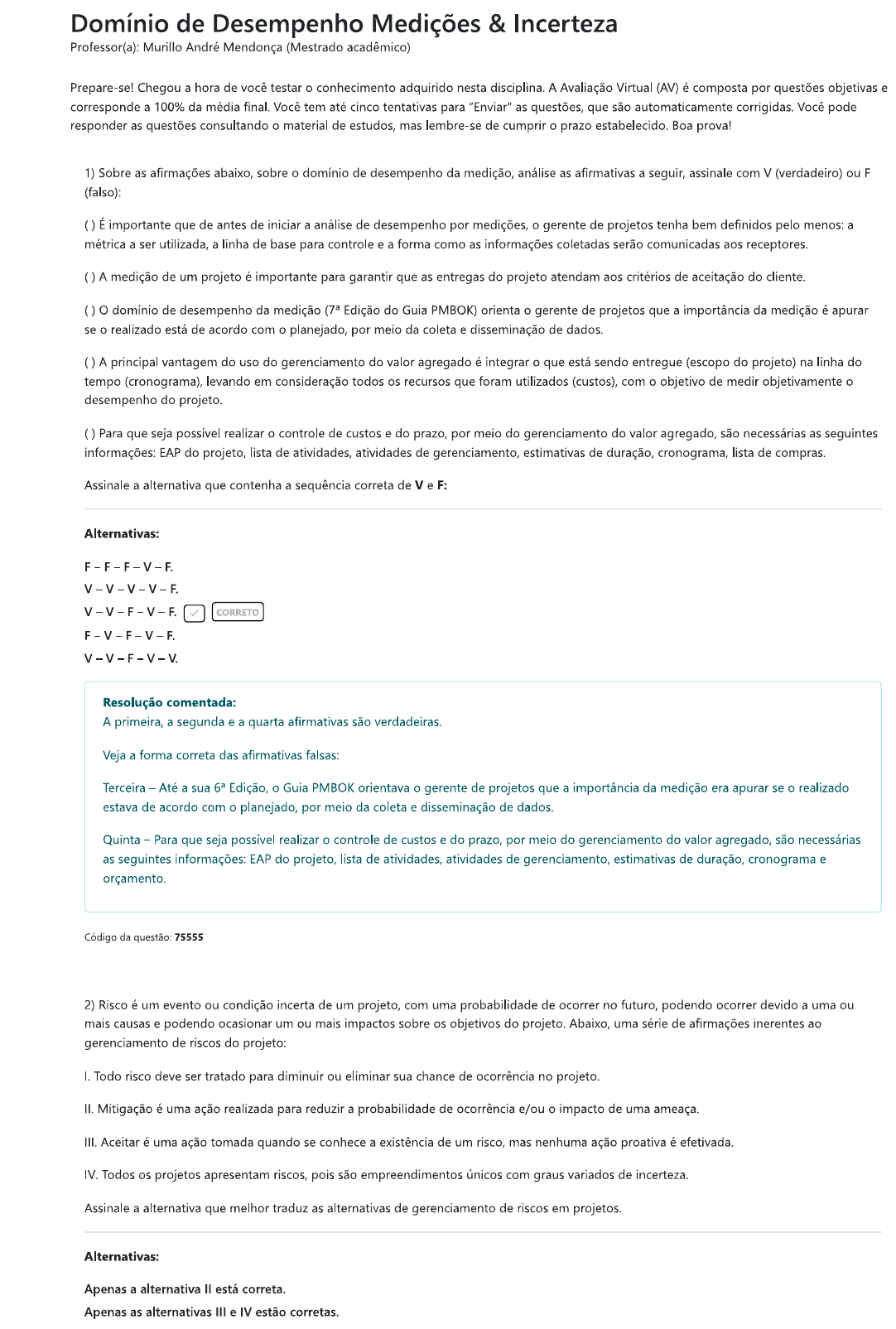 <p>Domínio de Desempenho Medições & Incerteza Professor(a): Murillo Mendonça (Mestrado acadêmico) Prepare-se! Chegou a hora de você testar o conhecimento adquirido nesta disciplina. A Avaliação Virtual (AV) é composta por questões objetivas e corresponde a 100% da média final. Você tem até cinco tentativas para "Enviar" as questões, que são automaticamente corrigidas. Você pode responder as questões consultando o material de estudos, mas lembre-se de cumprir o prazo estabelecido. Boa prova! 1) Sobre as afirmações abaixo, sobre o domínio de desempenho da medição, análise as afirmativas a seguir, assinale com V (verdadeiro) ou F (falso): É importante que de antes de iniciar a análise de desempenho por medições, o gerente de projetos tenha bem definidos pelo menos: a métrica a ser utilizada, a linha de base para controle e a forma como as informações coletadas serão comunicadas aos receptores. A medição de um projeto é importante para garantir que as entregas do projeto atendam aos critérios de aceitação do cliente. domínio de desempenho da medição Edição do Guia PMBOK) orienta o gerente de projetos que a importância da medição é apurar se o realizado está de acordo com o planejado, por meio da coleta e disseminação de dados. A principal vantagem do uso do gerenciamento do valor agregado é integrar o que está sendo entregue (escopo do projeto) na linha do tempo (cronograma), levando em consideração todos os recursos que foram utilizados (custos), com o objetivo de medir objetivamente desempenho do projeto. Para que seja possível realizar o controle de custos e do prazo, por meio do gerenciamento do valor agregado, são necessárias as seguintes informações: EAP do projeto, lista de atividades, atividades de gerenciamento, estimativas de duração, cronograma, lista de compras. Assinale a alternativa que contenha a sequência correta de V e F: Alternativas: V-V-V-V-F V-V-F-V-F CORRETO Resolução comentada: A primeira, a segunda e a quarta afirmativas são verdadeiras. Veja a forma correta das afirmativas falsas: Terceira Até a sua Edição, o Guia PMBOK orientava o gerente de projetos que a importância da medição era apurar se o realizado estava de acordo com o planejado, por meio da coleta e disseminação de dados. Quinta Para que seja possível realizar o controle de custos e do prazo, por meio do gerenciamento do valor agregado, são necessárias as seguintes informações: EAP do projeto, lista de atividades, atividades de gerenciamento, estimativas de duração, cronograma e orçamento. Código da questão: 75555 2) Risco é um evento ou condição incerta de um projeto, com uma probabilidade de ocorrer no futuro, podendo ocorrer devido a uma ou mais causas e podendo ocasionar um ou mais impactos sobre os objetivos do projeto. Abaixo, uma série de afirmações inerentes ao gerenciamento de riscos do projeto: I. Todo risco deve ser tratado para diminuir ou eliminar sua chance de ocorrência no projeto. II. Mitigação é uma ação realizada para reduzir a probabilidade de ocorrência e/ou o impacto de uma ameaça. III. Aceitar é uma ação tomada quando se conhece a existência de um risco, mas nenhuma ação proativa é efetivada. IV. Todos os projetos apresentam riscos, pois são empreendimentos únicos com graus variados de incerteza. Assinale a alternativa que melhor traduz as alternativas de gerenciamento de riscos em projetos. Alternativas: Apenas a alternativa II está correta. Apenas as alternativas III e IV estão corretas.</p><p>Todas as alternativas estão corretas. Apenas as alternativas e II estão corretas. Apenas as alternativas II, III e IV estão corretas CORRETO Resolução comentada: Nem todo risco deve ser evitado nos projetos. Uma oportunidade é uma condição ou evento (risco) que, se ocorrer, tem um impacto positivo em um ou mais objetivos do projeto e possui estratégias com o objetivo de potencializar o efeito dos riscos positivos Código da questão: 75567 3) Você foi contratado(a) como gerente de um projeto de uma estação de tratamento de água, com prazo de duração de um ano. Ao tomar conhecimento do escopo do projeto, e com base no histórico de lições aprendidas da empresa, você verificou um histórico anormal de sobrecustos na execução das instalações hidráulicas da estação. No momento da contratação da empresa que executará os serviços de instalações, qual modalidade de contrato a ser adotada para o fornecedor, em questão, para proteger a empresa do risco de sobrecustos? Alternativas: Contrato entrega indefinida, quantidade indefinida. INCORRETO Contratos de preço fixo. Contratos de custos reembolsáveis. Contrato de tempo e materiais. Acordo de nível de serviço. Resolução comentada: Categoria de contrato que envolve a definição de um preço fixo total para determinado produto ou serviço, ou resultado a ser fornecido. No caso, transfere os riscos totalmente para a parte contratada. Código da questão: 75568 4) Sobre as informações abaixo, a respeito do método de revisão de riscos, analise as afirmativas a seguir e assinale-as com V (verdadeiro) ou F (falso). Evento que analisa o status dos riscos, anteriormente, existentes no projeto. Não é possível, por meio deste método, determinar se os riscos anteriores do projeto ainda estão ativos e se houve alguma mudança em seus atributos. Não possibilita a identificação de novos riscos. Riscos inativos devem permanecer no relatório de revisão dos riscos até o final do Assinale a alternativa que contenha a sequência correta. Alternativas: V-F-V- V-F-F-V V-V-F-F CORRETO Resolução comentada: Apenas a primeira alternativa é a correta. Veja a forma correta das afirmativas falsas: I. O método possibilita determinar se os riscos anteriores do projeto ainda estão ativos e se houve alguma mudança nos seus atributos. II. O método possibilita a identificação de novos riscos. III. Riscos inativos devem se