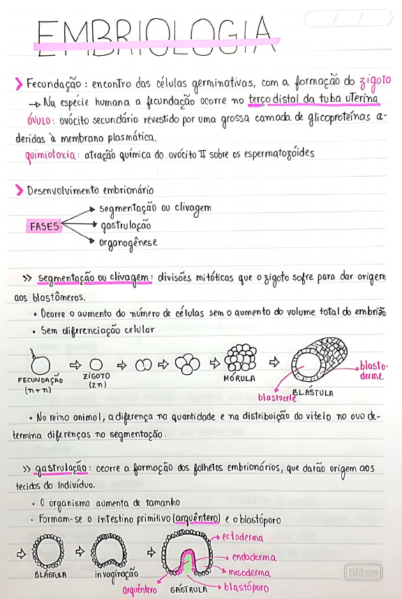 <p>/ encontro das células germinativas, com a formação do zigoto Na especie humana a ocorre no terço da tuba secundário revestido por grossa camada de glicoproteínas a- deridas a membrano plasmática. atração química do ovocito II sobre espermatozoides Desenvolvimento embrionário segmentação clivagem FASES gastrulação organogênese segmentação ou divisões mitóticas que ozigoto sofre para dar origem aos Ocorre aumento do numero de células sem aumento do volume total do Sem diferenciação celular FECUNDAÇÃO MORULA derme (2n) (n+n) blastocele BLASTULA No reino a diferenca na quantidade e na distribuição do vitelo no de- termina diferencas no >> ocorre a formação dos folhetos embrionários, que darão origem aos tecidos do 0 organismo aumenta de tamanho Formam-se 0 intestino primitivo (arquêntero) e ectoderma enobderma BLASTULA invaginação mesoderma GASTRULA</p>