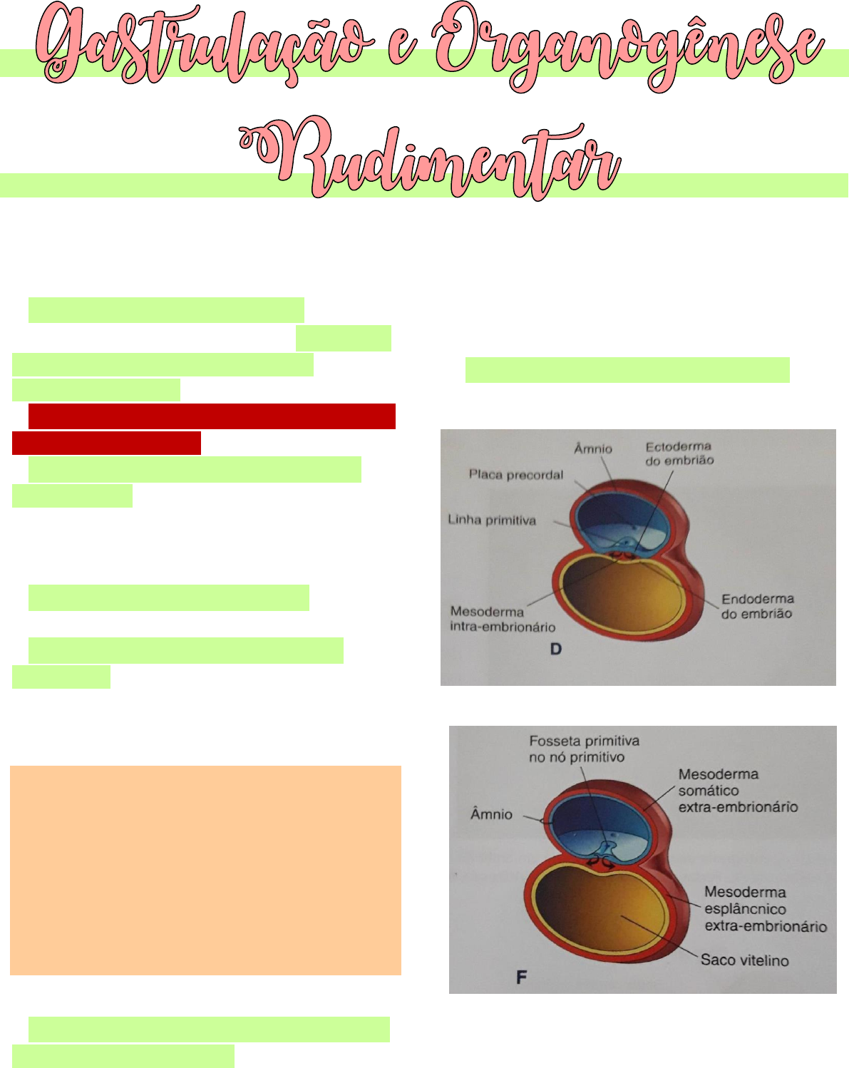 <p>Gastrulação</p><p>→ Inicia a partir da 3º semana gestacional</p><p>→ É o processo formativo pelo qual as três camadas</p><p>germinativas ou folhetos germinativos são</p><p>estabelecidas, formadas</p><p>→ Camadas ou Folhetos Germinativos → ectoderma,</p><p>mesoderma e endoderma</p><p>→ A orientação axial são estabelecidas durante o</p><p>desenvolvimento (a partir desse evento é possível</p><p>olhar para o embrião que está se desenvolvendo e</p><p>estabelecer o que é em cima, em baixo, direito,</p><p>esquerdo, posterior, anterior)</p><p>→ É o inicio da morfogênese do embrião →</p><p>embrião começa a adquirir a sua forma</p><p>→ Cada uma dessas camadas irá receber uma</p><p>determinação, células determinadas, sendo</p><p>responsáveis pela formação de algum tecido ou</p><p>órgão especifico no corpo do individuo</p><p>→ Ectoderma → epiderme; SNC e SNP; retina do</p><p>olho, etc</p><p>→ Mesoderma → capas de músculo liso; tecidos</p><p>conjuntivos e vasos; esqueleto; músculo estriados;</p><p>Sistema urogenital</p><p>→ Endoderma → revestimentos epiteliais das vias</p><p>respiratórias e do trato gastrointestinal e glândulas</p><p>anexas</p><p>→ Movimentos Morfogenéticos → responsáveis por</p><p>criar novas formas no embrião, permite que essas</p><p>células se organizem para que elas façam a migração</p><p>celular e consigam dar origem as camadas</p><p>germinativas</p><p>Surgimento da Linha Primitiva</p><p>→ Surgimento de uma linha no embrião que</p><p>apresenta somente dois folhetos germinativos</p><p>→ A linha primitiva surge na região de epiblasto</p><p>→ Estabelecimento da orientação axial</p><p>Gastrulação e Organogênese</p><p>Rudimentar</p><p>→ Embrião de Galinha Montagem total</p><p>(toda a estrutura fixada na lâmina),</p><p>→ 18 horas de incubação, equivalente a 3 semanas</p><p>gestacionais para os mamíferos</p><p>→ Visão de cima, epiblasto</p><p>→ Embrião de galinha apresenta os mesmos</p><p>processos, eventos, que o embrião de um mamífero</p><p>diferenciando apenas no tempo em que isso leva</p><p>para ocorrer</p><p>→ No final da linha primitiva, região cefálica ou</p><p>anterior, acúmulo de células do epiblasto → nó</p><p>primitivo ou de Hensen</p><p>→ Surgimento de Linha Primitiva → células do</p><p>epiblasto começam a migrar e vão para dentro da</p><p>linha primitiva para uma região intermediária,</p><p>preenche essa camada, se modificam, e empurram o</p><p>hipoblasto formando o endoderma definitivo do</p><p>embrião</p><p>→ Pouco depois do aparecimento da linha primitiva,</p><p>células abandonam sua superfície profunda e formam</p><p>o mesênquima</p><p>→ Através do processo de gastrulação,</p><p>as células que estão presentes no</p><p>epiblasto vão dar origem a todas as 3</p><p>camadas do embrião (ectoderma,</p><p>mesoderma e endoderma)</p><p>→ Epiblasto vai dar origem ao corpo do</p><p>embrião formando-o propriamente dito</p><p>→ No disco bidérmico (duas camadas, epiblasto +</p><p>hipoblasto) o evento que marca o início da</p><p>gastrulação é o surgimento da linha primitiva (início</p><p>da 3º semana gestacional)</p><p>Células de Garrafa</p><p>↪ Células do epiblasto começam a se alongar ao</p><p>migrar para a linha primitiva, assumindo uma forma</p><p>de células de garrafa</p><p>↪ Ao migrar, caem na região intermediária e</p><p>começam a afastar o epiblasto do hipoblasto</p><p>↪ Modificam sua forma adquirindo uma forma de</p><p>“estrela” e se transformam em células</p><p>mesenquimais</p><p>↪ Após terem formado toda a região de</p><p>mesênquima, as células continuam migrando pela</p><p>linha primitiva e pelo nó de hensen, sendo a linha</p><p>primitiva o principal caminho, desloca o hipoblasto</p><p>e se transformam em células endodérmicas</p><p>↪ Células que permaneceram no epiblasto, após</p><p>cessar a migração celular, se modificam e adquirem</p><p>característica epitelial se transformando em</p><p>ectoderma</p><p>↪ “bolacha com recheio” sendo o recheio as células</p><p>mesenquimais</p><p>→ Células do epiblasto começam a produzir</p><p>um polímero, ácido hialurônico</p><p>→ Ele vai penetrar no espaço entre o</p><p>epiblasto e o hipoblasto</p><p>→ Ácido Hialurônico está associado com a</p><p>migração celular em sistemas que estão se</p><p>desenvolvendo, sua função principal é</p><p>impedir a agregação das células</p><p>mesenquimais durante as migrações</p><p>celulares</p><p>→ Fibronectina → permite que as células</p><p>mesenquimais continuem migrando e tenha</p><p>a difusão delas na região intermediária</p><p>→ Compostos responsáveis pela migração</p><p>celular e permitir a sua difusão na região</p><p>intermediária e que elas não se agreguem</p><p>Destino da Linha Primitiva</p><p>→ Após a formação dos 3 folhetos</p><p>embrionários e eles começam a se</p><p>diferenciar nos diferentes tecidos</p><p>→ A linha primitiva regride, diminui de</p><p>tamanho e forma uma estrutura</p><p>insignificante na região sacrococcígea do</p><p>embrião (“cofrinho”)</p><p>→ Sofre mudanças degenerativas e</p><p>desaparece, morte celular programada</p><p>(apoptose)</p><p>→ Podem ocorrer falhas nessa regressão podendo</p><p>ficar um resquício maior “rabinho” ou pode formar os</p><p>teratomas</p><p>Formação da Notocorda</p><p>→ Através do nó primitivo ocorre também migração</p><p>celular</p><p>→ Não tomam o caminho mais caudal e se</p><p>diferenciam em 3 camadas germinativas</p><p>→ Células que migram do epiblasto pelo nó primitivo</p><p>e seguem para uma região mais cefálica formando o</p><p>processo notocordal</p><p>→ Processo Notocordal → formação da notocorda</p><p>→ A migração dessas células pelo nó primitivo ocorre</p><p>até encontrarem uma placa pró-cordal ou pré-cordal</p><p>→ Placa Pró-Cordal ou Pré-Cordal 