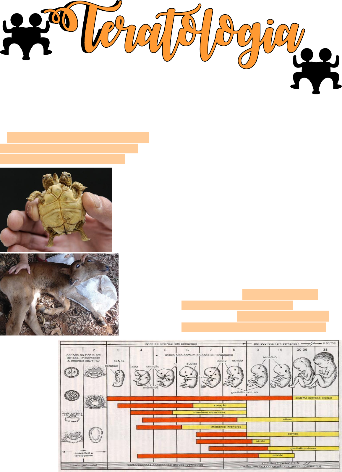 <p>Conceito</p><p>→ Estudo de monstros</p><p>→ Anomalias congênitas, defeitos ao nascimento e</p><p>malformações congênitas → perturbações do</p><p>desenvolvimento presente ao nascimento</p><p>→ Certos estágios do desenvolvimento embrionário</p><p>são mais vulneráveis ou suscetíveis a perturbações</p><p>que outros</p><p>→ Estima-se que de 7 a 100% desse defeitos</p><p>congênitos humanos resultem da ação perturbadora</p><p>de drogas, vírus e outros fatores ambientais</p><p>→ Em alaranjado → período mais suscetível a</p><p>perturbações, ações dos teratógenos</p><p>→ Em amarelo → não ocorre uma má formação</p><p>anatômica ou morfológica, mas apenas fisiológica</p><p>Teratologia</p><p>Causas das Anomalias são</p><p>Frequentemente Divididas em</p><p>→ Fatores Genéticos → anormalidades</p><p>cromossômicas</p><p>→ Fatores Ambientais → drogas e vírus</p><p>→ Herança Multifatorial → fatores genéticos e</p><p>ambientais</p><p>→ Em 50% a 60% das anomalias congênitas a</p><p>etiologia é desconhecida</p><p>→ As anomalias podem ser únicas ou múltiplas e de</p><p>grande ou pequeno significado clínico</p><p>→ Grandes defeitos no desenvolvimento, são mais</p><p>comuns nos embriões iniciais, cerca de 10% a 15%,</p><p>mas a maioria desse embriões mal formados durante</p><p>esse período é abortado espontaneamente durante</p><p>as 6 primeiras semanas de desenvolvimento em</p><p>humano</p><p>→ Cerca de 70% das fertilizações que ocorrem não</p><p>obtém sucesso por consequência das anomalias, não</p><p>sendo viável para a espécie</p><p>● Numericamente, os fatores genéticos são as</p><p>causas mais comuns de anomalias congênitas</p><p>→ Mitoses e meiose → defeito</p><p>→ Muitos dos embriões iniciais que são anormais não</p><p>sofrem o processo de clivagem normalmente e não</p><p>vão se tornar blastocistos</p><p>→ Muitos blastocistos, por volta de 3 semanas</p><p>gestacionais anormais são abortados</p><p>espontaneamente</p><p>→ Frequência de anormalidades cromossômicas</p><p>nesses embriões que são abortados durante esse</p><p>período é de 50% ou mais</p><p>● 2 tipos de alterações acontecem nos</p><p>componentes cromossômicos</p><p>→ Numéricas</p><p>→ Estruturais → podem afetar os</p><p>cromossomos sexuais e/ou os</p><p>autossômicos</p><p>→ Em alguns casos ambos os tipos de</p><p>cromossomos podem ser afetados</p><p>→ Os fatores genéticos causam anomalias</p><p>por meios bioquímicos ou outros no nível celular ou</p><p>tecidual, esses fatores anormais iniciados por fatores</p><p>genéticos podem ser identificados ou semelhantes</p><p>aos mecanismos induzidos por teratógenos (por ex:</p><p>drogas)</p><p>Aberrações Numéricas dos Cromossomos</p><p>→ Resultam geralmente da não-disjunção, erro na</p><p>divisão celular, pode ocorrer em pares de</p><p>cromossomos ou em cromátides (mitose ou meiose)</p><p>→ Par de cromossomos ou cromátides vai para uma</p><p>célula filha enquanto a outra não recebe nenhuma</p><p>→ Pode ocorrer durante a gametogênese paterna ou</p><p>materna</p><p>→ As aberrações numéricas na maioria dos embriões,</p><p>monossomia dos autossomos por exemplo e</p><p>cromossomos sexuais, não sobrevive</p><p>Monossomia</p><p>→ Tanto nos homens como nos animais domésticos,</p><p>os indivíduos apresentando a monossomia do</p><p>cromossomo X (genótipo X0) são viáveis</p><p>→ Em humanos essa condição → Síndrome</p><p>de Turner (45, X)</p><p>→ Características sexuais secundárias não se</p><p>desenvolvem em 90% dos casos</p><p>→ Caracterizado por um fenótipo feminino,</p><p>mas não apresenta ovários estéreis</p><p>→ Anormalidade citogenética mais comum</p><p>observada em seres humanos nascidos vivos</p><p>e em fetos que são abortados</p><p>espontaneamente</p><p>→ Não-disjunção que causa a monossomia do X, erro</p><p>na gametogênese, gameta paterno</p><p>→ Em 75% dos casos o cromossomo X paterno</p><p>está ausente</p><p>→ Podem apresentar outros tipos de cariótipo além</p><p>do 45, X</p><p>● Em animais domésticos</p><p>→ O genótipo X0 tem maior prevalência em equinos,</p><p>porém já foi descrito em suínos e gatos</p><p>→ Fêmeas → inférteis, permanecem em anestro</p><p>(não entram na fase reprodutiva), ovários</p><p>hipoplásicos, útero pequeno e genitália externa</p><p>subdesenvolvida</p><p>→ Sabe-se que tem a necessidade de no mínimo um</p><p>cromossomo X para manter a viabilidade de</p><p>mamíferos</p><p>→ Y0 → invariavelmente letal, não sobrevive</p><p>Trissomia</p><p>→ Quando três cromossomos estão presentes em</p><p>vez do par usual, a anormalidade constitui uma</p><p>trissomia (47c)</p><p>→ Mais da metade dos embriões trissômicos são</p><p>abortados espontaneamente no início da gravidez</p><p>→ A trissomia dos autossomos acontece mais</p><p>frequentemente a medida que a idade da mãe</p><p>avança</p><p>● Anormalidades numéricas mais comuns dos</p><p>cromossomos</p><p>→ Não-disjunção meiótica dos cromossomos</p><p>Associada a três síndromes principais:</p><p>● Trissomia do 21 ou Síndrome de Down</p><p>● Trissomia do 18 ou Síndrome de Edwards</p><p>● Trissomia do 13 ou Síndrome de Patau</p><p>→ São gravemente mal formadas e mentalmente</p><p>retardadas e geralmente morrem no início da</p><p>infância</p><p>↪ Patau → defeito no couro cabeludo, polidactilia,</p><p>microftalmia, orelhas malformadas, fenda palatina</p><p>↪ Edwards → micrognatia (defeito na região da</p><p>mandíbula), orelhas malformadas, defeitos no coração</p><p>→ Em humanos, a trissomia dos cromossomos</p><p>sexuais é uma condição comum</p><p>→ Não há achados físicos característicos em lactantes</p><p>e crianças, esse distúrbio só detectado já na</p><p>puberdade</p><p>→ Duas massas de cromatina sexual estao presentes</p><p>no núcleo de mulheres (XXX
