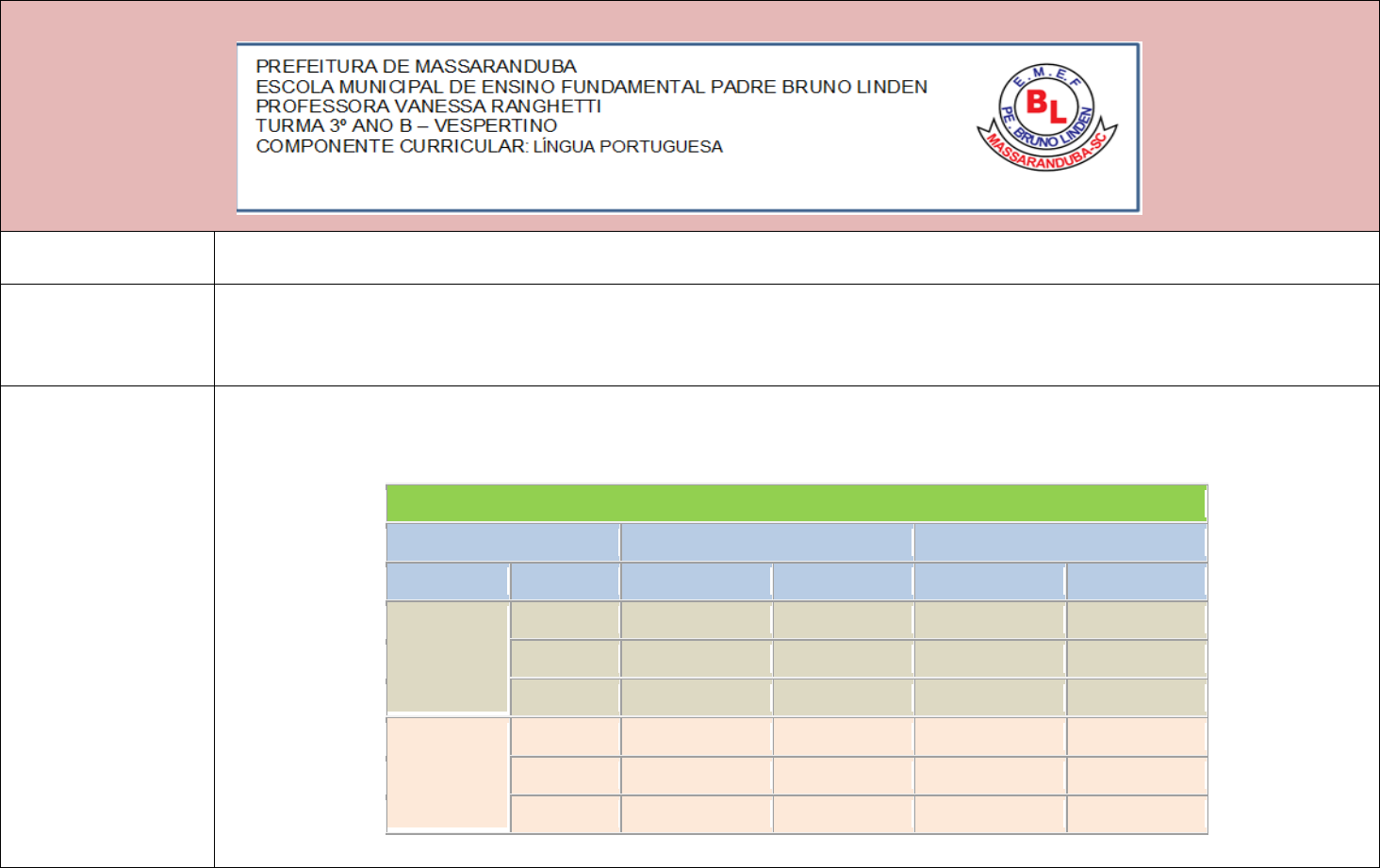 <p>3º ANO B – 29/06 a 03/07 – 6ªSEMANA – 2ºTRIMESTRE</p><p>CONTEÚDO • PRONOMES</p><p>OBJETIVOS (EF35LP06) Recuperar relações entre partes de um texto, identificando substituições lexicais (de</p><p>substantivos por sinônimos) ou pronominais (uso de pronomes anafóricos – pessoais, possessivos,</p><p>demonstrativos) que contribuem para a continuidade do texto.</p><p>DESCRIÇÃO DA</p><p>ATIVIDADE</p><p>ATIVIDADE</p><p>Escreva em seu caderno de língua portuguesa o quadro abaixo:</p><p>Os pronomes possessivos indicam uma relação de posse associada à pessoa do discurso.</p><p>PRONOMES POSSESSIVOS</p><p>Singular Plural</p><p>Número Pessoa Masculino Feminino Masculino Feminino</p><p>Singular 1ª Meu minha meus minhas</p><p>2ª Teu Tua teus Tuas</p><p>3ª Seu sua seus Suas</p><p>Plural 1ª Nosso nossa nossos Nossas</p><p>2ª Vosso vossa Vossos vossas</p><p>3ª seu sua seus Suas</p><p>REALIZE AS ATIVIDADES:</p><p>OBSERVAÇÃO: FOTOGRAFE A ATIVIDADE E ENVIE NO WHATSAPP PRIVADO DA PROFESSORA OU POR E-MAIL:</p><p>VANESSA.RANGHETTI@GMAIL.COM</p><p>PARA QUEM NÃO TEM ACESSO À INTERNET, FAÇA AS ATIVIDADES NA FOLHA E MANDE PELO MOTORISTA.</p><p>Dicas de</p><p>acompanhamento</p><p>dos Pais</p><p>Elogie e motive. O incentivo é importante para que seu filho se mantenha motivado e queira continuar as</p><p>atividades.</p><p>Reconheça cada progresso realizado. Elogie toda vez que a criança adiantar as atividades propostas.</p><p>Assim, ela se tornará mais confiante para continuar aprendendo.</p><p>ATIVIDADES EXTRAS https://www.youtube.com/watch?v=lKRaTIIMAyo</p><p>Para entender melhor o conteúdo leia as informações abaixo:</p><p>Os pronomes possessivos concordam em gênero e número com a coisa possuída, e</p><p>em pessoa com o possuidor.</p><p>(eu) Vendi minha moto.</p><p>(tu) Releste tua prova?</p><p>(nós) Compramos nosso carro.</p><p>Quando o pronome possessivo determina mais de um substantivo, ele deverá concordar</p><p>em gênero e número com o substantivo mais próximo.</p><p>Vou lavar minhas sandálias e tênis.</p><p>Emprego dos pronomes possessivos</p><p>- seu: a utilização do pronome seu (e flexões) pode gerar frases ambíguas, podemos ter dúvidas</p><p>quanto ao possuidor.</p><p>A menina disse ao colega que não concordava com sua reprovação.</p><p>(reprovação de quem? Da menina ou do colega?)</p><p>https://www.youtube.com/watch?v=lKRaTIIMAyo</p><p>Para evitar esse tipo de ambiguidade, usa-se dele (dela, deles, delas)</p><p>A menina disse ao colega que não concordava com a reprovação dela.</p><p>• A reprovação dela (da menina)</p><p>A menina disse ao colega que não concordava com a reprovação dele.</p><p>• A reprovação dele (do colega)</p><p>- existem casos em que o pronome possessivo não exprime propriamente ideia de posse. Ele pode</p><p>ser utilizado para indicar aproximação, afeto ou respeito.</p><p>Aquele museu deve ter seus cem anos. (aproximação)</p><p>Meu caro amigo, cuide melhor de sua saúde. (afeto)</p><p>Sente-se aqui, minha senhora. (respeito)</p><p>- seu: anteposto a nomes próprios não é possessivo, mas uma alteração fonética de Senhor.</p><p>Seu José, o senhor poderia emprestar-me seu celular?</p>