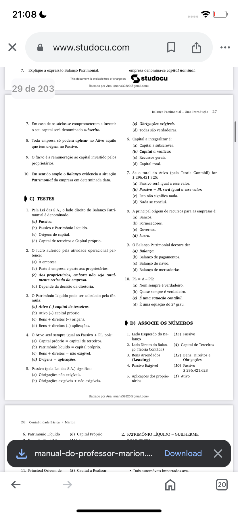<p>21:08 X www.studocu.com 7. Explique a expressão Balanço empresa denomina-se capital nominal This document is available free of charge on studocu 29 de 203 Baixado por Ana (mana32820@gmail.com) Balanço Patrimonial Uma Introdução 27 7. Em caso de os sócios se comprometerem a investir (c) Obrigações exigíveis. o seu capital será denominado subscrito. (d) Todas são verdadeiras. 8. Toda empresa só poderá aplicar no Ativo aquilo 6. Capital a integralizar é: que tem origem no (a) Capital a (b) Capital a 9. O lucro é a remuneração ao capital investido pelos (c) Recursos gerais. proprietários. (d) Capital total. 10. Em sentido amplo Balanço evidencia a situação 7. Se o total do Ativo (pela Teoria for $ 296.421.325: Patrimonial da empresa em determinada data. (a) Passivo será igual a esse valor (b) Passivo + PL será igual a esse valor. (c) Isto não significa nada. C) TESTES (d) Nada se conclui. 1. Pela Lei das S.A., lado direito do Balanço Patri- 8. A principal origem de recursos para as empresas é: monial é (a) (a) (b) (b) Passivo e Patrimônio Líquido. (c) (c) Origens de capital. (d) Lucro. (d) Capital de terceiros e Capital próprio. 9. Balanço Patrimonial decorre de: 2. O lucro auferido pela atividade operacional per- (a) Balança. tence: (b) Balanço de pagamentos. (a) À empresa. (c) Balanço do (b) Parte à empresa e parte aos (d) Balanço de (c) Aos proprietários, embora não seja total- mente retirado da empresa. 10. PL A PE: (d) Depende da decisão da (a) Nem sempre é verdadeiro. (b) Quase sempre é verdadeiro. 3. Patrimônio Líquido pode ser calculado pela (c) É uma equação mula: (a) Ativo (-) capital de terceiros. (d) É uma equação do grau. (b) Ativo (-) capital próprio. (c) Bens + direitos (-) origens. D) ASSOCIE os NÚMEROS (d) Bens + direitos (-) aplicações. 4. o Ativo será sempre igual ao Passivo + pois: 1. Lado Esquerdo do Ba- (15) Passivo (a) Capital próprio = capital de terceiros. lanço 2. Lado Direito do Balan- (b) Patrimônio líquido = capital próprio. (4) Capital de Terceiros (Teoria (c) Bens + direitos = não exigível. 3. Bens Arrendados (12) Direitos e (d) Origens = aplicações. (Leasing) Obrigações 4. Passivo Exigível (10) Passivo 5. Passivo (pela Lei das S.A.) significa: $ (a) Obrigações não exigíveis. 5. Aplicações dos proprie- (1) Ativo (b) Obrigações exigíveis + não exigíveis. tários Baixado por Ana (mana32820@gmail.com) 28 Contabilidade Básica Marion 6. Patrimônio Líquido (6) Capital Próprio 2. PATRIMÔNIO LÍQUIDO GUILHERME manual-do-professor-marion.. Download X 11. Principal Origem de (8) Capital a Realizar Dois automóveis importados ava- 20</p>