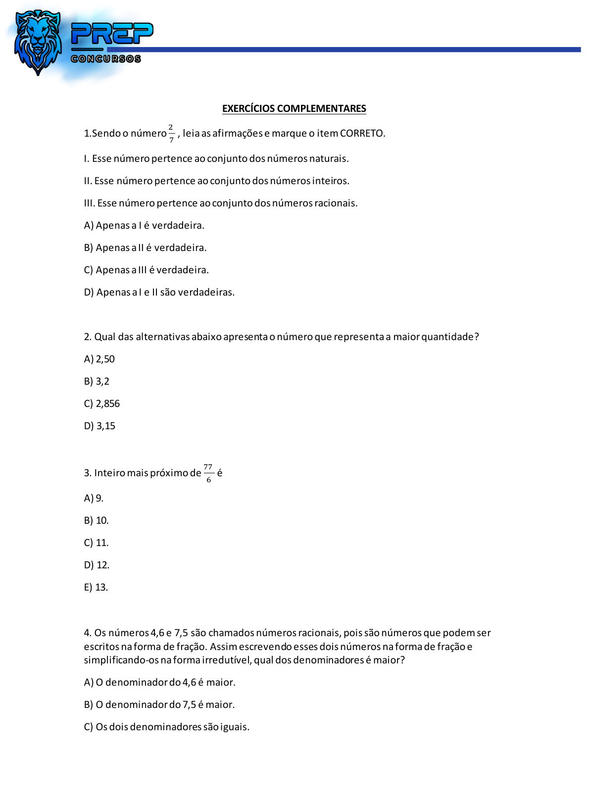<p>EXERCÍCIOS COMPLEMENTARES</p><p>1.Sendo o número</p><p>2</p><p>7</p><p>, leia as afirmações e marque o item CORRETO.</p><p>I. Esse número pertence ao conjunto dos números naturais.</p><p>II. Esse número pertence ao conjunto dos números inteiros.</p><p>III. Esse número pertence ao conjunto dos números racionais.</p><p>A) Apenas a I é verdadeira.</p><p>B) Apenas a II é verdadeira.</p><p>C) Apenas a III é verdadeira.</p><p>D) Apenas a I e II são verdadeiras.</p><p>2. Qual das alternativas abaixo apresenta o número que representa a maior quantidade?</p><p>A) 2,50</p><p>B) 3,2</p><p>C) 2,856</p><p>D) 3,15</p><p>3. Inteiro mais próximo de</p><p>77</p><p>6</p><p>é</p><p>A) 9.</p><p>B) 10.</p><p>C) 11.</p><p>D) 12.</p><p>E) 13.</p><p>4. Os números 4,6 e 7,5 são chamados números racionais, pois são números que podem ser</p><p>escritos na forma de fração. Assim escrevendo esses dois números na forma de fração e</p><p>simplificando-os na forma irredutível, qual dos denominadores é maior?</p><p>A) O denominador do 4,6 é maior.</p><p>B) O denominador do 7,5 é maior.</p><p>C) Os dois denominadores são iguais.</p><p>Conteúdo licenciado para Benedito Ferreira Oliveira - 012.267.612-24</p><p>D) Nenhuma das alternativas.</p><p>5. O número racional F é menor que -</p><p>1</p><p>2</p><p>e maior que − 1. O número racional G é menor que</p><p>−</p><p>1</p><p>2</p><p>e maior que o número racional F. Um par que cumpre as condições estabelecidas é</p><p>6. Em um determinado curso de pós-graduação,</p><p>1</p><p>4</p><p>dos participantes são graduados em</p><p>matemática,</p><p>2</p><p>5</p><p>dos participantes são graduados em geologia,</p><p>1</p><p>3</p><p>dos participantes são</p><p>graduados em economia,</p><p>1</p><p>4</p><p>dos participantes são graduados em biologia e</p><p>1</p><p>3</p><p>dos participantes</p><p>são graduados em química. Sabe-se que não há participantes do curso com outras graduações</p><p>além dessas, e que não há participantes com três ou mais graduações. Assim, qual é o número</p><p>mais próximo da porcentagem de participantes com duas graduações?</p><p>A) 40%</p><p>B) 33%</p><p>C) 57%</p><p>D) 50%</p><p>E) 25%</p><p>7. Seu Carlos vendeu</p><p>3</p><p>5</p><p>de sua sacola de camisetas que, inicialmente, tinha 150 camisetas.</p><p>Quantas camisetas foram vendidas?</p><p>A) 60.</p><p>B) 30.</p><p>C) 40.</p><p>D) 90.</p><p>E) 80.</p><p>Conteúdo licenciado para Benedito Ferreira Oliveira - 012.267.612-24</p><p>8. Uma cidade do interior brasileiro tinha 50 enfermeiros, mas 110 saiu por aposentadoria. Do</p><p>restante, 29 estão afastados por doenças. De acordo com as exigências da Organização</p><p>Mundial da Saúde (OMS), essa cidade deve ter, no mínimo, 40 enfermeiros trabalhando.</p><p>Então, quantos enfermeiros deverão ser contratados para atender o número mínimo exigido</p><p>pela OMS?</p><p>A) 5.</p><p>B) 6.</p><p>C) 7.</p><p>D) 8.</p><p>E) 9.</p><p>9. Em uma lanchonete há 4 mesas com 4 cadeiras em cada uma, e 8 mesas com 2 cadeiras em</p><p>cada uma. A fração que representa o número total de mesas sobre o número total de cadeiras</p><p>é</p><p>a)</p><p>1</p><p>8</p><p>b)</p><p>1</p><p>4</p><p>c)</p><p>3</p><p>8</p><p>d)</p><p>1</p><p>2</p><p>e)</p><p>5</p><p>8</p><p>10. Um comércio tem 4 atendentes e, em determinado dia, foi realizada certa quantidade de</p><p>vendas, das quais, Maria realizou um quinto dessa quantidade, Renato realizou um terço dessa</p><p>quantidade, Rosa realizou um sétimo das vendas não realizadas por Maria e não realizadas por</p><p>Renato, e Nelson realizou o restante das vendas, o que correspondeu a 18 vendas. O número</p><p>de vendas realizadas por Renato foi</p><p>A) 18.</p><p>B) 15.</p><p>Conteúdo licenciado para Benedito Ferreira Oliveira - 012.267.612-24</p><p>C) 12.</p><p>D) 9.</p><p>E) 6.</p><p>11. João foi ao mercadinho perto de sua casa. Comprou 3 quilos de açúcar, 2 quilos de farinha</p><p>e 1 quilo de feijão. Um quilo de açúcar custa R$ 3,70, um quilo de farinha custa R$ 3,20 e um</p><p>quilo de feijão custa R$ 4,50. O preço total dessa compra foi</p><p>A) R$ 19,00.</p><p>B) R$ 20,00.</p><p>C) R$ 21,00.</p><p>D) R$ 22,00.</p><p>E) R$ 23,00.</p><p>12. Ricardo tem uma copiadora e pratica os preços expressos na tabela a seguir.</p><p>Um cliente pretende fazer 182 cópias e, segundo a tabela, terá um custo de R$ 0,40 por cópia.</p><p>Assinale a alternativa que apresenta a quantidade de cópias adicionais que esse cliente</p><p>poderia fazer gastando o mesmo valor, se o custo fosse de R$ 0,35 por cópia.</p><p>A) 26.</p><p>B) 28.</p><p>C) 30.</p><p>D) 32.</p><p>13. Observe o círculo a seguir:</p><p>Conteúdo licenciado para Benedito Ferreira Oliveira - 012.267.612-24</p><p>A fração que corresponde ao setor marcado com um x pode ser representada pela dízima</p><p>periódica:</p><p>A) 0,416̅</p><p>B) 0,583̅</p><p>C) 0, 6̅</p><p>D) 0,915̅</p><p>14. Num escritório trabalham 50 pessoas. Cada pessoa consome em média 1,5 litros de água. A</p><p>água é fornecida em embalagens de 12 garrafas pet de 1 litro. Considerando que o expediente</p><p>é de segunda-feira a sexta-feira, quantos litros de água tem que ser comprados por semana?</p><p>A) 7,5 litros por dia</p><p>B) menos que 32 embalagens</p><p>C) 31,25 embalagens</p><p>D) 375 litros</p><p>E) 384 litros</p><p>15. Do número total de questões de uma prova de certo concurso, Isa acertou</p><p>5</p><p>6</p><p>e Ana acertou</p><p>3</p><p>5</p><p>5 . Se Isa acertou 14 questões a mais que Ana, então o número de questões que Ana acertou</p><p>é</p><p>A) 50.</p><p>B) 46.</p><p>C) 40.</p><p>D) 36.</p><p>E) 30.</p><p>16. Sobre os números decimais e sua representação fracionária, é CORRETO afirmar que:</p><p>Conteúdo licenciado para Benedito Ferreira Oliveira - 012.267.612-24</p><p>17. Numa escola,</p><p>1</p><p>5</p><p>dos alunos estuda no período da manhã,</p><p>3</p><p>4</p><p>estu