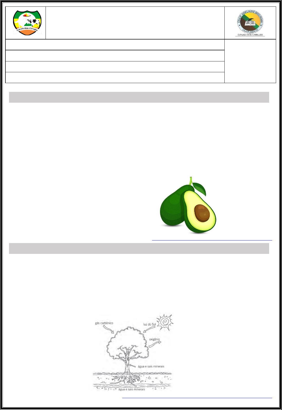 <p>PREFEITURA MUNICIPAL DE CANAà DOS CARAJÁS</p><p>SECRETARIA MUNICIPAL DE EDUCAÇÃO – SEMED</p><p>EMEIF. ADELAIDE MOLINARI</p><p>Aluno(a): Avaliação:</p><p>Atividades:</p><p>Média Geral:</p><p>Professor(a):</p><p>Data: / /2024 Ano Escolar: 2º Turma: Turno:</p><p>Avaliação de Ciências - 1º Bimestre</p><p>QUESTÃO 01</p><p>(EF02CI06) CADA TIPO DE PLANTA APRESENTA SEU PRÓPRIO CICLO DE VIDA, SENDO</p><p>ASSIM, ALGUMAS DE DESENVOLVEM MUITO RÁPIDO OU DEMORAM BASTANTE PARA</p><p>CRESCER. A MAIOR PARTE DAS PLANTAS NASCE A PARTIR DE UMA SEMENTE. POR</p><p>EXEMPLO, O CAROÇO DO ABACATE AO SER COLOCADO SOBRE O SOLO, NELE SE</p><p>DESENVOLVE ATÉ DAR ORIGEM AO FRUTO ABACATEIRO.</p><p>COM BASE NA LEITURA DO TEXTO MARQUE A ALTERNATIVA CORRETA.</p><p>EM PLANTAS COMO O ABACATE , POR EXEMPLO, AS SEMENTES PODEM DAR</p><p>ORIGEM: (0,5)</p><p>a) ( ) ÀS FOLHAS.</p><p>b) ( ) A OUTRAS FLORES.</p><p>c) ( ) AO FRUTO.</p><p>d) ( ) À RAIZ.</p><p>https://pt.vecteezy.com/arte-vetorial/206768-ilustracao-de-abacate</p><p>QUESTÃO 02</p><p>(EF02CI06) COMO TODO SER VIVO AS PLANTAS PRECISAM SE ALIMENTAR. E A</p><p>ALIMENTAÇÃO DAS PLANTAS OCORRE NUM PROCESSO MUITO INTERESSANTE.</p><p>ENQUANTO PARA NOS ALIMENTARMOS PRECISAMOS INGERIR ALIMENTOS, AS</p><p>PLANTAS PRODUZEM SEU PRÓPRIO ALIMENTO.</p><p>PARA ISSO, ELAS SÓ PRECISAM DE LUZ SOLAR, AR, ÁGUA E SAIS MINERAIS DO</p><p>AMBIENTE. ESSE PROCESSO PARA OBTER SEU PRÓPRIO ALIMENTO É CHAMADO DE</p><p>FOTOSSÍNTESE.</p><p>https://drive.google.com/drive/u/0/folders/1dlbW7T-hJr9vCLSCLXfwZDj0Ob5yYPkI</p><p>https://pt.vecteezy.com/arte-vetorial/206768-ilustracao-de-abacate</p><p>https://drive.google.com/drive/u/0/folders/1dlbW7T-hJr9vCLSCLXfwZDj0Ob5yYPkI</p><p>QUAIS OS ALIMENTOS QUE AS PLANTAM NECESSITAM PARA OBTER SEU PRÓPRIO</p><p>ALIMENTO:</p><p>a) ( ) CARNE.</p><p>b) ( ) LUZ SOLAR, AR, ÁGUA E SAIS MINERAIS .</p><p>c) ( ) ARROZ.</p><p>d) ( ) FEIJÃO.</p><p>QUESTÃO 03</p><p>(EF02CI06) CADA SER VIVO É FORMADO POR ÓRGÃOS QUE REALIZAM UMA FUNÇÃO.</p><p>SEU PULMÃO, SEU CORAÇÃO, SEUS OLHOS, SEU ESTÔMAGO, CADA UM DESSES</p><p>ÓRGÃO REALIZA UMA FUNÇÃO PARA TE MANTER VIVO E COM AS PLANTAS OCORRE</p><p>O MESMO.</p><p>QUAL A FUNÇÃO DA RAIZ: (0,5)</p><p>a) ( ) FIXAR A PLANTA NO SOLO. ALÉM DISSO, ABSORVE A ÁGUA E AS</p><p>SUBSTÂNCIAS MINERAIS QUE SERÃO UTILIZADOS PARA A PLANTA SE MANTER</p><p>VIVA.</p><p>b) ( ) USADAS NO PROCESSO DE FOTOSSÍNTES</p><p>c) ( ) ONDE ENCONTRAM OS ÓRGÃOS REPRODUTIVOS DAS PLANTAS</p><p>d) ( ) DAR SUSTENTAÇÃO A PLANTA.</p><p>QUESTÃO 04</p><p>(EF02CI06) VOCÊ SABIA QUE AS PLANTAS SÃO SERES VIVOS? ISSO MESMO, ELAS</p><p>NASCEM, CRESCEM, PODEM SE REPRODUZIR E MORREM.</p><p>MARQUE A ALTERNATIVA CORRETA: (0,5)</p><p>a) ( ) AS FLORES DA PLANTA SÓ SERVEM PARA ENFEITÁ-LA.</p><p>b) ( ) AS PLANTAS SÃO SERES VIVOS.</p><p>c) ( ) PARA SE ALIMENTAR AS PLANTAS PRECISAM CAÇAR OUTRAS</p><p>PLANTAS.</p><p>d) ( ) AS RAÍZES NÃO FIXAM A PLANTA NO SOLO.</p><p>QUESTÃO 05</p><p>(EF02CI04) PARA FAZER ALGUNS OBJETOS O HOMEM UTILIZA MATERIAIS RETIRADOS</p><p>DA NATUREZA.</p><p>QUAL MATERIAL FOI UTILZADO PARA FABRICAR A CADEIRA: (0,5)</p><p>file:///C:/Users/G/Documents/2024/Quadro%20de%20habilidade%202024/1%C2%BA%20ano/2%C2%B0%20ano%20(1).pdf</p><p>e) ( ) MADEIRA</p><p>f) ( ) CIMENTO</p><p>g) ( ) ALGODÃO</p><p>h) ( ) ALUMINIO</p><p>QUESTÃO 06</p><p>(EF02CI04) O PLANETA EM QUE VIVEMOS, A TERRA, ESTÁ REPLETA DE SERES VIVOS</p><p>COM ENORME DIVERSIDADE. ENTRE ELES ESTÃO OS ANIMAIS , QUE PODEM SER</p><p>SEPARADOS POR GRUPOS E SE DIFERENCIAM POR LOCOMOÇÃO, ALIMENTAÇÃO,</p><p>REPRODUÇÃO, HABITAT, ETC.</p><p>OS ANIMAIS MAMIFEROS SÃO OS QUE MAMAM.</p><p>OBSERVE OS ANIMAIS ABAIXO E PINTE OS MAMÍFEROS. (0,5)</p><p>https://i0.wp.com/miriamveiga.com.br/wp-content/uploads/2021/07/26.07-Ciencias-Animais-mamiferos-folha-1.jpg?ssl=1</p><p>QUESTÃO 07</p><p>OS ANIMAIS EM EXTINÇÃO</p><p>file:///C:/Users/G/Documents/2024/Quadro%20de%20habilidade%202024/1º%20ano/2°%20ano%20(1).pdf</p><p>https://i0.wp.com/miriamveiga.com.br/wp-content/uploads/2021/07/26.07-Ciencias-Animais-mamiferos-folha-1.jpg?ssl=1</p><p>EXTINÇÃO SIGNIFICA DESAPARECER PARA SEMPRE. SAIBA QUE O DESAPARECIMENTO</p><p>DE UMA ESPÉCIE AFETA A VIDA DO PLANETA. O SER HUMANO TEM UMA GRANDE</p><p>RESPONSABILIDADE NÃO SÓ PELA EXTINÇÃO DOS ANIMAIS, MAS TAMBÉM PELA</p><p>DESTRUIÇÃO DAS MATAS, DOS MANGUES, DOS LITORAIS E DE OUTROS AMBIENTES.</p><p>(EF02CI04) ENCONTRE NO DIAGRAMA OS NOMES DESTES ANIMAIS BRASILEIROS</p><p>QUE SE ENCONTRAM EM RISCO DE EXTINÇÃO. (1,0)</p><p>https://i0.wp.com/miriamveiga.com.br/wp-content/uploads/2021/07/26.07-Ciencias-Animais-Extinçao-folha-1.jpg?ssl=1</p><p>QUESTÃO 08</p><p>https://i0.wp.com/miriamveiga.com.br/wp-content/uploads/2021/07/26.07-Ciencias-Animais-Extinçao-folha-1.jpg?ssl=1</p><p>(EF02CI04) OS ANIMAIS SÃO CHAMADOS DE INVERTEBRADOS QUANDO NÃO</p><p>POSSUEM COLUNA VERTEBRAL, NEM OUTROS OSSOS.</p><p>PODEM SER ENCONTRADOS NOS MAIS VARIADOS AMBIENTES: SOLO, SUBSOLO,</p><p>PROFUNDEZAS DE MARES E RIOS, NO AR E ATÉ DENTRO DE OUTROS SERES</p><p>VIVOS.</p><p>OBSERVE OS ANIMAIS ABAIXO:</p><p>f ile:///C:/Users/G/Documents/2024/Quadro%20de%20habilidade%202024/1%C2%BA%20ano/2%C2%B0%20ano%20(1).pdf</p><p>QUAIS DELES SÃO ANIMAIS INVERTEBRADOS: (1,0)</p><p>________________________________________________________________________</p><p>________________________________________________________________________</p><p>QUESTÃO 09</p><p>(EF02CI04) QUAL DOS ANIMAIS DA QUESTÃO 08 QUE VOA? (1,0)</p><p>________________________________________________________________________</p><p>QUESTÃO 10</p><p>(EF02CI05) A ÁGUA É MUITO IMPORTANTE PARA A SOBREVIVÊNCIA DOS SERES</p><p>VIVOS.</p><p>ANALISANDO AS IMAGENS ABAIXO ESCREVA O PORQUÊ A ÁGUA É IMPORTANTE.</p><p>(1,0)</p><p>file:///C:/Users/G/Documents/2024/Quadro%20de%20habilidade%202024/1º%20ano/2°%20ano%20(1).pdf</p><p>___________________________________________________________________________</p><