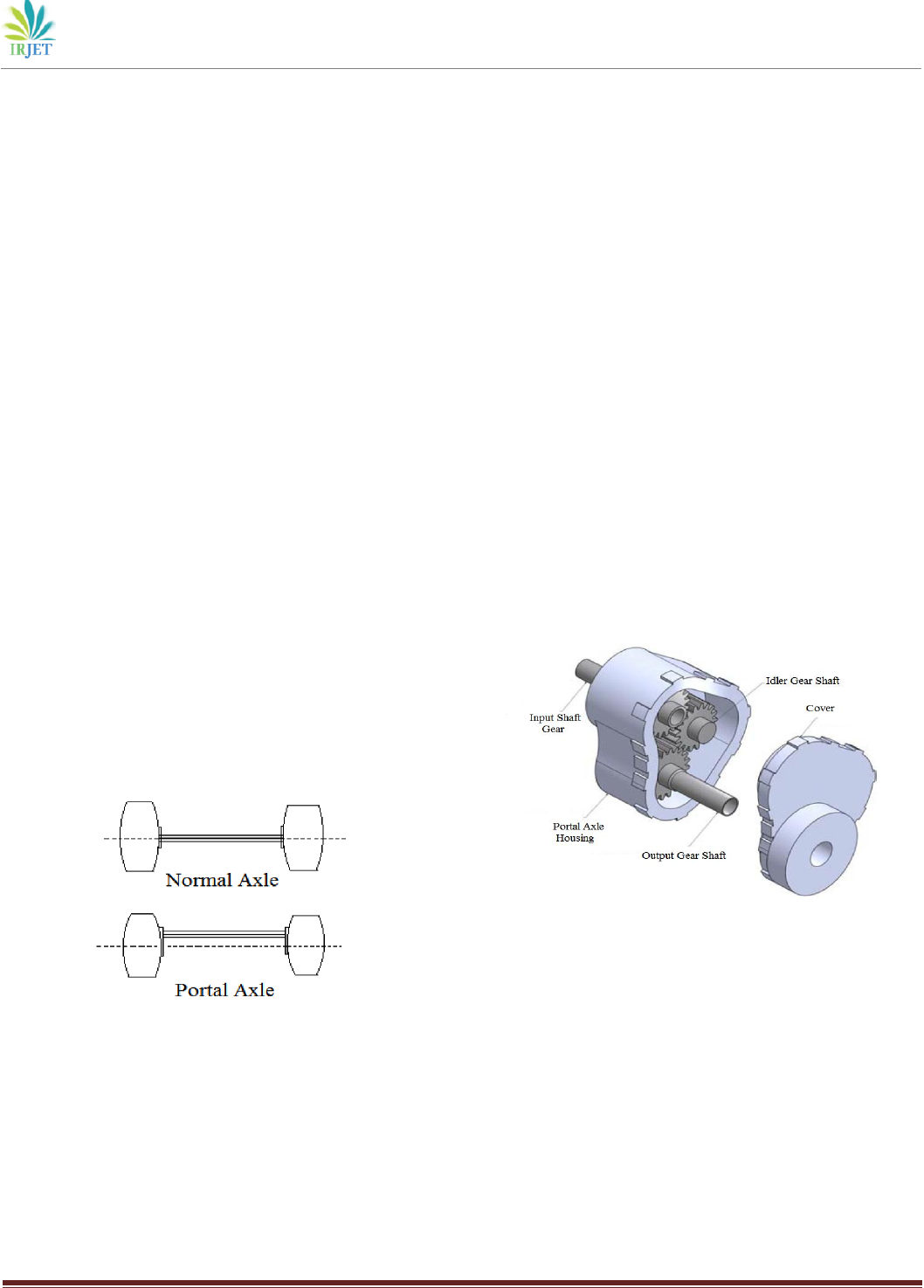 <p>International Research Journal of Engineering and Technology (IRJET) e-ISSN: 2395 -0056</p><p>Volume: 03 Issue: 04 | April-2016 www.irjet.net p-ISSN: 2395-0072</p><p>© 2016, IRJET | Impact Factor value: 4.45 | ISO 9001:2008 Certified Journal | Page 2605</p><p>Finite Element Analysis of a Portal Axle Gear Train using</p><p>Metallic and Composite Spur Gears</p><p>Umesh Shinde1, Deepak C Patil2</p><p>1Dept of Mechanical Engineering, KLE Dr.MSSCET Belagavi, Karnataka, India</p><p>2Professor, Dept of Mechanical Engineering, KLE Dr.MSSCET Belagavi, Karnataka, India</p><p>---------------------------------------------------------------------***---------------------------------------------------------------------</p><p>Abstract - The portal axle is generally a gearbox that is</p><p>designed for off road driving conditions. It is installed between</p><p>the wheel and the axle shaft to give higher ground clearance</p><p>to the vehicle. The modeling and simulation of spur gears in</p><p>portal axle is important to predict the actual motion behavior.</p><p>In this study, static analysis of portal axle is simulated using</p><p>finite element method (FEM) for both metallic and composite</p><p>gears. The three gear trains being analyzed are gear train</p><p>without idler gear, one idler gear and two idler gears. FEM</p><p>static stress analysis is also simulated on three different gear</p><p>trains to study the gear teeth bending stress and contact stress</p><p>behavior of the gear trains. This methodology serves as a novel</p><p>approach for gear train design evaluation, and the study of</p><p>gear stress behavior in gear train which is needed in the small</p><p>workshop scale industries.</p><p>Key Words: Portal axle, Spur gears, Stress analysis, Gear</p><p>train, Metallic and Composite Gears.</p><p>1.INTRODUCTION</p><p>Fig 1: Normal and Portal Axle</p><p>The portal axle is a gearbox unit with at least two</p><p>gears (input and output gear) combined to give greater off-</p><p>set between the input gear and output gear. Portal axles are</p><p>commonly installed on four wheel-drive (4WD) vehicles for</p><p>driving on off-road conditions and to gain additional ground</p><p>clearance to protect underneath components from damage.</p><p>Fig. 1 shows the comparison between a normal vehicle and a</p><p>vehicle with a portal axle.</p><p>The modeling and simulation of such all-terrain</p><p>vehicles are important to predict the actual motion behavior.</p><p>When designing gears for portal axle, consideration of the</p><p>gear train dynamic response is critical. In this situation, the</p><p>structural stress level may become very high and generate</p><p>structural deficiencies. The present work is carried taking</p><p>metallic and composite gears. For metallic cast steel is</p><p>considered and for composite carbon fiber epoxy is taken for</p><p>the analysis purpose. Positioning of each gear in a gear train</p><p>to the desired position for FEM simulation requires accurate</p><p>contact settings, constraints and positioning technique. The</p><p>critical stress calculated using FEM is recorded at the input</p><p>gear shaft and output gear shaft and simulated for three</p><p>different gear trains. Finally, discussions and conclusions are</p><p>pointed out from the analysis of this work.</p><p>2. MODEL OF GEAR SHAFT AND IDLER GEAR</p><p>Fig. 2. Gear shafts assembly of the portal axle unit</p><p>Fig. 2 shows the assembly model of the three-gear</p><p>system of the portal axle unit. In this analysis, the model of</p><p>the input gear shaft, output gear shaft, and idler gear is only</p><p>considered in FEM analysis to save computing time. This</p><p>ignores the interaction of the housing fitting and the</p><p>bearings fitting of the portal axle. The output shaft and input</p><p>shaft of the portal axle are modeled as the same gear shaft</p><p>which shares the same design parameters. The gear shaft is</p><p>modeled using the Solid Works 2014. The length of the shaft</p><p>is 200 mm and the diameter is 30 mm. The idler gear, which</p><p>is meshed between the input gear and output gear, is model</p><p>with the same shaft diameter and having a shorter length of</p><p>100 mm. The idler gear is positioned between the input gear</p><p>and output gear to offset the vertical distance and allow only</p><p>one directional rotation.</p><p>International Research Journal of Engineering and Technology (IRJET) e-ISSN: 2395 -0056</p><p>Volume: 03 Issue: 04 | April-2016 www.irjet.net p-ISSN: 2395-0072</p><p>© 2016, IRJET | Impact Factor value: 4.45 | ISO 9001:2008 Certified Journal | Page 2606</p><p>All gears (gear shaft and idler gear) are modeled</p><p>following the same gear design parameters and material</p><p>properties for both metallic and composite gears as shown in</p><p>Table 2.3 and Table 2.4. The effects of gear case hardening,</p><p>gear tempering and other gear heat treatment process are</p><p>not considered in this study. Therefore, only the material of</p><p>the gear is taken account into the analysis in FEM.</p><p>Table 2.1: Gear Shaft Parameters</p><p>Gear type Standard involute,</p><p>full depth teeth</p><p>Number of teeth (N) 20</p><p>Pitch diameter (d) 80 mm</p><p>Module (M) 4.00 mm</p><p>Diametral pitch ( pd ) 250 mm-1</p><p>Pressure angle ( ) 20°</p><p>Addendum (mm) 1.0 M</p><p>Dedendum (mm) 1.25 M</p><p>Face width (bw) 40 mm</p><p>2.1 Model of the three different Gear Trains</p><p>Table 2.2: Three different gear train</p><p>There are three different gear train designs</p><p>considered in the interest of this research, and three</p><p>different gear trains are assembled as shown in Table 2.2 so</p><p>that FEM simulation can be carried out separately. A gear</p><p>train with no idler gear which is made up of two identical</p><p>gear shafts is constrained to mesh with one and another. The</p><p>gear shafts are set at center distance 80 mm and are aligned</p><p>vertically with reference to both the gear shaft 