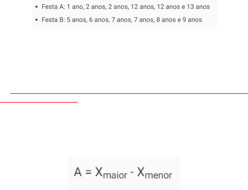 <p>Estatística – Aula 03</p><p>Prof. Daniel Rocha de Almeida</p><p>● Medidas de Dispersão</p><p>Medidas de dispersão são parâmetros estatísticos usados para determinar o</p><p>grau de variabilidade dos dados de um conjunto de valores.</p><p>A utilização desses parâmetros tornam a análise de uma amostra mais confiável,</p><p>visto que as variáveis de tendência central (média, mediana, moda) muitas vezes</p><p>escondem a homogeneidade ou não dos dados.</p><p>Por exemplo, vamos considerar que um animador de festas infantis selecione as</p><p>atividades de acordo com a média das idades das crianças convidadas para uma</p><p>festa. Vamos considerar as idades de dois grupos de crianças que irão participar</p><p>de duas festas diferentes:</p><p>Em ambos os casos, a média é igual a 7 anos de idade. Entretanto, ao observar</p><p>as idades dos participantes podemos admitir que as atividades escolhidas sejam</p><p>iguais?</p><p>Portanto, neste exemplo, a média não é uma medida eficiente, pois não indica</p><p>o grau de dispersão dos dados.</p><p>As medidas de dispersão mais usadas são: amplitude, variância, desvio padrão</p><p>e coeficiente de variação.</p><p>● Amplitude</p><p>Essa medida de dispersão é definida como a diferença entre a maior e a menor</p><p>observação de um conjunto de dados, isto é:</p><p>Por ser uma medida que não leva em consideração como os dados estão</p><p>efetivamente distribuídos, não é muito utilizada.</p><p>Exemplo</p><p>O setor de controle de qualidade de uma empresa seleciona ao acaso peças de</p><p>um lote. Quando a amplitude das medidas dos diâmetros das peças ultrapassa</p><p>0,8 cm o lote é rejeitado.</p><p>Considerando que em um lote foram encontrados os seguintes valores 2,1 cm;</p><p>2,0 cm; 2,2 cm; 2,9 cm; 2,4 cm, esse lote foi aprovado ou rejeitado?</p><p>Solução</p><p>Para calcular a amplitude, basta identificar o menor e o maior valores, que neste</p><p>caso, são 2,0 cm e 2,9 cm. Calculando a amplitude, temos:</p><p>A = 2,9 - 2 = 0,9 cm</p><p>Nesta situação o lote foi rejeitado, pois a amplitude ultrapassou o valor limite.</p><p>● Variância</p><p>A variância é determinada pela média dos quadrados das diferenças entre cada</p><p>uma das observações e a média aritmética da amostra. O cálculo é feito com</p><p>base na seguinte fórmula:</p><p>Sendo,</p><p>V: variância</p><p>xi: valor observado</p><p>MA: média aritmética da amostra</p><p>n: número de dados observados</p><p>Exemplo</p><p>Considerando as idades das crianças das duas festas indicadas anteriormente,</p><p>vamos calcular a variância desses conjuntos de dados.</p><p>Festa A</p><p>Dados: 1 ano, 2 anos, 2 anos, 12 anos, 12 anos e 13 anos.</p><p>Média:</p><p>Variância:</p><p>Festa B</p><p>Dados: 5 anos, 6 anos, 7 anos, 7 anos, 8 anos e 9 anos.</p><p>Média:</p><p>Variância:</p><p>Observe que apesar da média ser igual, o valor da variância é bem diferente,</p><p>ou seja, os dados do primeiro conjunto são bem mais heterogêneos.</p><p>● Desvio Padrão</p><p>O desvio padrão é definido como a raiz quadrada da variância. Desta forma,</p><p>a unidade de medida do desvio padrão será a mesma da unidade de medida dos</p><p>dados, o que não acontece com a variância.</p><p>Assim, o desvio padrão é encontrado fazendo-se:</p><p>Quando todos os valores de uma amostra são iguais, o desvio padrão é igual a</p><p>0. Sendo que, quanto mais próximo de 0, menor é a dispersão dos dados.</p><p>Exemplo</p><p>Considerando ainda o exemplo anterior, vamos calcular o desvio padrão para as</p><p>duas situações:</p><p>Agora, sabemos que a variação das idades do primeiro grupo em relação a</p><p>média é de aproximadamente 5 anos, enquanto que a do segundo grupo é de</p><p>apenas 1 ano.</p><p>● Coeficiente de Variação</p><p>Para encontrar o coeficiente de variação, devemos multiplicar o desvio padrão</p><p>por 100 e dividir o resultado pela média. Essa medida é expressa em</p><p>porcentagem.</p><p>O coeficiente de variação é utilizado quando precisamos comparar</p><p>variáveis que apresentam médias diferentes.</p><p>Como o desvio padrão representa o quanto os dados estão dispersos em</p><p>relação a uma média, ao comparar amostras com médias diferentes, a sua</p><p>utilização pode gerar erros de interpretação.</p><p>Desta forma, ao confrontar dois conjuntos de dados, o mais homogêneo será</p><p>aquele que apresentar menor coeficiente de variação.</p><p>Exemplo</p><p>Um professor aplicou uma prova para duas turmas e calculou a média e o desvio</p><p>padrão das notas obtidas. Os valores encontrados estão na tabela abaixo.</p><p>Com base nesses valores, determine o coeficiente de variação de cada turma e</p><p>indique a turma mais homogênea.</p><p>Solução</p><p>Calculando o coeficiente de variação de cada turma, temos:</p><p>Desta forma, a turma mais homogênea é a turma 2, apesar de apresentar maior</p><p>desvio padrão.</p><p>Exercícios Resolvidos</p><p>1. Em um dia de verão as temperaturas registradas em uma cidade ao longo de</p><p>um dia estão apresentadas na tabela abaixo:</p><p>Com base na tabela, indique o valor da amplitude térmica registrada neste dia.</p><p>Solução</p><p>Para encontrar o valor da amplitude térmica, devemos subtrair o valor mínimo da</p><p>temperatura do valor máximo. Pela tabela, identificamos que a menor</p><p>temperatura foi 16 ºC e a maior 27 ºC.</p><p>Desta forma, a amplitude será igual a:</p><p>A = 27 - 16 = 11 ºC</p><p>2. O treinador de uma equipe de voleibol resolveu medir a altura dos jogadores</p><p>da sua equipe e encontrou os seguintes valores: 1,86 m; 1,97 m; 1,78 m; 2,05</p><p>m; 1,91 m; 1,80 m. Em seguida, calculou a variância e o coeficiente de variação</p><p>das alturas. Os valores aproximados foram respectivamente:</p><p>a) 0,08 m2 e 50%</p><p>b) 0,3 m e 0,5%</p><p>c) 0,0089 m2 e 4,97%</p><p>d) 0,1 m e 40%</p><p>Solução</p>