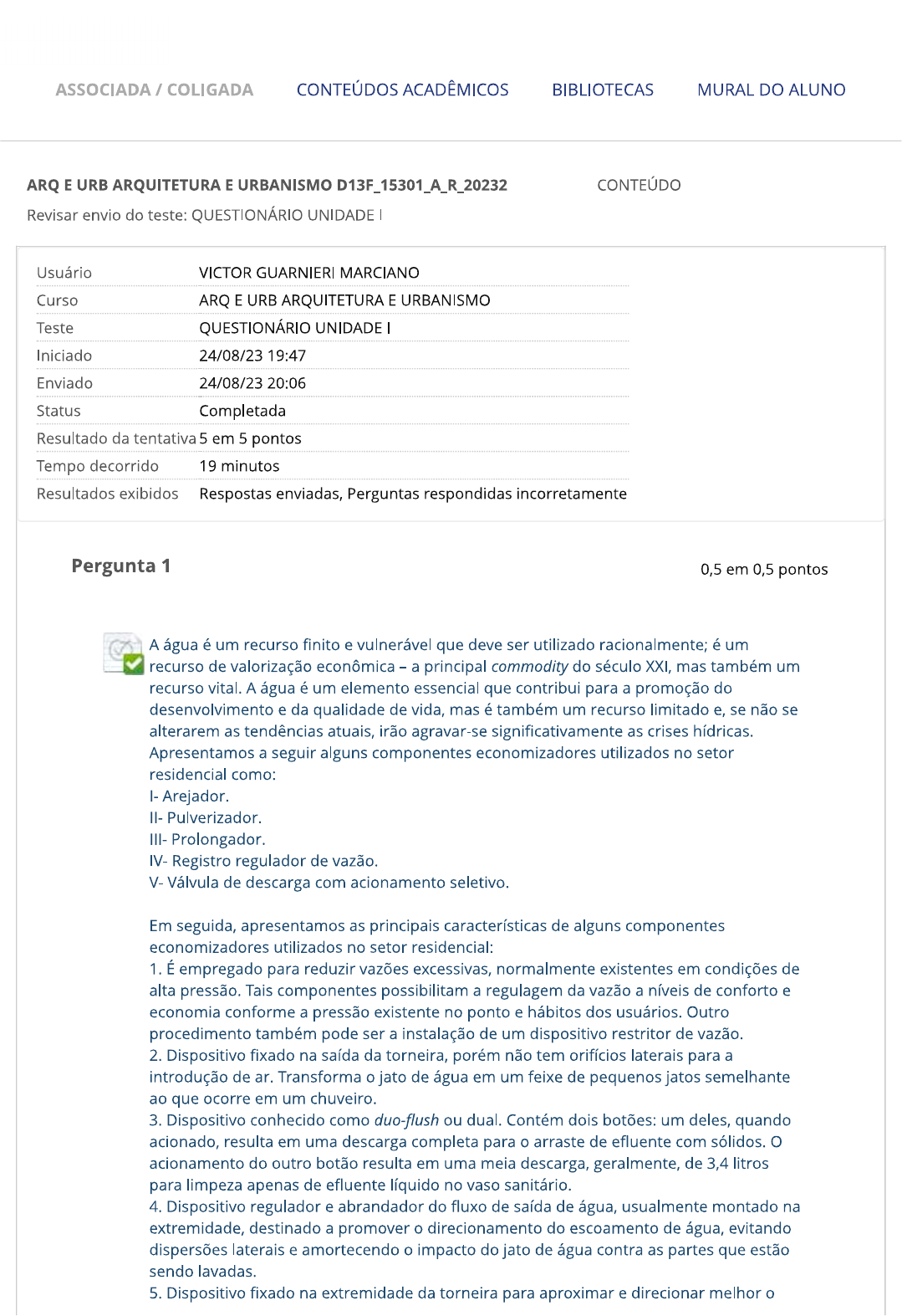 <p>ASSOCIADA / COLIGADA CONTEÚDOS ACADÊMICOS BIBLIOTECAS MURAL DO ALUNO ARQ E URB ARQUITETURA E URBANISMO D13F_15301_A_R_20232 CONTEÚDO Revisar envio do teste: QUESTIONÁRIO UNIDADE Usuário VICTOR GUARNIERI MARCIANO Curso ARQ E URB ARQUITETURA E URBANISMO Teste QUESTIONÁRIO UNIDADE I Iniciado 24/08/23 19:47 Enviado 24/08/23 20:06 Status Completada Resultado da tentativa 5 em 5 pontos Tempo decorrido 19 minutos Resultados exibidos Respostas enviadas, Perguntas respondidas incorretamente Pergunta 1 0,5 em 0,5 pontos A água é um recurso finito e vulnerável que deve ser utilizado racionalmente; é um recurso de valorização econômica a principal commodity do século XXI, mas também um recurso vital. A água é um elemento essencial que contribui para a promoção do desenvolvimento e da qualidade de vida, mas é também um recurso limitado e, se não se alterarem as tendências atuais, irão agravar-se significativamente as crises hídricas. Apresentamos a seguir alguns componentes economizadores utilizados no setor residencial como: Arejador. II- Pulverizador. III- Prolongador. IV- Registro regulador de vazão. V- Válvula de descarga com acionamento seletivo. Em seguida, apresentamos as principais características de alguns componentes economizadores utilizados no setor residencial: 1. É empregado para reduzir vazões excessivas, normalmente existentes em condições de alta pressão. Tais componentes possibilitam a regulagem da vazão a níveis de conforto e economia conforme a pressão existente no ponto e hábitos dos usuários. Outro procedimento também pode ser a instalação de um dispositivo restritor de vazão. 2. Dispositivo fixado na saída da torneira, porém não tem orifícios laterais para a introdução de ar. Transforma o jato de água em um feixe de pequenos jatos semelhante ao que ocorre em um chuveiro. 3. Dispositivo conhecido como duo-flush ou dual. Contém dois botões: um deles, quando acionado, resulta em uma descarga completa para o arraste de efluente com sólidos. acionamento do outro botão resulta em uma meia descarga, geralmente, de 3,4 litros para limpeza apenas de efluente líquido no vaso 4. Dispositivo regulador e abrandador do fluxo de saída de água, usualmente montado na extremidade, destinado a promover o direcionamento do escoamento de água, evitando dispersões laterais e amortecendo o impacto do jato de água contra as partes que estão sendo lavadas. 5. Dispositivo fixado na extremidade da torneira para aproximar e direcionar melhor o</p><p>jato ao objeto a ser lavado. Faça a correlação entre os principais componentes economizadores de água e suas principais características, assinalando a alternativa correta: Resposta Selecionada: I-4; II-2; III-5; IV-1; V-3. C. Pergunta 2 0,5 em 0,5 pontos A NBR 6492, da ABNT Representação de projetos de arquitetura, fixa as condições exigíveis para representação gráfica de projetos de arquitetura, visando à sua boa compreensão. Leia atentamente as informações contidas nas colunas "A" e "B" e, em seguida, assinale a alternativa que reúne as correspondências corretas entre as informações nelas contidas. Coluna A I. Planta que compreende o projeto como um todo, contendo, além do projeto de arquitetura, as informações necessárias dos projetos complementares, tais como movimento de terra, arruamento; redes hidráulica, elétrica e de drenagem, entre outros. II. Vista superior do plano secante horizontal, localizado a, aproximadamente, 1,50 m do piso em referência. A altura desse plano pode ser variável para cada projeto de maneira a representar todos os elementos considerados necessários. III. Plano secante vertical que divide a edificação em duas partes, seja no sentido longitudinal, seja no transversal. IV. Planta que compreende partido arquitetônico como um todo, em seus múltiplos aspectos. Pode conter informações específicas em função do tipo e do porte do programa, assim como para a finalidade a que se destina. V. Representação gráfica de planos internos ou de elementos da edificação. Coluna B 1. Planta de situação. 2. Corte. 3. Elevação. 4. Planta de edificação. 5. Planta de locação (ou implantação). A sequência correta dessa associação é: Resposta Selecionada: e. Pergunta 3 0,5 em 0,5 pontos A Resolução CAU/BR n° 21 define os 7 principais grupos de atividades em Arquitetura e Urbanismo: 1. Projeto; 2. Execução; 3. Gestão; 4. Meio Ambiente e Planejamento Regional e Urbano; 5. Ensino e Pesquisa; 6. Atividades Especiais (laudos, vistorias, perícias, consultorias e assistência técnica, entre outros) e 7. Engenharia de Segurança do Trabalho (disponível apenas para especialistas na área). De acordo com a Lei n° 12.378/2010, a</p><p>emissão do(a) é obrigatória para a realização de qualquer trabalho de competência privativa de arquitetos e urbanistas ou compartilhada com outras profissões regulamentadas. Qual alternativa preenche corretamente a lacuna? Resposta Selecionada: b. Registro de Responsabilidade Técnica (RRT). Pergunta 4 0,5 em 0,5 pontos O processo projetual tem passado nas últimas décadas por contínuas transformações. Saímos da representação dos projetos por meio de desenhos bidimensionais a lápis e canetas a nanquim, para desenhos também bidimensionais, porém gerados em meio eletrônico por intermédio de computadores, utilizando softwares para CAD Computer Aided Design. arquiteto e professor William J. Mitchell foi diretor do grupo de pesquisa Smart Cities do Media Lab e diretor da School of Architecture and Planning, do MIT Massachussets Institute of Technology, instituição norte-americana de ensino e pesquisa; e demonstrou que os sofisticados recursos da computação gráfica não deveriam ficar restritos à questão da representação gráfica dos produtos projetados, mas precisavam se estender a todo o processo, desde a fase de concepção até a execução do edifício e sua posterior gestão, util