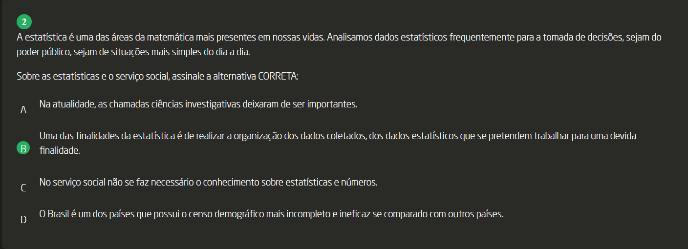 <p>2 A estatística é uma das áreas da matemática mais presentes em nossas vidas. Analisamos dados estatísticos frequentemente para a tomada de decisões, sejam do poder público, sejam de situações mais simples do dia a dia. Sobre as estatísticas e serviço social, assinale a alternativa CORRETA: A Na atualidade, as chamadas ciências investigativas deixaram de ser importantes. Uma das finalidades da estatística é de realizar a organização dos dados coletados, dos dados estatísticos que se pretendem trabalhar para uma devida B finalidade. No serviço social não se faz necessário conhecimento sobre estatísticas e números. D Brasil é um dos países que possui censo demográfico mais incompleto e ineficaz se comparado com outros países.</p>