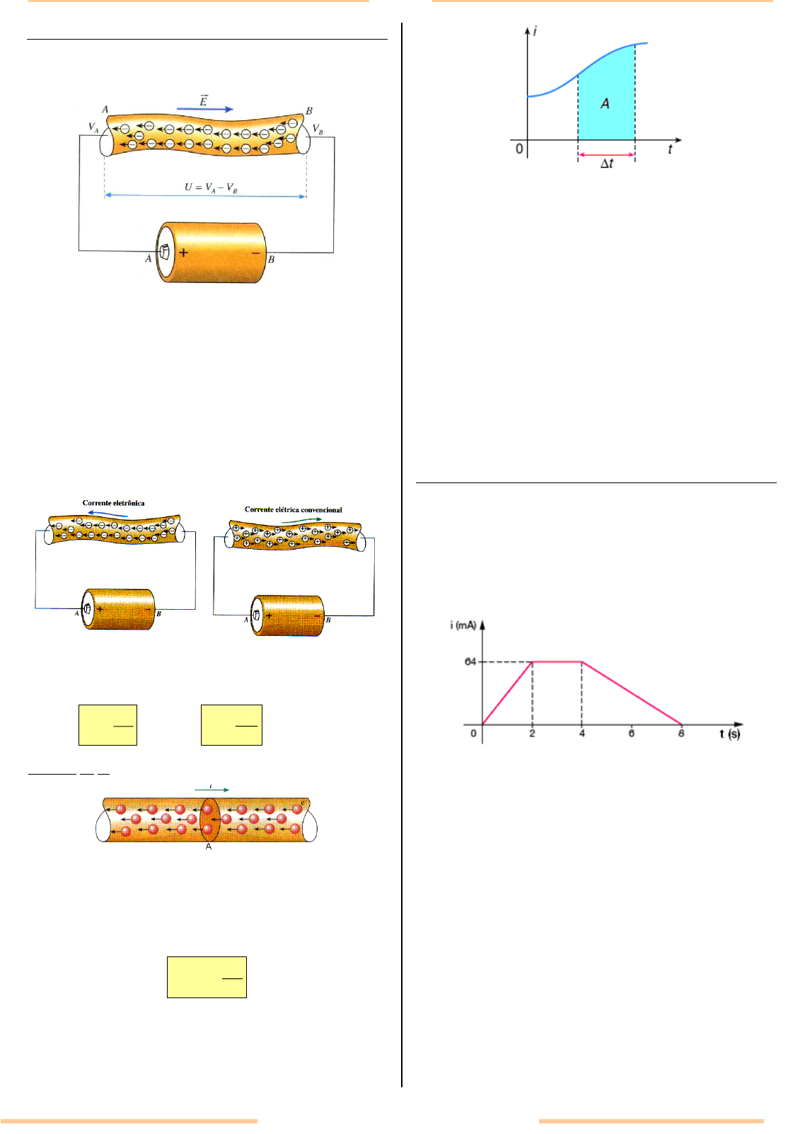 <p>3º Ano</p><p>IFSul – Cmpus Visconde da Graça 1</p><p>9- CORRENTE ELÉTRICA</p><p>9.1- CONCEITO</p><p>É o movimento ordenado de cargas elétricas de um</p><p>condutor.</p><p> Condutor Metálico: os portadores de carga são os elétrons</p><p>livres (metais e grafite).</p><p> Condutor Líquido: os portadores de carga são os íons</p><p>positivos e negativos (soluções eletolíticas).</p><p> Condutor Gasoso: os portadores de cargas podem ser íons</p><p>positivos, íons negativos e elétrons livres (gases ionizados).</p><p>9.2 - SENTIDO DA CORRENTE ELÉTRICA (CON-</p><p>VENCIONAL)</p><p>Convencionou-se para o sentido da corrente elétrica o</p><p>sentido contrário ao do movimento das cargas negativas livres.</p><p>É no sentido do campo elétrico E</p><p></p><p>.</p><p>9.3 - INTENSIDADE DA CORRENTE ELÉTRICA (i)</p><p>A intensidade da corrente média, im, através de uma</p><p>secção A do condutor, é definida pela relação:</p><p>t</p><p>q</p><p>im</p><p></p><p></p><p> ou</p><p>t</p><p>e.n</p><p>im</p><p></p><p></p><p>Unidade no SI: Ampère (A)</p><p>Quando a corrente elétrica mantém sentido invariável ela é</p><p>denominada corrente contínua (CC). Se a corrente elétrica</p><p>apresentar sentido e intensidade invariáveis ela é chamada</p><p>corrente contínua constante. Logicamente, numa corrente</p><p>contínua constante devemos ter a intensidade da corrente</p><p>instantânea igual a intensidade da corrente média, isto é:</p><p>t</p><p>q</p><p>ii m</p><p></p><p></p><p></p><p>A área sombreada do diagrama i t corresponde ã</p><p>carga total Q que atravessa uma secção S do condutor no</p><p>intervalo de tempo t.</p><p>9.4- EFEITOS DA CORRENTE ELÉTRICA</p><p> Efeito térmico (Joule): qualquer condutor sofre um</p><p>aquecimento ao ser percorrido por uma corrente elétrica.</p><p> Efeito luminoso: em determinadas condições a passagem da</p><p>corrente elétrica através de um gás rarefeito faz com que ele</p><p>emita luz.</p><p> Efeito magnético: um condutor, percorrido por corrente</p><p>elétrica, cria, na região próxima a ele, um campo magnético.</p><p> Efeito químico: uma solução eletrolítica sofre decomposição,</p><p>quando atravessada por uma corrente elétrica.</p><p> Efeito fisiológico: consiste na ação da corrente elétrica sobre</p><p>o corpo humano (animal), causando sensações dolorosas e</p><p>contrações musculares.</p><p>EXERCÍCIOS DE AULA</p><p>1. (VUNESP) Mediante estímulo, 2 . 10</p><p>5</p><p>íons de K</p><p>+</p><p>atravessam a membrana de uma célula nervosa em 1,0 mili-</p><p>segundo. Calcule a intensidade dessa corrente elétrica,</p><p>sabendo-se que a carga elementar é 1,6 . 10</p><p>-19</p><p>C.</p><p>2. (IME-RJ) A intensidade da corrente elétrica em um condutor</p><p>metálico varia, com o tempo, de acordo com o gráfico a seguir.</p><p>Sendo o módulo da carga elementar e = 1,6 . 10</p><p>-19</p><p>C,</p><p>determine:</p><p>a) a carga elétrica que atravessa uma secção do condutor em</p><p>8 s</p><p>b) o número de elétrons que atravessa uma secção do</p><p>condutor durante esse mesmo tempo</p><p>c) a intensidade média da corrente entre os instantes 0 s e 8 s</p><p>3. (PUCSP) Uma lâmpada permanece acesa durante 1 hora,</p><p>sendo percorrida por uma corrente elétrica de intensidade</p><p>igual a 0,5 A. (Carga do elétron = – 1,6 . 10</p><p>– 19</p><p>C)</p><p>a) Qual a carga elétrica que passou por uma secção de seu</p><p>filamento?</p><p>b) Quantos elétrons passaram?</p><p>3º Ano</p><p>IFSul – Cmpus Visconde da Graça 2</p><p>EXERCÍCIOS PROPOSTOS</p><p>1. (ACAFE) Os condutores, cuja corrente se deve,</p><p>exclusivamente, ao movimento de migração de elétrons livres,</p><p>são:</p><p>a) mercúrio - água salgada - alumínio.</p><p>b) gás néon - cobre - alumínio.</p><p>c) gás néon - cobre - água salgada.</p><p>d) alumínio - água pura - cobre.</p><p>e) mercúrio - cobre - alumínio.</p><p>2. (ACAFE) Se uma corrente elétrica de 3A percorre um fio</p><p>durante 2 minutos, a carga elétrica, em C, que atravessou a</p><p>secção reta neste tempo é:</p><p>a) 60</p><p>b) 110</p><p>c) 360</p><p>d) 220</p><p>e) 180</p><p>3. (UFRS) O gráfico representa a intensidade de corrente de</p><p>elétrica i em um fio condutor em função do tempo transcorrido</p><p>t.</p><p>Qual a carga elétrica que passa por uma seção transversal do</p><p>condutor nos cinco primeiros segundos?</p><p>a) 2,0 C</p><p>b) 2,5 C</p><p>c) 4,0 C</p><p>d) 7,0 C</p><p>e) 10,0 C</p><p>4. (UFRS) O gráfico representa a intensidade de corrente</p><p>elétrica i em função do tempo t em dois condutores, X e Y.</p><p>Sendo qx e qy as cargas elétricas que, durante os quatro</p><p>primeiros segundos, passam respectivamente por uma seção</p><p>transversal dos condutores X e Y, qual a diferença qx- qy?</p><p>a) 1 C</p><p>b) 2 C</p><p>c) 3 C</p><p>d) 6 C</p><p>e) 8 C</p><p>5. (UFRS) Uma carga elétrica de 120 coulomb passa</p><p>uniformemente pela seção transversal de um fio condutor</p><p>durante um minuto. Qual a intensidade da corrente elétrica</p><p>nesse condutor?</p><p>a) (1/30) A</p><p>b) (1/2) A</p><p>c) 2 A</p><p>d) 30 A</p><p>e) 120 A</p><p>6. (UFSM) Corrente elétrica, em um condutor metálico, é o</p><p>movimento.</p><p>a) desordenado dos portadores de carga elétrica,</p><p>independente do campo elétrico aplicado.</p><p>b) ordenado dos portadores de carga elétrica, sendo o fluxo</p><p>dos portadores, num determinado sentido espontâneo,</p><p>c) ordenado dos portadores de carga elétrica, sendo o fluxo</p><p>dos portadores, num determinado sentido independente do</p><p>campo elétrico aplicado.</p><p>d) ordenado dos portadores de carga elétrica, sendo o fluxo</p><p>dos portadores, num determinado sentido, dependente do</p><p>campo elétrico aplicado.</p><p>e) instantâneo dos portadores de carga elétrica, sendo o fluxo</p><p>dos portadores, num determinado sentido, dependente do</p><p>campo elétrico apli
