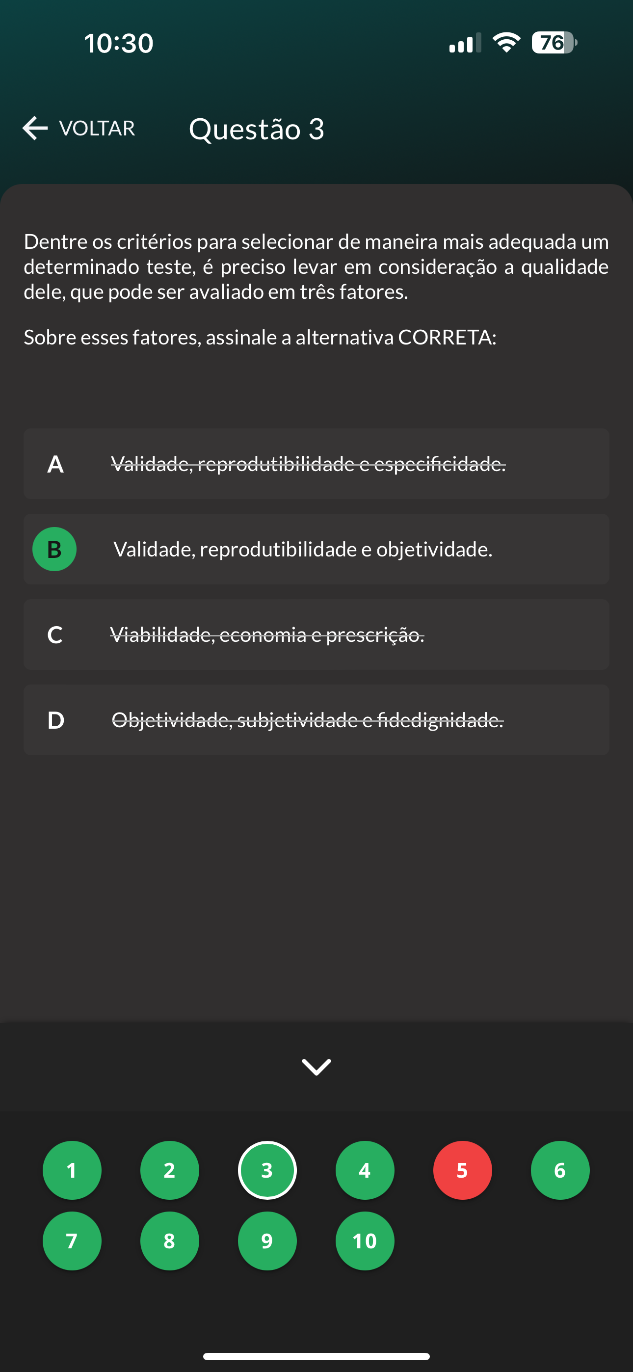 <p>10:30 76 VOLTAR Questão 3 Dentre os critérios para selecionar de maneira mais adequada um determinado teste, é preciso levar em consideração a qualidade dele, que pode ser avaliado em três fatores. Sobre esses fatores, assinale a alternativa CORRETA: A Validade,reprodutibilidade e especificidade. Validade, reprodutibilidade e objetividade. C Viabilidade, economia e D Objetividade, subjetividade e fidedignidade. 1 2 3 4 5 6 7 8 9 10</p>