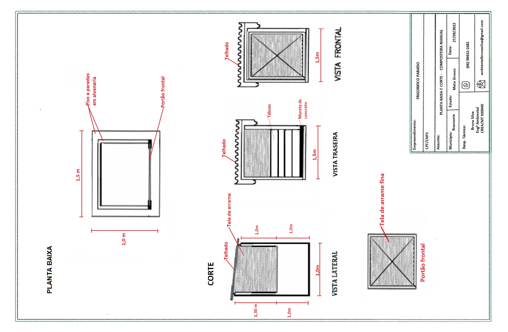 <p>PLANTA BAIXA 1,5 m Piso e paredes em alvenaria 1,0 m Portão frontal CORTE Telhado Telhado Tela de arrame Telhado 1,30 m 1,0m Tábuas 1,0m 1,0m Mureta de concreto 1,0m 1,5m 1,5m VISTA LATERAL VISTA TRASEIRA VISTA FRONTAL Tela de arrame fina Empreendimento: FRIGORIFICO PARAÍSO Portão frontal CPF/CNPJ: Assunto: PLANTA BAIXA E CORTE - COMPOSTEIRA MANUAL Município: Estado: Data: Brasnorte Mato Grosso 27/09/2022 Resp. Técnico: (66) 98432-1682 Bruna Silva Ambiental CREA/MT 039040 ambientalbrunasilva@gmail.com</p>