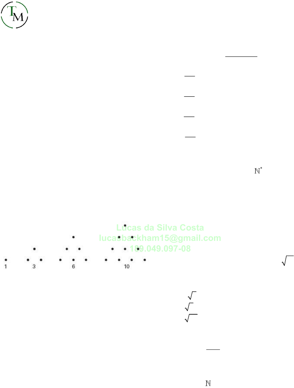 <p>TEOREMA MILITAR</p><p>LISTA 1- FRENTE 2- SEQUÊNCIAS</p><p>PROF. CESAR ANNUNCIATO</p><p>1. Em uma sequência numérica, a soma dos n primeiros</p><p>termos é</p><p>23 2n + com n natural não nulo. O oitavo</p><p>termo da sequência é:</p><p>a) 36 b) 39 c) 41 d) 43 e) 45</p><p>2. Na sequência 1, 3, 7, 15,..., cada termo, a partir do</p><p>segundo, é obtido adicionando-se uma unidade ao</p><p>dobro do anterior. O 13° termo dessa sequência é:</p><p>11</p><p>11</p><p>12</p><p>12</p><p>13</p><p>)2 1</p><p>)2 1</p><p>)2 1</p><p>)2 1</p><p>)2 1</p><p>a</p><p>b</p><p>c</p><p>d</p><p>e</p><p>−</p><p>+</p><p>−</p><p>+</p><p>−</p><p>3. “Números triangulares” são números que podem ser</p><p>representados por pontos arranjados na forma de</p><p>triângulos equiláteros. É conveniente definir 1 como o</p><p>primeiro número triangular. Apresentamos a seguir os</p><p>primeiros números triangulares.</p><p>Se nT representa o n-ésimo número triangular, então</p><p>1 1 2 3 41, 3, 6, 10, 10T T T T T= = = = = , e assim por</p><p>diante. Dado que nT satisfaz a relação 1n nT T n−= + ,</p><p>para n = 2,3,4,..., pode-se deduzir que 100T é igual a:</p><p>a) 5050</p><p>b) 4950</p><p>c) 2187</p><p>d) 1458</p><p>e) 729</p><p>4. Dada a sucessão de números reais definidas pelo</p><p>termo geral</p><p>2</p><p>2</p><p>5 6</p><p>1</p><p>n</p><p>n n</p><p>a</p><p>n</p><p>− +</p><p>=</p><p>+</p><p>determine</p><p>10a</p><p>28</p><p>)</p><p>101</p><p>49</p><p>)</p><p>101</p><p>56</p><p>)</p><p>101</p><p>63</p><p>)</p><p>101</p><p>a</p><p>b</p><p>c</p><p>d</p><p>5. Dadas as sequências 5 4na n= − e</p><p>3 ² 2 1nb n n= − + , com</p><p>*n , determine o valor de</p><p>5 4a b+ .</p><p>a) 48</p><p>b) 62</p><p>c) 70</p><p>d) 78</p><p>e) 84</p><p>6. A sequência ( )1 2 3, , ,..., ,...na a a a é tal que 1 1a =</p><p>e 1 2 1n na a n+ = + + . Qual o valor de</p><p>5a ?</p><p>a) 3</p><p>b) 5</p><p>c) 5 5</p><p>d) 5</p><p>e) 24</p><p>7. Considere a sequência de números reais definida</p><p>por</p><p>1</p><p>1</p><p>,</p><p>2</p><p>,</p><p>n</p><p>n</p><p>n</p><p>para n ímpar</p><p>a</p><p>a para n par−</p><p>+</p><p></p><p>= </p><p></p><p></p><p>Onde n . Então, o produto dos seis primeiros</p><p>termos da sequência é igual a:</p><p>a) 48</p><p>b) 30</p><p>c) 36</p><p>d) 42</p><p>Lucas da Silva Costa</p><p>lucasbackham15@gmail.com</p><p>189.049.097-08</p><p>TEOREMA MILITAR</p><p>LISTA 1- FRENTE 2- SEQUÊNCIAS</p><p>PROF. CESAR ANNUNCIATO</p><p>8. Se f(n), n , é uma sequência definida por</p><p>(0) 1</p><p>( 1) (n) 3</p><p>f</p><p>f n f</p><p>=</p><p></p><p>+ = +</p><p>Então f(200) é</p><p>a) 597</p><p>b) 600</p><p>c) 601</p><p>d) 604</p><p>e) 60</p><p>9. O 5º termo da sequência definida pela lei</p><p>1</p><p>*</p><p>1</p><p>2</p><p>3 1, 5n n</p><p>a</p><p>a a com n e n+</p><p>=</p><p></p><p>= − </p><p>Tem como valor:</p><p>a) 41</p><p>b) 78</p><p>c) 93</p><p>d) 107</p><p>e) 122</p><p>GABARITO</p><p>1- E</p><p>2- E</p><p>3- A</p><p>4- C</p><p>5- B</p><p>6- B</p><p>7- C</p><p>8- C</p><p>9- E</p><p>Lucas da Silva Costa</p><p>lucasbackham15@gmail.com</p><p>189.049.097-08</p>