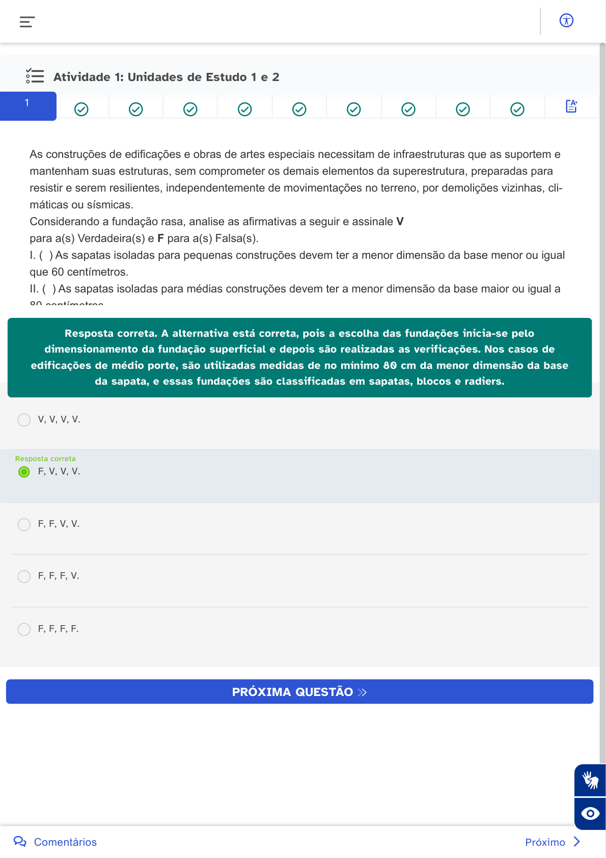 <p>Atividade 1: Unidades de Estudo 1 e 2</p><p>As construções de edificações e obras de artes especiais necessitam de infraestruturas que as suportem e</p><p>mantenham suas estruturas, sem comprometer os demais elementos da superestrutura, preparadas para</p><p>resistir e serem resilientes, independentemente de movimentações no terreno, por demolições vizinhas, cli-</p><p>máticas ou sísmicas.</p><p>Considerando a fundação rasa, analise as afirmativas a seguir e assinale V</p><p>para a(s) Verdadeira(s) e F para a(s) Falsa(s).</p><p>I. ( ) As sapatas isoladas para pequenas construções devem ter a menor dimensão da base menor ou igual</p><p>que 60 centímetros.</p><p>II. ( ) As sapatas isoladas para médias construções devem ter a menor dimensão da base maior ou igual a</p><p>80 centímetros</p><p>Resposta correta. A alternativa está correta, pois a escolha das fundações inicia-se pelo</p><p>dimensionamento da fundação superficial e depois são realizadas as verificações. Nos casos de</p><p>edificações de médio porte, são utilizadas medidas de no mínimo 80 cm da menor dimensão da base</p><p>da sapata, e essas fundações são classificadas em sapatas, blocos e radiers.</p><p>V, V, V, V.</p><p>F, V, V, V.</p><p>Resposta correta</p><p>F, F, V, V.</p><p>F, F, F, V.</p><p>F, F, F, F.</p><p>PRÓXIMA QUESTÃO</p><p>1</p><p> </p><p>Próximo Comentários</p><p></p>