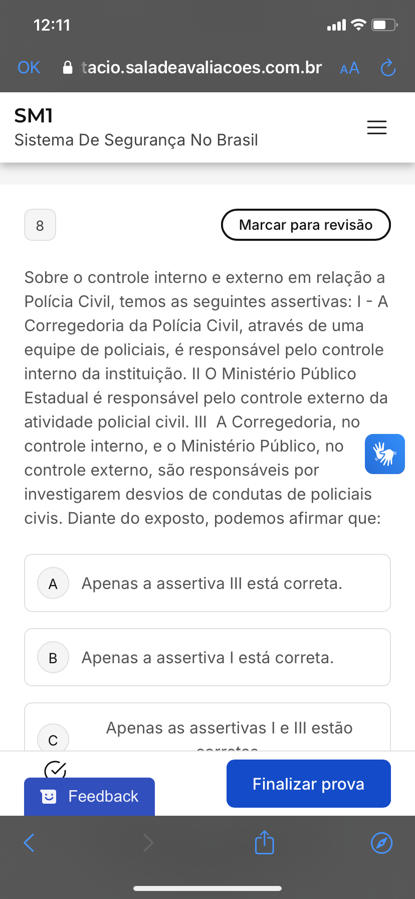 <p>12:11 OK tacio.saladeavaliacoes.com.br AA Sistema De Segurança No Brasil 8 Marcar para revisão Sobre o controle interno e externo em relação a Polícia Civil, temos as seguintes assertivas: - - A Corregedoria da Polícia Civil, através de uma equipe de policiais, é responsável pelo controle interno da instituição. O Ministério Público Estadual é responsável pelo controle externo da atividade policial civil. III A Corregedoria, no controle interno, e o Ministério Público, no controle externo, são responsáveis por investigarem desvios de condutas de policiais civis. Diante do exposto, podemos afirmar que: A Apenas a assertiva III está correta. B Apenas a assertiva está correta. Apenas as assertivas e III estão C Finalizar prova Feedback</p>