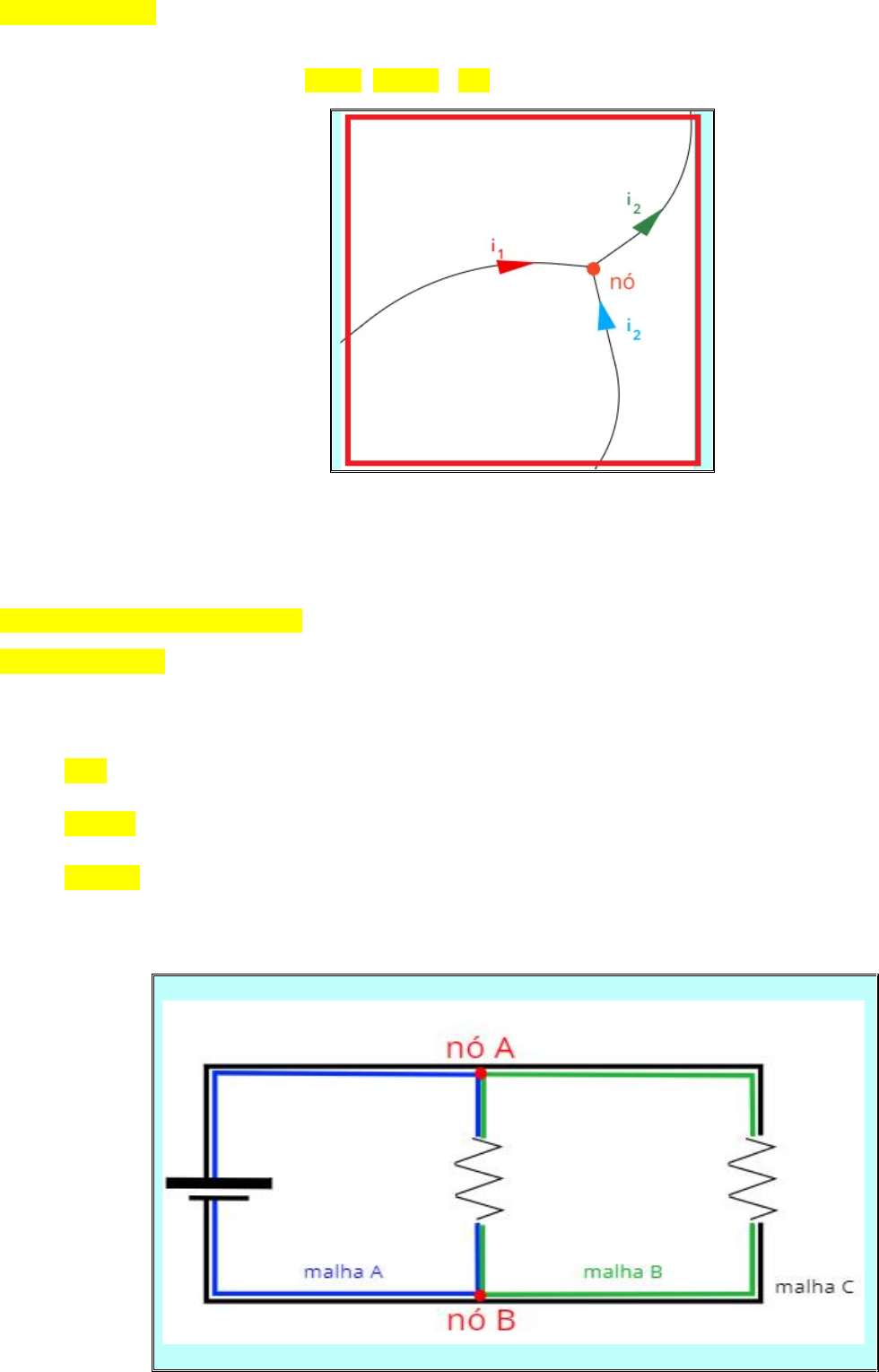 <p>* Descreva com detalhes cada uma das leis e como elas são importantes para a solução de diversos circuitos elétricos.</p><p>Leis de Kirchhoff</p><p>Leis de Kirchhoff são duas regras usadas para determinar parâmetros como corrente elétrica ou potencial elétrico de</p><p>circuitos complexos, formados por ramos, malhas e nós.</p><p>As leis de Kirchhoff, conhecidas como lei das malhas e leis dos nós, são, respectivamente, leis de conservação da carga</p><p>elétrica e da energia nas malhas e nos nós dos circuitos elétricos. Essas leis foram criadas pelo físico alemão Gustav</p><p>Robert Kirchhoff e são usadas para analisar circuitos elétricos complexos, que não podem ser simplificados.</p><p>"Introdução às leis de Kirchhoff"</p><p>Para aprendermos a usar as leis de Kirchoff, precisamos compreender o que são os nós, ramos e malhas dos circuitos</p><p>elétricos. Vamos conferir uma definição simples e objetiva de cada um desses conceitos:</p><p> Nós: são onde há ramificações nos circuitos, ou seja, quando houver mais de um caminho para a passagem da</p><p>corrente elétrica.</p><p> Ramos: são os trechos do circuito que se encontram entre dois nós consecutivos. Ao longo de um ramo, a</p><p>corrente elétrica é sempre constante.</p><p> Malhas: são caminhos fechados em que iniciamos em um nó e voltamos ao mesmo nó. Em uma malha, a soma</p><p>dos potenciais elétricos é sempre igual a zero.</p><p>Na figura seguinte mostramos um circuito que apresenta nós, ramos e malhas, confira:</p><p>"1ª lei de Kirchhoff: lei dos nós"</p><p>“De acordo com as leis de Kirchoff, a soma de todas as correntes que chegam a um nó do circuito deve ser igual à</p><p>soma de todas as correntes que deixam esse mesmo nó. Essa lei é uma consequência do princípio de conservação</p><p>da carga elétrica. Segundo ele, independentemente de qual seja o fenômeno, a carga elétrica inicial será sempre</p><p>igual à carga elétrica final do processo”.</p><p>Vale ressaltar que a corrente elétrica é uma grandeza escalar e, portanto, não apresenta direção ou sentido. Dessa</p><p>maneira, quando somamos as intensidades das correntes elétricas, somente levamos em conta se a corrente chega ou</p><p>deixa o nó.</p><p>Confira a figura a seguir, nela aplicamos a 1ª lei de Kirchhoff às correntes elétricas que chegam e que deixam um nó:</p><p>"2ª lei de Kirchhoff: lei das malhas"</p><p>“A segunda lei de Kirchhoff afirma que a soma dos potenciais elétricos ao longo de uma malha fechada deve ser</p><p>igual a zero. Tal lei decorre do princípio de conservação da energia, que implica que toda energia fornecida à malha</p><p>de um circuito é consumida pelos próprios elementos presentes nessa malha”.</p><p>Formalmente, a 2ª lei de Kirchhoff é escrita como um somatório de todos os potenciais elétricos, como mostramos</p><p>nesta figura:"</p><p>“A soma das N correntes que chegam e que deixam um nó do circuito é igual a 0”</p><p>"Os potenciais elétricos dos resistores da malha devem ser calculados pelas resistências de cada um desses elementos,</p><p>multiplicadas pela corrente elétrica que os atravessa, em consonância com a 1ª lei de Ohm:</p><p>U=Ri</p><p>U – tensão ou potencial elétrico (V)</p><p>R – resistência elétrica (Ω)</p><p>i – corrente elétrica (A)</p><p>Caso a malha percorrida contenha outros elementos, tais como geradores ou receptores, precisamos saber identificá-</p><p>los, uma vez que os símbolos usados para representar geradores e receptores são iguais. Para tanto, observamos o</p><p>sentido da corrente elétrica que percorre esses elementos, lembrando que, tanto para geradores quanto para receptores,</p><p>a barra comprida representa o potencial positivo, enquanto a barra menor representa o potencial negativo:</p><p> Os geradores sempre são percorridos por uma corrente elétrica que entra pelo terminal negativo, de menor</p><p>potencial, e sai pelo terminal positivo, de maior potencial. Em outras palavras, ao passar pelo gerador, a</p><p>corrente elétrica sofre um aumento de potencial ou ganha energia.</p><p> Os receptores são atravessados por uma corrente elétrica que entra pelo terminal positivo e sai pelo terminal</p><p>negativo, de modo que a corrente elétrica “perde” energia ao percorrê-los.</p><p>Depois de aprendermos a identificar os geradores e os receptores da malha, é preciso entender como é feita a convenção</p><p>de sinais da 2ª lei de Kirchhoff. Confira os passos:</p><p> Escolha um sentido arbitrário para a corrente elétrica: caso você não saiba o sentido em que a corrente</p><p>elétrica percorre o circuito, basta escolher um dos sentidos (horário ou anti-horário). Se o sentido da corrente</p><p>for diferente, você simplesmente obterá uma corrente de sinal negativo, portanto, não se preocupe tanto em</p><p>acertar o sentido.</p><p> Escolha um sentido para a circulação da malha: assim como fizemos para a corrente elétrica, faremos para</p><p>o sentido em que a malha é percorrida: escolha um sentido arbitrário para percorrer cada malha.</p><p> Some os potenciais elétricos: caso você percorra um resistor a favor da corrente elétrica, o sinal do potencial</p><p>elétrico será positivo, caso o resistor percorrido seja atravessado por uma corrente elétrica de sentido</p><p>contrário, utilize o sinal negativo. Quando passar por um gerador ou receptor, observe qual dos terminais</p><p>você percorre primeiro: caso seja o terminal negativo, o potencial elétrico deverá ser negativo, por exemplo.</p><p>"Exemplo das leis de Kirchhoff para circuitos elétricos"</p><p>Vamos conferir uma aplicação das leis de Kirchoff. Na próxima figura, mostraremos um circuito elétrico que contém</p><p>três malhas, A, B e C:</p><p>Agora, mostramos cada uma das malhas do circuito separadamente:</p><p>Na figura seguinte, mostraremos como foi a escolha do sentido em que as malhas são percorridas bem c