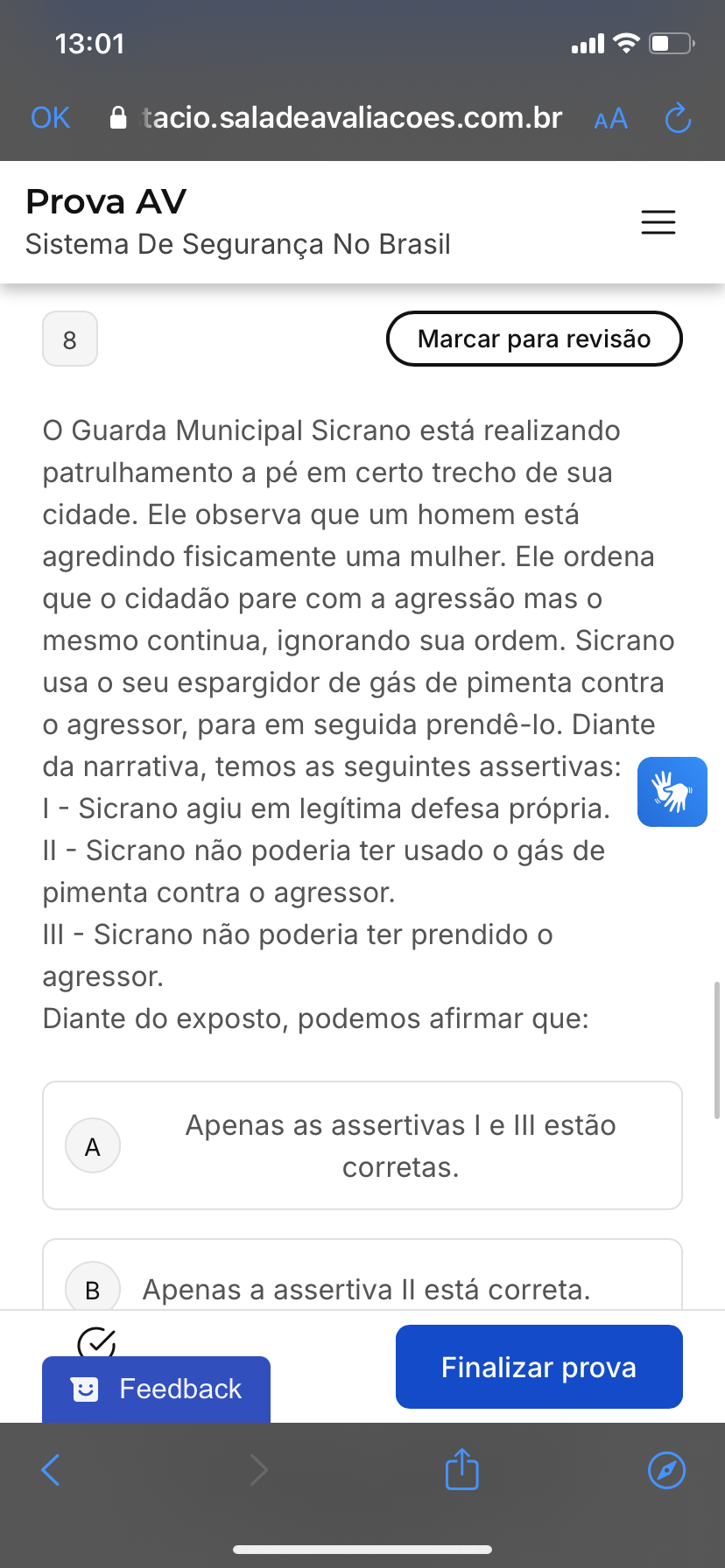 <p>13:01 OK tacio.saladeavaliacoes.com.br AA Prova AV Sistema De Segurança No Brasil 8 Marcar para revisão O Guarda Municipal Sicrano está realizando patrulhamento a pé em certo trecho de sua Ele observa que um homem está agredindo fisicamente uma mulher. Ele ordena que o cidadão pare com a agressão mas o mesmo continua, ignorando sua ordem. Sicrano usa o seu espargidor de gás de pimenta contra o agressor, para em seguida prendê-lo. Diante da narrativa, temos as seguintes assertivas: - Sicrano agiu em legítima defesa própria. - Sicrano não poderia ter usado o gás de pimenta contra o agressor. III - Sicrano não poderia ter prendido o agressor. Diante do exposto, podemos afirmar que: Apenas as assertivas e III estão A corretas. B Apenas a assertiva está correta. Finalizar prova Feedback</p>
