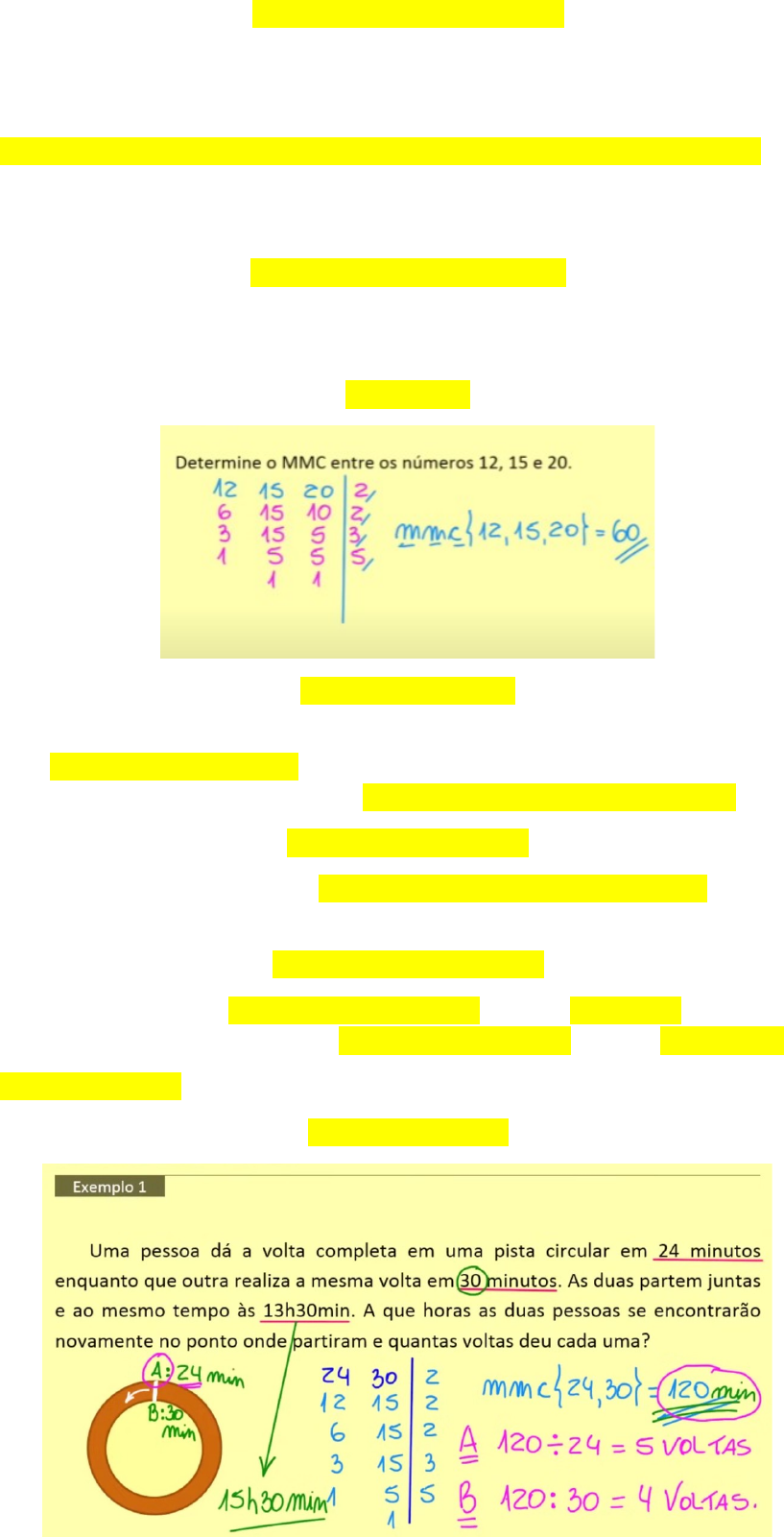 <p>Múltiplos de Um Número Inteiro</p><p>M (3) = {3,6,9,12,15,18,21,24...}</p><p>M (4) = {4,8,12,16,20, 24,28...}</p><p>Mas como determinamos se um número é ou não múltiplo de um outro número?</p><p>Para sabermos rapidamente, basta dividir o número que se deseja verificar essa multiplicidade pelo outro número. Exemplo: 18/3=6.</p><p>Mínimo Múltiplo Comum – MMC</p><p>O MMC de dois ou mais números inteiros é o menor número inteiro positivo que é múltiplo simultaneamente desses números.</p><p>Regra Prática</p><p>Propriedades do MMC</p><p>1 - O MMC entre dois ou mais números primos será sempre o produto entre eles, ou seja, a multiplicação entre eles. Pra recordar os números primos são aqueles que são maiores que 1, e que possuem apenas dois divisores o próprio 1 e ele mesmo.</p><p>Exemplo: MMC {5,7} = 35</p><p>2 – Entre dois ou mais números, se o maior desses números for múltiplo dos outros ele será o mmc.</p><p>Exemplo: MMC {6,8,24} = 24</p><p>3- Se os números forem multiplicados ou divididos por uma constante K, então o mmc entre esses números tambéem será multiplicado ou dividido por uma consntante K.</p><p>Ex: MMC {4,6} = 12</p><p>Exercícios Resolvidos</p><p>Máximo Divisor Comum – MDC</p><p>O MDC entre dois ou mais número inteiros é o maior número inteiro que é divisor de tais números. Exemplo:</p><p>D (12) = {1,2,3,4,6,12}</p><p>D (18) = {1,2,3,6,9,18} Nesse caso o MDC entre 12 e 18, será o número 6.</p><p>Regra Prática</p><p>O máximo divisor comum entre dois ou mais números inteiros pode ser obtido pelo método da fatoração simultânea de números inteiros. Segue o exemplo:</p><p>Propriedades</p><p>1- O máximo divisor comum entre dois ou mais números primos será sempre igual a 1.</p><p>Exemplo: MDC {5,7} = 1</p><p>2- Se a é divisor de b, então o mdc (a,b) = a</p><p>Exemplo: MDC {3,9} = 3</p><p>3- Se os número forem multiplicados/divididos por uma constante k, então o mdc entre esses números também será multiplicado/dividido por k.</p><p>Exemplo: MDC {8,12} = 4</p><p>Exercícios</p><p>image6.png</p><p>image1.png</p><p>image2.png</p><p>image3.png</p><p>image4.png</p><p>image5.png</p>