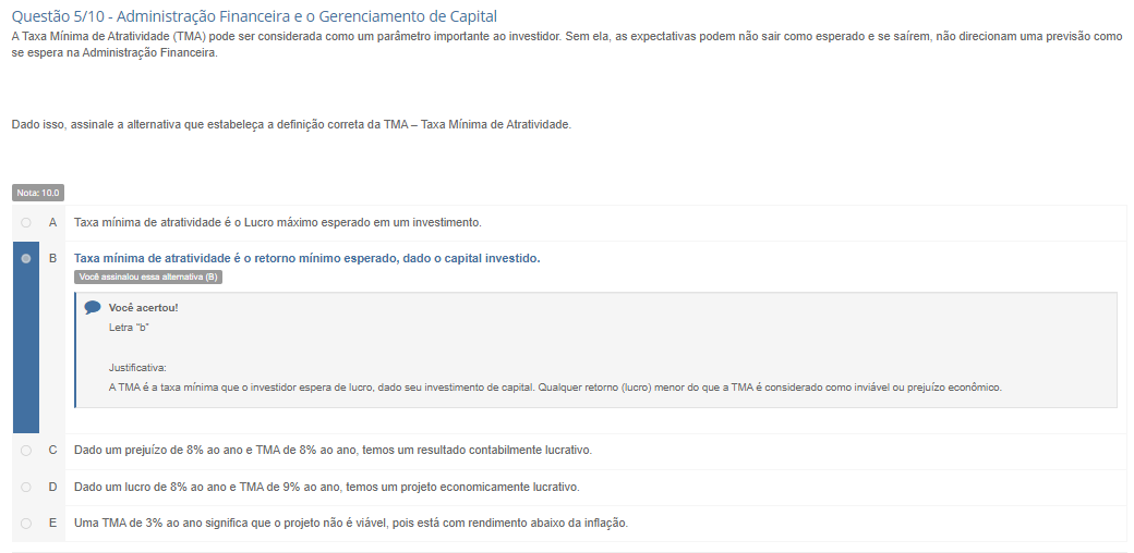 <p>Questão 5/10 - Administração Financeira e Gerenciamento de Capital A Taxa Mínima de Atratividade (TMA) pode ser considerada como um parâmetro importante ao investidor. Sem ela, as expectativas podem não como esperado e se não direcionam uma previsão como se espera na Administração Dado assinale a alternativa que estabeleça a definição correta da TMA - Taxa Mínima de Nota: 10.0 A Taxa mínima de atratividade é Lucro esperado em um B Taxa mínima de atratividade é o retorno mínimo esperado, dado capital investido. Você assinalou essa alternativa (B) Você acertou! Letra "h" Justificativa: A TMA é a taxa mínima que o investidor espera de lucro, dado seu investimento de Qualquer retorno (lucro) menor do que a TMA é considerado como inviável ou prejuízo Dado um prejuízo de 8% ao ano e TMA de 8% ao ano. temos um resultado contabilmente D Dado um lucro de 8% ao ano e TMA de 9% ao ano. temos um projeto economicamente E Uma TMA de 3% ao ano significa que projeto não é pois está com rendimento abaixo da inflação.</p>