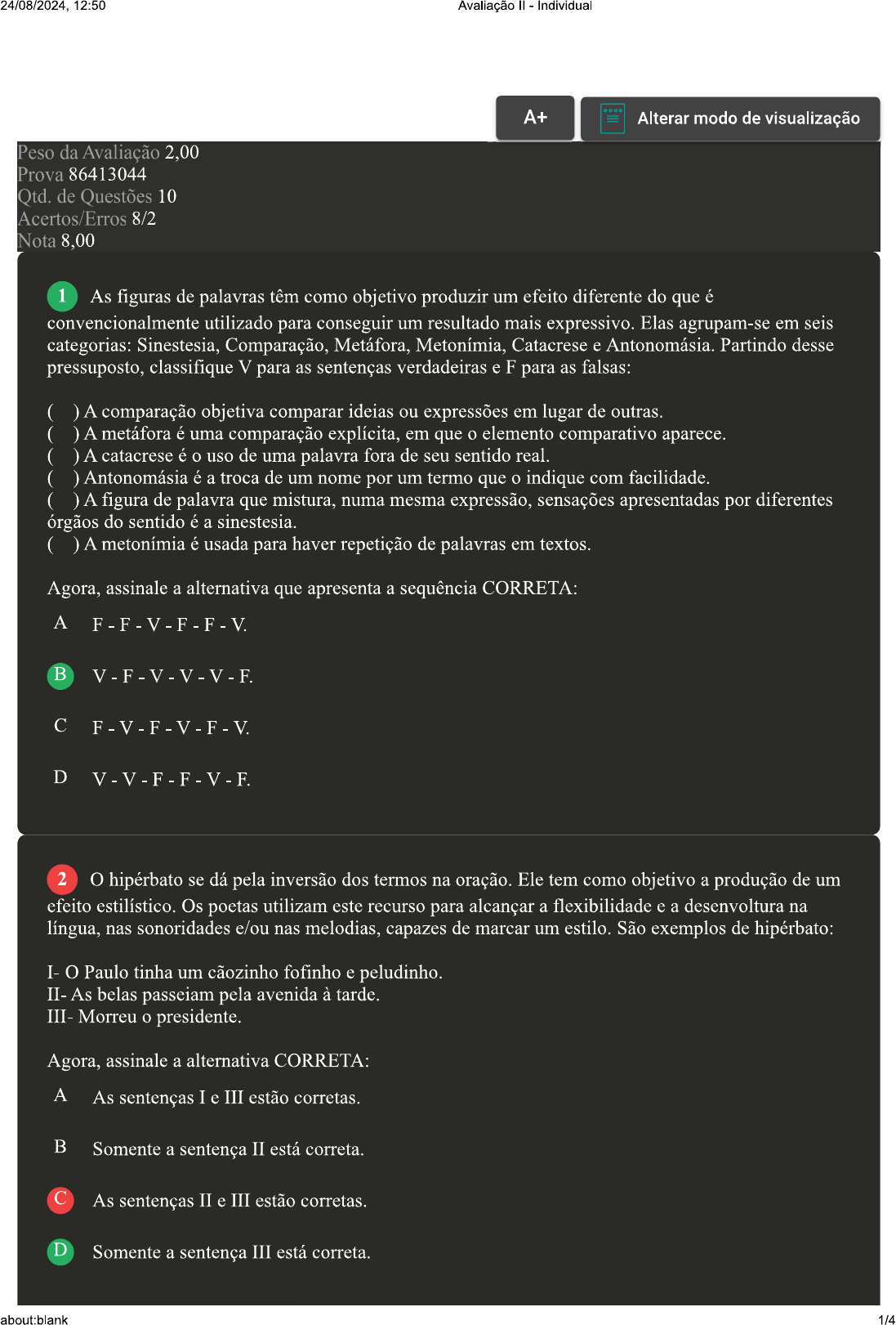 <p>24/08/2024, 12:50 Avaliação Individual A+ Alterar modo de visualização Peso da Avaliação 2,00 Prova 86413044 Qtd. de Questões 10 Acertos/Erros 8/2 Nota 8,00 1 As figuras de palavras têm como objetivo produzir um efeito diferente do que é convencionalmente utilizado para conseguir um resultado mais expressivo. Elas agrupam-se em seis categorias: Sinestesia, Comparação, Metáfora, Metonímia, Catacrese e Antonomásia. Partindo desse pressuposto, classifique V para as sentenças verdadeiras e F para as falsas: ( ) A comparação objetiva comparar ideias ou expressões em lugar de outras. ( ) A metáfora é uma comparação explícita, em que elemento comparativo aparece. ( ) A catacrese é uso de uma palavra fora de seu sentido real. ( ) Antonomásia é a troca de um nome por um termo que indique com facilidade. ( ) A figura de palavra que mistura, numa mesma expressão, sensações apresentadas por diferentes órgãos do sentido é a sinestesia. ( ) A metonímia é usada para haver repetição de palavras em textos. Agora, assinale a alternativa que apresenta a sequência CORRETA: A F-F-V-F-F-V B C F-V-F-V-F-V D 2 O hipérbato se dá pela inversão dos termos na oração. Ele tem como objetivo a produção de um efeito estilístico. Os poetas utilizam este recurso para alcançar a flexibilidade e a desenvoltura na língua, nas sonoridades e/ou nas melodias, capazes de marcar um estilo. São exemplos de I- O Paulo tinha um fofinho e peludinho. II- As belas passeiam pela avenida à tarde. III- Morreu presidente. Agora, assinale a alternativa CORRETA: A As sentenças I e III estão corretas. B Somente a sentença II está correta. C As sentenças II e III estão corretas. D Somente a sentença III está correta. about:blank 1/4</p><p>24/08/2024, 12:50 Avaliação Individual Revisar Conteúdo do Livro 3 O uivo de um por meio da escrita, caracteriza uma figura de palavra. Sobre essa figura, assinale a alternativa CORRETA: A Neologismo. B Zeugma. C Onomatopeia. D Assonância. 4 A linguagem, inserida no contexto social, possibilita a compreensão dos sujeitos que são dialogicamente constituídos, uma vez que desvela a discursividade da sociedade. Dito de outra maneira, a linguagem está em curso e se move no contexto histórico-social. Dessa forma, somos constituídos pela linguagem por meio de enunciados produzidos no convívio social, na coletividade e nas interlocuções, ampliando nosso conhecimento e do outro. Sobre as figuras de linguaguem e seus quatro grupos, assinale a alternativa INCORRETA: A Figuras de palavras. B Figuras de construção ou sintaxe. C Figuras de pensamento. D Figuras sociais. 5 Os objetivos dessa vertente dos estudos da estilística partem do princípio de: análise das expressões dos fatos de sensibilidade sobre a linguagem; análise das ações dos fatos de linguagem sobre a sensibilidade. Esses objetivos seriam aplicáveis a alguns domínios, tais como: a linguagem em sua totalidade, procurando determinar os chamados "universais estilísticos"; e a uma determinada língua, resultando a "estilística langue" Sobre tipo de estilística que texto se refere, assinale a alternativa CORRETA: A Estilística retórica. B Estilística estrutural. C Estilística idealista. D Estilística descritiva. about:blank 2/4</p><p>24/08/2024, 12:50 Avaliação Individual 6 Na linguística, estudos relacionados à linguagem no seu contexto de uso; esse ramo da linguística é chamado de pragmática. Sobre conceito de pragmática, assinale a alternativa CORRETA: A A pragmática estuda elementos linguísticos e verifica a significação do ato de B A pragmática se restringe aos significados do ato da fala, entendendo uso linguístico dos falantes. C A pragmática é uma interação verbal entre locutor e destinatário, que analisa a posição e tom de D A pragmática estuda, essencialmente, a significação no ato da fala e da comunicação, analisando a significação linguística no contexto de uso. 7 Ocorre pela falta de um termo específico para designar um conceito e, por isso, acabamos por pegar outro emprestado. Sobre exposto, assinale a alternativa CORRETA: A Metonímia. B Metáfora. C Antonomásia. D Catacrese. 8 "Vozes veladas, veludosas vozes/ Volúpias dos vozes veladas..." (Cruz e Sousa) Sobre esse exemplo de figura de linguagem, assinale a alternativa CORRETA: A Aliteração. B C Anáfora. D Anacoluto. Revisar Conteúdo do Livro 9 As figuras de pensamento referem-se ao significado escondido que as palavras podem ter. Elas têm um aspecto semântico que exploram os significados que estão por trás das ideias de uma determinada expressão. Dentre as figuras de pensamento, assinale a alternativa CORRETA que caracteriza a ironia: A Ela consiste em satirizar ou ridicularizar um pensamento. about:blank 3/4</p><p>24/08/2024, 12:50 Avaliação - Individual B Ela realça, exageradamente, uma expressão. C Ela atribui sentimento a seres inanimados. D Ela suaviza uma verdade tida como desagradável. 10 Por hábito de diversas pessoas, chamamos diversos materiais, produtos e objetos por nomes diferentes do que eles são. É caso de gilete, por exemplo. Este nome é de uma marca, que comumente agregamos ao aparelho de barbear. Tal caso ocorre também com nescau: muitas vezes é um achocolatado qualquer, de marcas variadas, mas usamos nome citado para identificá-lo. Sobre essa figura de linguagem, assinale a alternativa CORRETA: A Catacrese. B Comparação. C Metonímia. D Metáfora. Imprimir 4/4 about:blank</p>