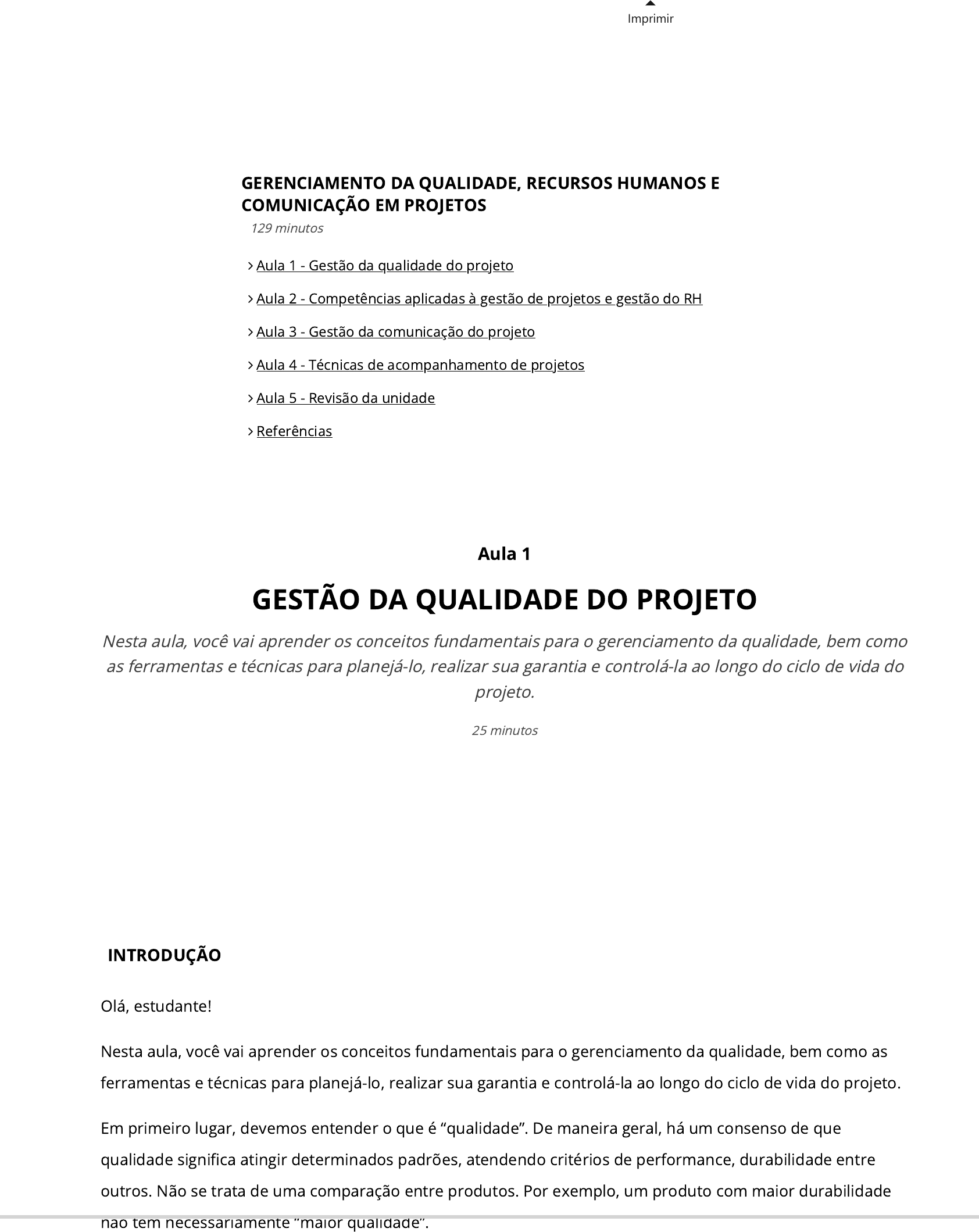 <p>19/02/2024, 10:40 wlldd_232_u3_ges_pro</p><p>https://www.avaeduc.com.br/mod/url/view.php?id=3337927 1/32</p><p>Imprimir</p><p>INTRODUÇÃO</p><p>Olá, estudante!</p><p>Nesta aula, você vai aprender os conceitos fundamentais para o gerenciamento da qualidade, bem como as</p><p>ferramentas e técnicas para planejá-lo, realizar sua garantia e controlá-la ao longo do ciclo de vida do projeto.</p><p>Em primeiro lugar, devemos entender o que é “qualidade”. De maneira geral, há um consenso de que</p><p>qualidade signi�ca atingir determinados padrões, atendendo critérios de performance, durabilidade entre</p><p>outros. Não se trata de uma comparação entre produtos. Por exemplo, um produto com maior durabilidade</p><p>não tem necessariamente “maior qualidade”.</p><p>Aula 1</p><p>GESTÃO DA QUALIDADE DO PROJETO</p><p>Nesta aula, você vai aprender os conceitos fundamentais para o gerenciamento da qualidade, bem como</p><p>as ferramentas e técnicas para planejá-lo, realizar sua garantia e controlá-la ao longo do ciclo de vida do</p><p>projeto.</p><p>25 minutos</p><p>GERENCIAMENTO DA QUALIDADE, RECURSOS HUMANOS E</p><p>COMUNICAÇÃO EM PROJETOS</p><p> Aula 1 - Gestão da qualidade do projeto</p><p> Aula 2 - Competências aplicadas à gestão de projetos e gestão do RH</p><p> Aula 3 - Gestão da comunicação do projeto</p><p> Aula 4 - Técnicas de acompanhamento de projetos</p><p> Aula 5 - Revisão da unidade</p><p> Referências</p><p>129 minutos</p><p>19/02/2024, 10:40 wlldd_232_u3_ges_pro</p><p>https://www.avaeduc.com.br/mod/url/view.php?id=3337927 2/32</p><p>Portanto, antes de medir a qualidade, precisamos de�nir e planejar a qualidade no projeto, identi�cando os</p><p>padrões e critérios aplicáveis. Você vai aprender também que os resultados re�etem os processos. Neste</p><p>sentido, a garantia da qualidade tem como objetivo assegurar que as etapas, processos e técnicas para</p><p>produção do resultado �nal estão sendo seguidos, minimizando defeitos, desvios e variações. Obviamente,</p><p>como alguns defeitos podem ocorrer mesmo assim, devemos submeter os resultados �nais a testes e</p><p>inspeções no processo de controle da qualidade.</p><p>Bons estudos!</p><p>CONCEITOS FUNDAMENTAIS DA GESTÃO DA QUALIDADE</p><p>De acordo com a norma ISO 9000, qualidade pode ser de�nida como o grau de atingimento dos requisitos ou</p><p>critérios para um conjunto de características do produto ou serviço. Por exemplo, imagine que estamos</p><p>produzindo cubos de ferro maciço. As dimensões de cada cubo devem corresponder a 5 centímetros, com</p><p>uma tolerância de 5%. Ou seja, um cubo com 5,1 centímetros está dentro dos requisitos para a característica</p><p>em questão; portanto, o cubo tem qualidade, sendo aprovado no teste. Por outro lado, um cubo com 5,6</p><p>centímetros de lado está fora da tolerância. Consequentemente, esse cubo estaria reprovado por não</p><p>conformidade: ele não teria qualidade.</p><p>O exemplo acima pode ser estendido não somente para dimensões e características físicas como peso e</p><p>cores, mas também para funcionalidades, desempenho, durabilidade, entre outras. Um serviço de</p><p>atendimento ao cliente, por exemplo, poderia ter como padrão a duração média de 1 hora com tolerância de</p><p>20 minutos. Se os atendimentos ocorrem abaixo de 1h20, então o serviço tem qualidade, pois atende aos</p><p>padrões, critérios e requisitos.</p><p>Você já deve ter percebido que a qualidade depende do padrão que estamos utilizando. Um carro de luxo que</p><p>não atende aos requisitos de qualidade em seu manual está em não conformidade, mesmo que possa ser</p><p>comparativamente superior a um carro econômico.</p><p>Quando se trata do gerenciamento da qualidade em projetos, o primeiro processo é planejá-lo. Nesta etapa, o</p><p>gerente do projeto e sua equipe devem identi�car requisitos, critérios e padrões aplicáveis, bem como</p><p>estabelecer os testes e inspeções que serão utilizados para veri�car a qualidade do produto ou serviço �nal.</p><p>A qualidade pode ser entendida como a ausência de defeitos e a “adequação ao uso” ou atendimento dos</p><p>requisitos. A partir do plano de gerenciamento da qualidade, o gestor do projeto e sua equipe podem</p><p>estabelecer a supervisão das atividades para assegurar que o produto tenha o nível de qualidade desejado.</p><p>Chama-se de processo de garantia da qualidade essa supervisão e coordenação. Por exemplo, imagine que</p><p>a tolerância na variação do cubo que mencionamos anteriormente seja muito pequena. Isto é, desejamos um</p><p>nível de qualidade com precisão maior do que milimétrica. Provavelmente, seriam necessários processos mais</p><p>precisos, ferramentas mais modernas, trabalhadores mais experientes. Por outro lado, um grau de tolerância</p><p>muito grande poderia utilizar processos menos precisos, ferramentas grosseiras e trabalhadores com pouco</p><p>treinamento.</p><p>19/02/2024, 10:40 wlldd_232_u3_ges_pro</p><p>https://www.avaeduc.com.br/mod/url/view.php?id=3337927 3/32</p><p>Estabelecer a garantia da qualidade a partir do plano de gerenciamento da qualidade é um grande avanço.</p><p>Todavia, nenhum processo é perfeito. Consequentemente, devemos testar e inspecionar os resultados �nais</p><p>em um processo chamado de controle da qualidade, cujo objetivo é a veri�cação dos requisitos. Caso algum</p><p>defeito ou desvio seja encontrado, o processo de controle da qualidade impede que esse defeito chegue ao</p><p>cliente �nal, causando prejuízos ainda maiores.</p><p>PLANEJAMENTO, GARANTIA E CONTROLE DA QUALIDADE</p><p>Agora vamos nos debruçar nas ferramentas e técnicas para cada um dos três processos de gerenciamento da</p><p>qualidade em projetos. Planejar o gerenciamento da qualidade é o primeiro processo, responsável pela</p><p>identi�cação de requisitos, normas e padrões aplicáveis. Toda