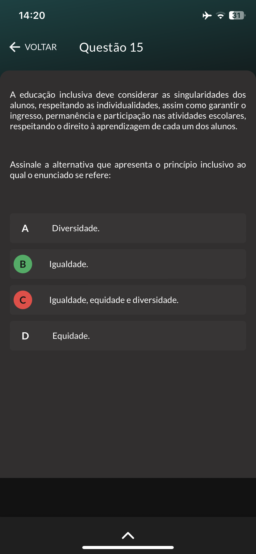<p>14:20 31 VOLTAR Questão 15 A educação inclusiva deve considerar as singularidades dos alunos, respeitando as individualidades, assim como garantir o ingresso, permanência e participação nas atividades escolares, respeitando direito à aprendizagem de cada um dos alunos. Assinale a alternativa que apresenta princípio inclusivo ao qual enunciado se refere: A Diversidade. Igualdade. C Igualdade, equidade e diversidade. D Equidade.</p>
