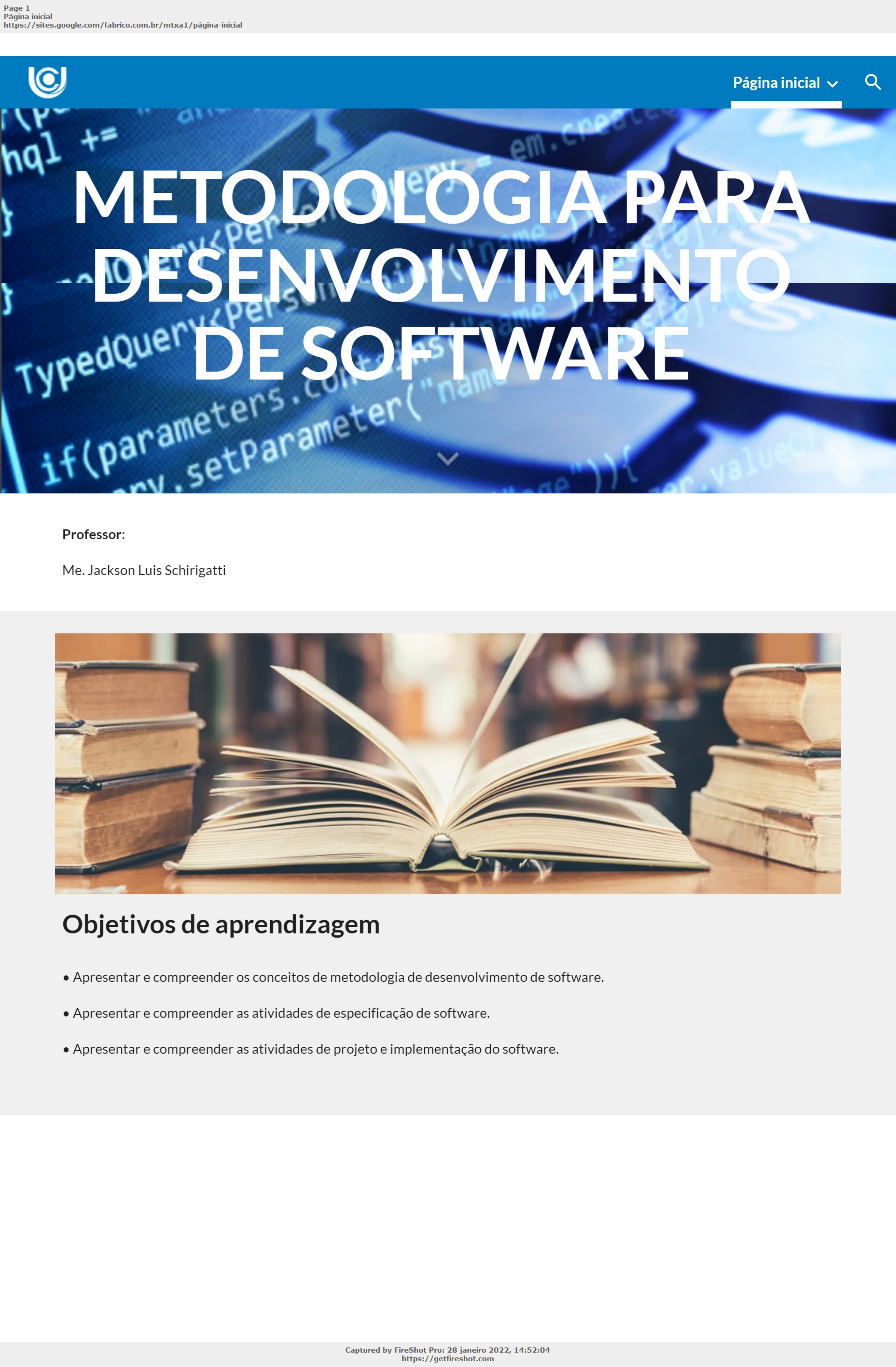 <p>Página inicial</p><p>METODOLOGIA PARA</p><p>DESENVOLVIMENTO</p><p>DE SOFTWARE</p><p>Professor :</p><p>Me. Jackson Luis Schirigatti</p><p>Objetivos de aprendizagem</p><p>• Apresentar e compreender os conceitos de metodologia de desenvolvimento de software.</p><p>• Apresentar e compreender as atividades de especificação de software.</p><p>• Apresentar e compreender as atividades de projeto e implementação do software.</p><p>https://sites.google.com/fabrico.com.br/mtxa1/p�gina-inicial</p><p>https://getfireshot.com</p><p>https://sites.google.com/fabrico.com.br/mtxa1/p%C3%A1gina-inicial</p><p>https://sites.google.com/fabrico.com.br/mtxa1/p%C3%A1gina-inicial</p><p>Plano de estudo</p><p>A seguir, apresentam-se os tópicos que você estudará nesta unidade:</p><p>• Conceitos de Metodologias de Desenvolvimento de Software.</p><p>• Fase de Especificação de Software.</p><p>• Fase de Projeto e Implementação do Software.</p><p>Introdução</p><p>Para compreender os benefícios entre as metodologias tradicionais e ágeis, como utilizá-las ou até mesmo como combiná-las, é</p><p>necessário um entendimento do conceito sobre as metodologias de desenvolvimento de software. Neste estudo, vamos</p><p>apresentar e compreender o conceito de metodologia de desenvolvimento de software e as principais fases da metodologia</p><p>tradicional de desenvolvimento. O estudo das metodologias de desenvolvimento de software no campo da engenharia de software</p><p>é imprescindível para que as organizações atinjam uma melhor eficiência e qualidade dos seus sistemas de informações e,</p><p>consequentemente, dos resultados dos seus processos funcionais. Veremos que essas metodologias cadenciam os processos do</p><p>ciclo de vida de desenvolvimento, regendo os recursos, regras e padrões, direcionando os requisitos necessários para a</p><p>implementação e descomplicando, assim, a tarefa de produzir o software. Estamos em uma época em que desenvolver sistemas</p><p>não é mais sinônimo de complexidade e alto custo, pois as metodologias ágeis e suas combinações com as boas práticas de</p><p>gerenciamento de projetos, se bem utilizadas e compreendidas, promovem, em qualquer tipo de ambiente, uma elevação de</p><p>produtividade no desenvolvimento. Cada vez mais novas metodologias e suas combinações estão sendo estudas e melhoradas,</p><p>trazendo reais benefícios e melhorias às fábricas de software e às equipes de projetos de desenvolvimento de software.</p><p>Avançar</p><p>DOWNLOAD PDF</p><p>UNICESUMAR | UNIVERSO EAD</p><p>https://sites.google.com/fabrico.com.br/mtxa1/p�gina-inicial</p><p>https://getfireshot.com</p><p>https://sites.google.com/fabrico.com.br/mtxa1/p%C3%A1gina-inicial/unidade-1</p><p>https://drive.google.com/file/d/1GnBbWAfGjOdxUVSoS86-YTtPtoQ_XKtP/view?usp=sharing</p><p>Página inicial</p><p>Conceitos de Metodologias de</p><p>Desenvolvimento De Software</p><p>Para Koscianski e Soares (2007, p. 190), “uma metodologia de desenvolvimento de software é um conjunto de atividades que</p><p>auxiliam na produção de software. O resultado dessas atividades é um produto que reflete a forma com que o processo foi</p><p>conduzido”. Contudo, um conjunto de atividade é denominado de processo. Sendo assim, uma metodologia de desenvolvimento de</p><p>software se utiliza de processos de produção de software. Engholm Jr. (2010, p. 42) comenta que processo é um conjunto</p><p>sequencial e peculiar de ações que objetivam atingir uma meta. É usado para criar, inventar, projetar, transformar, produzir,</p><p>controlar, manter e usar produtos ou sistemas.</p><p>Os processos estão vinculados às atividades e procedimentos dos funcionários ou colaboradores de uma empresa. Estes processos</p><p>são compostos de rotinas de trabalho, chamadas instruções de trabalho. Um sistema de folha de pagamento, planejamento de</p><p>controle e produção, estocagem, emissão de pedidos e demais funções, estão vinculadas aos processos organizacionais. Os</p><p>processos são compostos de ‘entrada’ de informações ou de matérias-primas; de ‘processamento’ de cálculos ou transformação</p><p>das informações ou das matérias-primas; ‘saída’ de informações, resultados ou de produtos acabados; de ‘recursos’ de pessoal ou</p><p>financeiro; e de ‘regras e padrões’ como políticas, instruções de trabalho, normas, regulamentações, etc., como mostra a Figura 1.</p><p>Figura 1 - Representação de um processo.</p><p>https://sites.google.com/fabrico.com.br/mtxa1/p�gina-inicial/unidade-1</p><p>https://getfireshot.com</p><p>https://sites.google.com/fabrico.com.br/mtxa1/p%C3%A1gina-inicial</p><p>https://sites.google.com/fabrico.com.br/mtxa1/p%C3%A1gina-inicial</p><p>Fonte: autor.</p><p>Podemos citar algumas características sobre o processo, enumeradas por Engholm Jr. (2010, p. 43):</p><p>é disparado/iniciado por evento externo; engloba todas as atividades necessárias para prover os resultados</p><p>apropriados em resposta ao evento que o iniciou; tem indicadores de desempenho para os quais os</p><p>objetivos mensuráveis podem ser estabelecidos, e o desempenho, avaliado, [...] etc.</p><p>Além disso, são compostos por atividades, e essas decompostas por rotinas ou procedimentos funcionais, chegando ao maior</p><p>detalhe possível da atividade, ou seja, como fazer o procedimento. As atividades também são regidas por normas, especificações</p><p>ou padrões determinados, que são executados por recursos tecnológicos ou humanos.</p><p>Sommerville (2011, p. 18-19) comenta que esse processo de produção de software pode acontecer de diferentes formas, seja para</p><p>novos softwares desenvolvidos a partir do zero ou para implementações, mas devem incluir quatro atividades, etapas ou fases</p><p>fundamentais para a engenharia de software: (1) especificação de software (definições das funcionalidades e funcionamento); (2)</p><p>projeto e impl