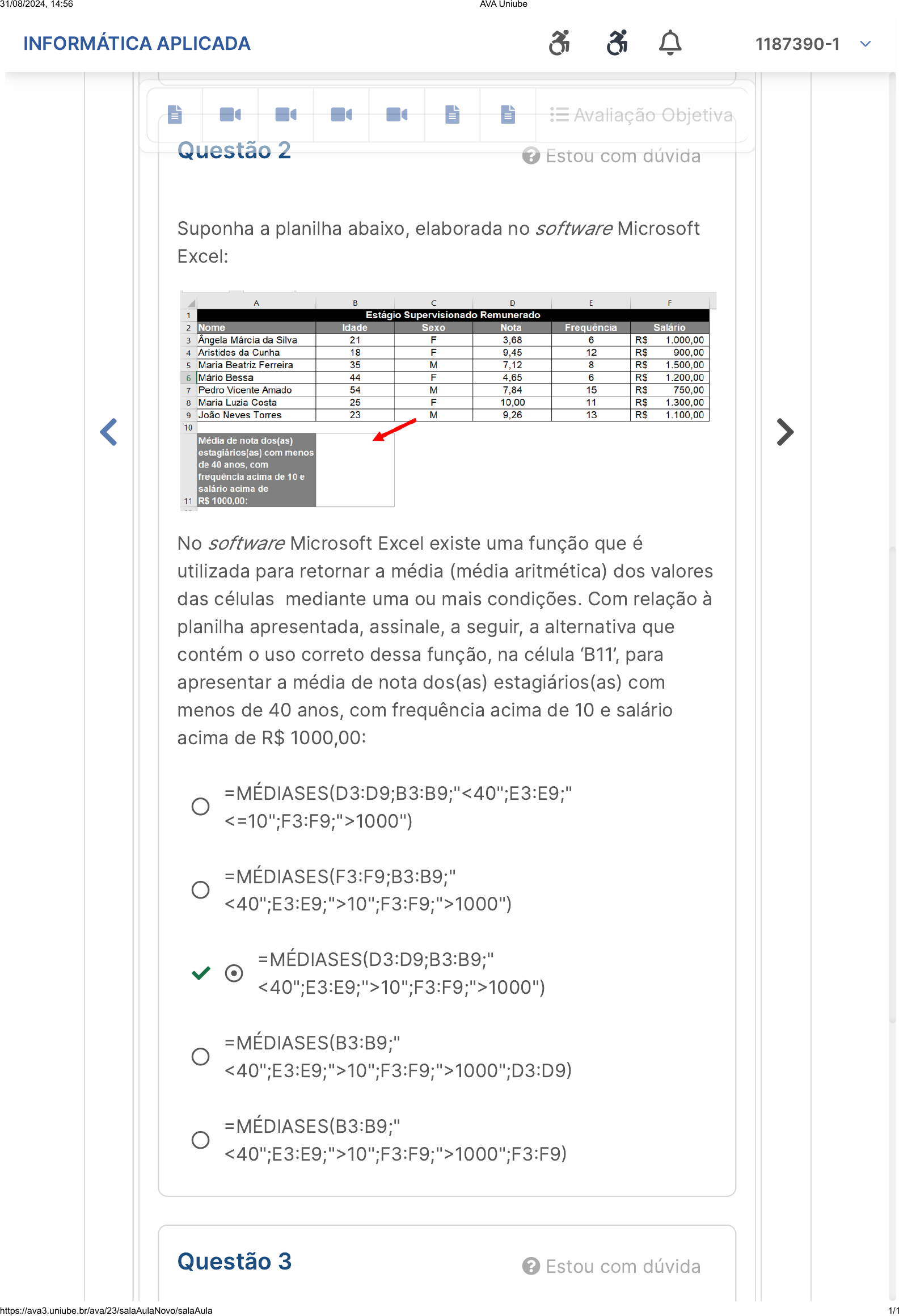 <p></p><p>Questão 2 Estou com dúvida</p><p>Suponha a planilha abaixo, elaborada no software Microsoft</p><p>Excel:</p><p>No software Microsoft Excel existe uma função que é</p><p>utilizada para retornar a média (média aritmética) dos valores</p><p>das células mediante uma ou mais condições. Com relação à</p><p>planilha apresentada, assinale, a seguir, a alternativa que</p><p>contém o uso correto dessa função, na célula ‘B11’, para</p><p>apresentar a média de nota dos(as) estagiários(as) com</p><p>menos de 40 anos, com frequência acima de 10 e salário</p><p>acima de R$ 1000,00�</p><p></p><p>�MÉDIASES�D3�D9;B3�B9;"�40";E3�E9;"</p><p>��10";F3�F9;"�1000")</p><p></p><p>�MÉDIASES�F3�F9;B3�B9;"</p><p>�40";E3�E9;"�10";F3�F9;"�1000")</p><p> </p><p>�MÉDIASES�D3�D9;B3�B9;"</p><p>�40";E3�E9;"�10";F3�F9;"�1000")</p><p></p><p>�MÉDIASES�B3�B9;"</p><p>�40";E3�E9;"�10";F3�F9;"�1000";D3�D9�</p><p></p><p>�MÉDIASES�B3�B9;"</p><p>�40";E3�E9;"�10";F3�F9;"�1000";F3�F9�</p><p>Questão 3 Estou com dúvida</p><p></p><p></p><p> Avaliação Objetiva</p><p>INFORMÁTICA APLICADA 1187390�1</p><p>31/08/2024, 14:56 AVA Uniube</p><p>https://ava3.uniube.br/ava/23/salaAulaNovo/salaAula 1/1</p>