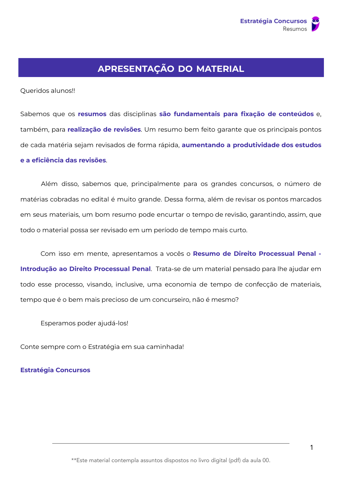 <p>APRESENTAÇÃO DO MATERIAL</p><p>Queridos alunos!!</p><p>Sabemos que os resumos das disciplinas são fundamentais para fixação de conteúdos e,</p><p>também, para realização de revisões. Um resumo bem feito garante que os principais pontos</p><p>de cada matéria sejam revisados de forma rápida, aumentando a produtividade dos estudos</p><p>e a eficiência das revisões.</p><p>Além disso, sabemos que, principalmente para os grandes concursos, o número de</p><p>matérias cobradas no edital é muito grande. Dessa forma, além de revisar os pontos marcados</p><p>em seus materiais, um bom resumo pode encurtar o tempo de revisão, garantindo, assim, que</p><p>todo o material possa ser revisado em um período de tempo mais curto.</p><p>Com isso em mente, apresentamos a vocês o Resumo de Direito Processual Penal -</p><p>Introdução ao Direito Processual Penal. Trata-se de um material pensado para lhe ajudar em</p><p>todo esse processo, visando, inclusive, uma economia de tempo de confecção de materiais,</p><p>tempo que é o bem mais precioso de um concurseiro, não é mesmo?</p><p>Esperamos poder ajudá-los!</p><p>Conte sempre com o Estratégia em sua caminhada!</p><p>Estratégia Concursos</p><p>1</p><p>**Este material contempla assuntos dispostos no livro digital (pdf) da aula 00.</p><p>60542297370 - Leonardo Santos</p><p>RESUMO DE DIREITO PROCESSUAL PENAL</p><p>CONCEITO E FONTES DO DIREITO PROCESSUAL PENAL</p><p>Conceito - Ramo do Direito que tem por finalidade a aplicação, no caso concreto, da</p><p>Lei Penal</p><p>Fontes – Origem do direito processual penal. Podem ser:</p><p>● Fontes formais (ou de cognição) – Meio pelo qual a norma é lançada no</p><p>mundo jurídico. Podem ser imediatas (também chamadas de diretas ou</p><p>primárias) mediatas (também chamadas de indiretas, secundárias ou</p><p>supletivas).</p><p>○ IMEDIATAS – São as fontes principais, aquelas que devem ser</p><p>aplicadas primordialmente (Constituição, Leis, tratados e</p><p>2</p><p>**Este material contempla assuntos dispostos no livro digital (pdf) da aula 00.</p><p>60542297370 - Leonardo Santos</p><p>convenções internacionais). Basicamente, portanto, os diplomas</p><p>normativos nacionais e internacionais1.</p><p>○ MEDIATAS – São aplicáveis quando há lacuna, ausência de</p><p>regulamentação pelas fontes formais imediatas (costumes,</p><p>analogia e princípios gerais do Direito).</p><p>● Fontes materiais (ou de produção) – É o órgão, ente, entidade ou</p><p>Instituição responsável pela produção da norma processual penal. No</p><p>Brasil, em regra, é a União, podendo os Estados legislarem sobre questões</p><p>específicas.</p><p>3</p><p>**Este material contempla assuntos dispostos no livro digital (pdf) da aula 00.</p><p>60542297370 - Leonardo Santos</p>