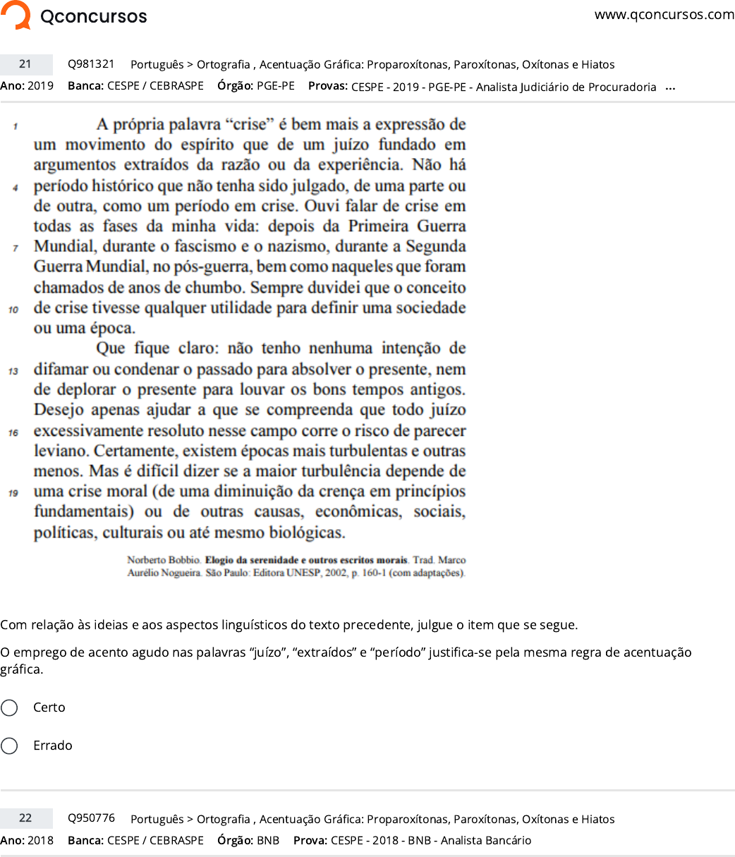 <p>www.qconcursos.com</p><p>Ano: 2019 Banca: CESPE / CEBRASPE Órgão: PGE-PE</p><p>Com relação às ideias e aos aspectos linguísticos do texto precedente, julgue o item que se segue.</p><p>O emprego de acento agudo nas palavras “juízo”, “extraídos” e “período” justi�ca-se pela mesma regra de acentuação</p><p>grá�ca.</p><p>Certo</p><p>Errado</p><p>Ano: 2018 Banca: CESPE / CEBRASPE Órgão: BNB</p><p>21 Q981321 >Português Ortogra�a , Acentuação Grá�ca: Proparoxítonas, Paroxítonas, Oxítonas e Hiatos</p><p>Provas: CESPE - 2019 - PGE-PE - Analista Judiciário de Procuradoria ...</p><p>22 Q950776 >Português Ortogra�a , Acentuação Grá�ca: Proparoxítonas, Paroxítonas, Oxítonas e Hiatos</p><p>Prova: CESPE - 2018 - BNB - Analista Bancário</p><p>https://www.qconcursos.com/</p><p>https://www.qconcursos.com/questoes-de-concursos/bancas/cespe-cebraspe</p><p>https://www.qconcursos.com/questoes-de-concursos/institutos/pge-pe</p><p>https://www.qconcursos.com/questoes-de-concursos/bancas/cespe-cebraspe</p><p>https://www.qconcursos.com/questoes-de-concursos/institutos/bnb</p><p>https://www.qconcursos.com/questoes-de-concursos/questoes/c79124f0-5f</p><p>https://www.qconcursos.com/questoes-de-concursos/disciplinas/letras-portugues</p><p>https://www.qconcursos.com/questoes-de-concursos/disciplinas/letras-portugues/ortografia</p><p>https://www.qconcursos.com/questoes-de-concursos/disciplinas/letras-portugues/acentuacao-grafica-proparoxitonas-paroxitonas-oxitonas-e-hiatos</p><p>https://www.qconcursos.com/questoes-de-concursos/provas/cespe-2019-pge-pe-analista-judiciario-de-procuradoria</p><p>https://www.qconcursos.com/questoes-de-concursos/questoes/67fe13ac-fa</p><p>https://www.qconcursos.com/questoes-de-concursos/disciplinas/letras-portugues</p><p>https://www.qconcursos.com/questoes-de-concursos/disciplinas/letras-portugues/ortografia</p><p>https://www.qconcursos.com/questoes-de-concursos/disciplinas/letras-portugues/acentuacao-grafica-proparoxitonas-paroxitonas-oxitonas-e-hiatos</p><p>https://www.qconcursos.com/questoes-de-concursos/provas/cespe-2018-bnb-analista-bancario</p><p>A respeito de aspectos linguísticos e dos sentidos do texto 2A1-II, julgue o item que se segue.</p><p>Os vocábulos “trás”, “é” e “nós” recebem acento grá�co em obediência à mesma regra de acentuação.</p><p>Certo</p><p>Errado</p><p>Ano: 2017 Banca: CESPE / CEBRASPE Órgão: TRF - 1ª REGIÃO</p><p>Texto 4A4AAA</p><p>23 Q856529 >Português Ortogra�a , Acentuação Grá�ca: Proparoxítonas, Paroxítonas, Oxítonas e Hiatos</p><p>Prova: CESPE - 2017 - TRF - 1ª REGIÃO - Analista Judiciário -</p><p>Taquigra�a</p><p>https://www.qconcursos.com/questoes-de-concursos/bancas/cespe-cebraspe</p><p>https://www.qconcursos.com/questoes-de-concursos/institutos/trf-1-regiao</p><p>https://www.qconcursos.com/questoes-de-concursos/questoes/7eeefdb0-e1</p><p>https://www.qconcursos.com/questoes-de-concursos/disciplinas/letras-portugues</p><p>https://www.qconcursos.com/questoes-de-concursos/disciplinas/letras-portugues/ortografia</p><p>https://www.qconcursos.com/questoes-de-concursos/disciplinas/letras-portugues/acentuacao-grafica-proparoxitonas-paroxitonas-oxitonas-e-hiatos</p><p>https://www.qconcursos.com/questoes-de-concursos/provas/cespe-2017-trf-1-regiao-analista-judiciario-taquigrafia</p><p>https://www.qconcursos.com/questoes-de-concursos/provas/cespe-2017-trf-1-regiao-analista-judiciario-taquigrafia</p><p>Considerando as relações sintático-semânticas do texto 4A4AAA, julgue o próximo item.</p><p>O emprego de acento na palavra “memória” (l.19) pode ser justi�cado por duas regras de acentuação distintas.</p><p>Certo</p><p>Errado</p><p>Ano: 2017 Banca: CESPE / CEBRASPE Órgão: Prefeitura de São Luís - MA</p><p>24 Q801519</p><p>>Português Ortogra�a , Interpretação de Textos ,</p><p>Signi�cação Contextual de Palavras e Expressões. Sinônimos e Antônimos. Coesão e coerência , Sintaxe ,</p><p>Concordância verbal, Concordância nominal , Acentuação Grá�ca: Proparoxítonas, Paroxítonas, Oxítonas e Hiatos</p><p>Provas: CESPE - 2017 - Prefeitura de São Luís - MA -</p><p>Conhecimentos Básicos - Cargos de Técnico Municipal Nível Médio ...</p><p>https://www.qconcursos.com/questoes-de-concursos/bancas/cespe-cebraspe</p><p>https://www.qconcursos.com/questoes-de-concursos/institutos/prefeitura-de-sao-luis-ma</p><p>https://www.qconcursos.com/questoes-de-concursos/questoes/5f3e7cd8-20</p><p>https://www.qconcursos.com/questoes-de-concursos/disciplinas/letras-portugues</p><p>https://www.qconcursos.com/questoes-de-concursos/disciplinas/letras-portugues/ortografia</p><p>https://www.qconcursos.com/questoes-de-concursos/disciplinas/letras-portugues/interpretacao-de-textos</p><p>https://www.qconcursos.com/questoes-de-concursos/disciplinas/letras-portugues/significacao-contextual-de-palavras-e-expressoes-sinonimos-e-antonimos</p><p>https://www.qconcursos.com/questoes-de-concursos/disciplinas/letras-portugues/coesao-e-coerencia</p><p>https://www.qconcursos.com/questoes-de-concursos/disciplinas/letras-portugues/sintaxe</p><p>https://www.qconcursos.com/questoes-de-concursos/disciplinas/letras-portugues/concordancia-verbal-concordancia-nominal</p><p>https://www.qconcursos.com/questoes-de-concursos/disciplinas/letras-portugues/acentuacao-grafica-proparoxitonas-paroxitonas-oxitonas-e-hiatos</p><p>https://www.qconcursos.com/questoes-de-concursos/provas/cespe-2017-prefeitura-de-sao-luis-ma-conhecimentos-basicos-cargos-de-tecnico-municipal-nivel-medio</p><p>https://www.qconcursos.com/questoes-de-concursos/provas/cespe-2017-prefeitura-de-sao-luis-ma-conhecimentos-basicos-cargos-de-tecnico-municipal-nivel-medio</p><p>Com relação aos aspectos linguísticos do texto CB3A2BBB, assinale a opção correta.</p><p>A A correção gramatical do texto seria preservada se a palavra “perpétua” (l.7) fosse registrada sem o acento.</p><p>B A forma verbal “estão” (l.2)