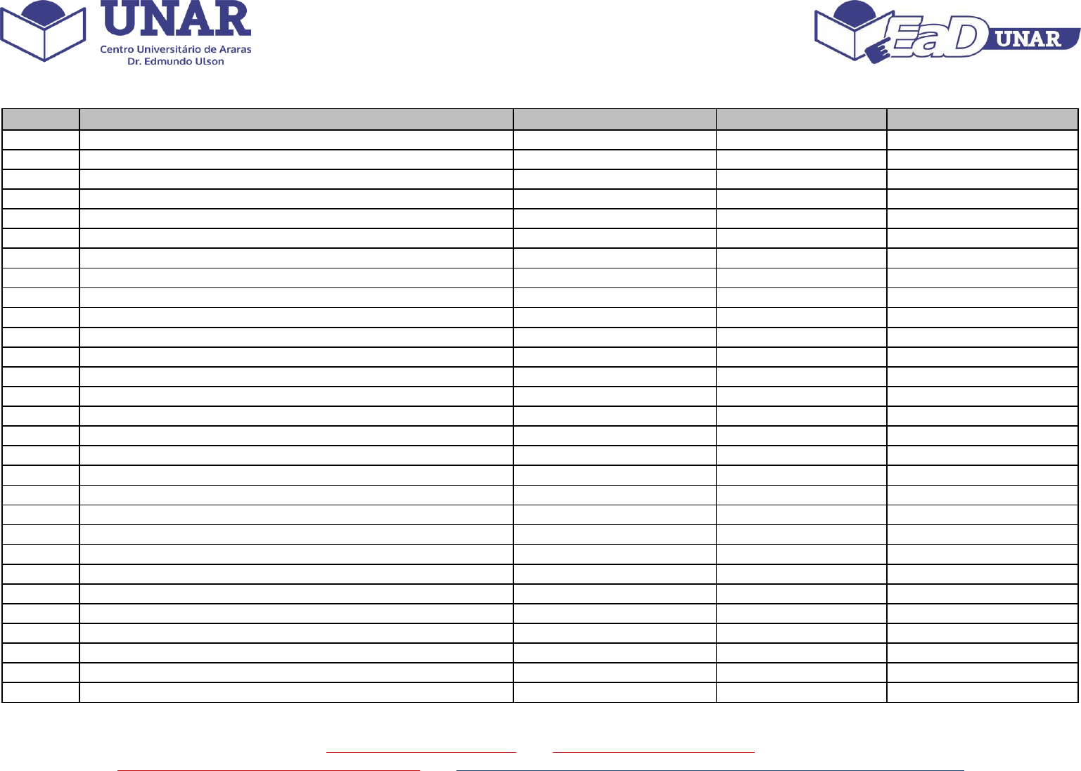 <p>PROVA PRESENCIAL OBRIGATÓRIA (EAD)</p><p>29/06/2019 - 9H ÀS 14H</p><p>TURMAS 191, 183, 181, 173, 171, 163, 161, 153 E 151</p><p>RA NOME CURSO POLO LOCAL DA PROVA</p><p>1850357 ADAIAS MICAEL DUARTE DOS SANTOS PEDAGOGIA RECIFE SALA 01</p><p>1931513 ADELMA CLAUDIA RIZZI PEDAGOGIA MINEIROS SALA 01</p><p>1650167 ADEMAR SOUSA DE OLIVEIRA JUNIOR ADMINISTRAÇÃO ARARAS NOBRÃO BL 01 - FILEIRA 01</p><p>1530127 ADEMIR DEMETRIO JUNIOR ARTES VISUAIS ARARAS NOBRÃO BL 01 - FILEIRA 01</p><p>1930640 ADEMIR MATEUS DE OLIVEIRA SOCIOLOGIA BELO HORIZONTE SALA 01</p><p>1931289 ADENASIA ALVES DE SOUZA SOCIOLOGIA BELO HORIZONTE SALA 01</p><p>1931623 ADENILZA JOSE DE OLIVEIRA SANTANA GEOGRAFIA DOURADOS SALA 01</p><p>1830874 ADMILSON GUERREIRA RECURSOS HUMANOS RIO CLARO SALA 01</p><p>1931026 ADRIANA APARECIDA CEZARIO DA SILVA XAVIER ARTES VISUAIS RIBEIRÃO PRETO 02 SALA 01</p><p>1830880 ADRIANA APARECIDA DA PAIXAO ANTUNES LETRAS PIRAJÚ SALA 01</p><p>1930246 ADRIANA CAROLINE DE OLIVEIRA LOPES PEDAGOGIA ITARARÉ SALA 01</p><p>1930360 ADRIANA DE ANDRADE PEDAGOGIA MARÍLIA SALA 01</p><p>1930725 ADRIANA DE OLIVEIRA SOCIOLOGIA RIO BOM SALA 01</p><p>1930037 ADRIANA EDUARDO VIANA PEDAGOGIA CAMPINAS SALA 01</p><p>1931170 ADRIANA FELICIANA DOS SANTOS PEDAGOGIA RECIFE SALA 01</p><p>1850023 ADRIANA FERREIRA RODRIGUES DOS SANTOS SILVA PEDAGOGIA SÃO JOSÉ DOS CAMPOS SALA 01</p><p>1830768 ADRIANA LINGOSKI CASTRO PEDAGOGIA ARIPUANÃ SALA 01</p><p>0001650 ADRIANA PAULA GERVASIO RODRIGUES ROSSETO ARTES VISUAIS SÃO PAULO - TATUAPÉ SALA 01</p><p>1730405 ADRIANA PEPE COSTA NASCIMENTO CIÊNCIAS CONTÁBEIS SÃO JOSÉ DO RIO PRETO SALA 01</p><p>1931591 ADRIANA PEREIRA FIAIS BICUDO PEDAGOGIA CAFELÂNDIA SALA 01</p><p>1850001 ADRIANA RIBEIRO DOS SANTOS MELO PEDAGOGIA ITARARÉ SALA 01</p><p>1500160 ADRIANA RODRIGUES DOS SANTOS ARTES VISUAIS ARARAS NOBRÃO BL 01 - FILEIRA 01</p><p>1930764 ADRIANA SANCHES MARCHI ARTES VISUAIS LINS SALA 01</p><p>1930536 ADRIANA SOSSAI POLTRONIERI PEDAGOGIA ARARAS NOBRÃO BL 01 - FILEIRA 01</p><p>1850459 ADRIANE CORREA BRITO PEDAGOGIA BELO HORIZONTE SALA 01</p><p>1830324 ADRIANO MASCARENHA DA SILVA CIÊNCIAS CONTÁBEIS ARARAS NOBRÃO BL 01 - FILEIRA 01</p><p>1931083 ADRIELE MELISSA BONORA RODRIGUES PEDAGOGIA FERNANDÓPOLIS SALA 01</p><p>1850753 ADRIELLY FERREIRA MORAES DA SILVA PEDAGOGIA TRÊS LAGOAS SALA 01</p><p>1930230 ADRIELLY RIBEIRO ADMINISTRAÇÃO SALGADO FILHO SALA 01</p><p>TOLERÂNCIA PARA ATRASO: 1H - ENTRADA PERMITIDA: ATÉ ÀS 10H</p><p>TRAZER UM DOCUMENTO COM FOTO (RG OU CNH) - ** NOVO ENDEREÇO DO POLO E LINK DOS ENDEREÇOS DOS POLOS NA ÚLTIMA FOLHA 1 / 82</p><p>PROVA PRESENCIAL OBRIGATÓRIA (EAD)</p><p>29/06/2019 - 9H ÀS 14H</p><p>TURMAS 191, 183, 181, 173, 171, 163, 161, 153 E 151</p><p>RA NOME CURSO POLO LOCAL DA PROVA</p><p>1930437 ADRIELY VENTURINI ROSSI LOGÍSTICA RIO BOM SALA 01</p><p>1760054 ADRILAINE LUZIA SOARES PEDAGOGIA ITARARÉ SALA 01</p><p>1930036 AFONSO ERONILSON DE MELO PEDAGOGIA BELO HORIZONTE SALA 01</p><p>1931478 AIDA NEVES DA SILVA PEDAGOGIA SÃO SEBASTIÃO DE UATUMA SALA 01</p><p>1930384 AILTON FARIA ARTES VISUAIS CAMPINAS SALA 01</p><p>1931277 ALAN GLEIDSON MARCIEL SILVA SOCIOLOGIA BELO HORIZONTE SALA 01</p><p>1830212 ALANA RAMOS GRAYEB PEDAGOGIA ARARAS NOBRÃO BL 01 - FILEIRA 01</p><p>1850788 ALANA SCABENI ARTES VISUAIS CHOPINZINHO SALA 01</p><p>1850613 ALANNA EVELYN DA SILVA LETRAS APIAÍ SALA 01</p><p>1930805 ALDA SONIA CASTRO DE OLIVEIRA PEDAGOGIA SÃO SEBASTIÃO DE UATUMA SALA 01</p><p>1931433 ALDENIR DA SILVA MOREIRA LETRAS SÃO SEBASTIÃO DE UATUMA SALA 01</p><p>1930504 ALDENIR DUTRA COUTINHO ARTES VISUAIS ARACRUZ SALA 01</p><p>1930906 ALDINEIA ALVES ROLIM ARTES VISUAIS DOURADOS SALA 01</p><p>1831126 ALESANDRO MARTINS DA SILVA PEDAGOGIA TRÊS LAGOAS SALA 01</p><p>1930930 ALESSANDRA ALONSO ARTES VISUAIS RIBEIRÃO PRETO 02 SALA 01</p><p>1931502 ALESSANDRA ALVES PENTEADO ARTES VISUAIS RIBEIRÃO PRETO 02 SALA 01</p><p>1830214 ALESSANDRA APARECIDA AVELINO DOS SANTOS CUSTODIO DA SILVA GEOGRAFIA SÃO CARLOS SALA 01</p><p>1830410 ALESSANDRA APARECIDA GONCALVES PEDAGOGIA RIO BOM SALA 01</p><p>1930902 ALESSANDRA CARDOSO VALDERINO SILVA ARTES VISUAIS DOURADOS SALA 01</p><p>1930790 ALESSANDRA CRISTINA PINTO RODRIGUES PEDAGOGIA CAMPINAS SALA 01</p><p>1850207 ALESSANDRA DA PONTE FURTADO DELAI PEDAGOGIA ARARAS NOBRÃO BL 01 - FILEIRA 01</p><p>1931690 ALESSANDRA DE ANDRADE RIBEIRO SOCIOLOGIA RIBEIRÃO PRETO 01 SALA 01</p><p>1930090 ALESSANDRA FAUSTINA DA SILVA PEDAGOGIA MINEIROS SALA 01</p><p>1630047 ALESSANDRA FRANCISCO DE OLIVEIRA DA SILVA PEDAGOGIA ARARAS NOBRÃO BL 01 - FILEIRA 01</p><p>1930271 ALESSANDRA RIBEIRO SALOMAO PEDAGOGIA ANÁPOLIS SALA 01</p><p>1750090 ALESSANDRA RODRIGUES DE SOUSA PEDAGOGIA ARARAS NOBRÃO BL 01 - FILEIRA 02</p><p>1931027 ALESSANDRO DA CUNHA CARNEIRO CIÊNCIAS CONTÁBEIS SÃO SEBASTIÃO DE UATUMA SALA 01</p><p>1930086 ALESSANDRO DE LUCA PEREIRA HISTÓRIA DOURADOS SALA 01</p><p>00022197 ALESSANDRO GALVAO PINHEIRO PEDAGOGIA ITARARÉ SALA 01</p><p>TOLERÂNCIA PARA ATRASO: 1H - ENTRADA PERMITIDA: ATÉ ÀS 10H</p><p>TRAZER UM DOCUMENTO COM FOTO (RG OU CNH) - ** NOVO ENDEREÇO DO POLO E LINK DOS ENDEREÇOS DOS POLOS NA ÚLTIMA FOLHA 2 / 82</p><p>PROVA PRESENCIAL OBRIGATÓRIA (EAD)</p><p>29/06/2019 - 9H ÀS 14H</p><p>TURMAS 191, 183, 181, 173, 171, 163, 161, 153 E 151</p><p>RA NOME CURSO POLO LOCAL DA PROVA</p><p>1830007 ALESSANDRO PERUZZO CIÊNCIAS CONTÁBEIS SÃO PAULO - TATUAPÉ SALA 01</p><p>1930002 ALEX JUNIOR CLAUDIO ADMINISTRAÇÃO APIAÍ SALA 01</p><p>1740367 ALEX JUSTINIANO PAULA GEOGRAFIA SÃO PAULO - TATUAPÉ SALA 01</p><p>1850602 ALEX SANDRO APARECIDO CORDEIRO RECURSOS HUMANOS ARIPUANÃ SALA 01</p><p>1931366 ALEXANDER HENRIQUE LUIZ MARRARA FILOSOFIA ARARAS NOBRÃO BL 01 - FILEIRA 02</p><p>1930745 ALEXANDRE DE SOUZA GOMES ARTES VISUAIS CARIACICA SALA 01</p><p>1850422 ALEXANDRE EVARISTO JUNIOR GEOGRAFIA CARIACICA SALA 01</p><p>1930489 ALEXANDRE MESSIAS RODRIGUES FILOSOFIA MARINGÁ SALA 01</p><p>1930760 ALEXANDRE VICTOR ROMERO FILOSOFIA 
