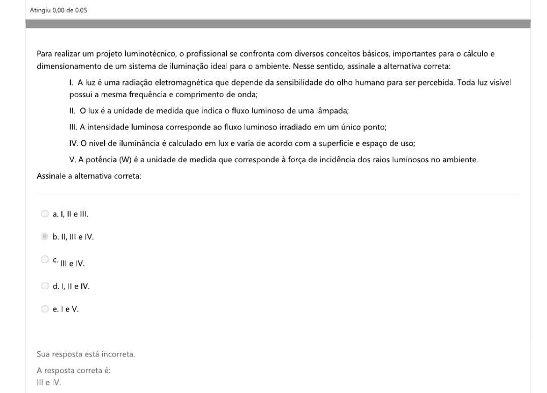 <p>Atingiu 0,00 de 0,05 Para realizar um projeto luminotécnico, profissional se confronta com diversos conceitos básicos, importantes para cálculo e dimensionamento de um sistema de iluminação ideal para ambiente. Nesse sentido, assinale a alternativa correta: I. A luz é uma radiação eletromagnética que depende da sensibilidade do olho humano para ser percebida. Toda luz visível possui a mesma frequência e comprimento de onda; II. lux é a unidade de medida que indica fluxo luminoso de uma lâmpada; III. A intensidade luminosa corresponde ao fluxo luminoso irradiado em um único ponto; IV. nível de iluminância é calculado em lux e varia de acordo com a superfície e espaço de uso; V. A potência (W) é a unidade de medida que corresponde à força de incidência dos raios luminosos no ambiente. Assinale a alternativa correta: a. III. b. II, III e IV. C. III e IV. V. Sua resposta está incorreta. A resposta correta é: III IV.</p>