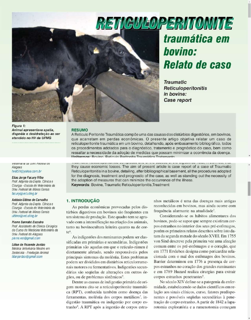<p>RETICULOPERITONITE traumática em bovino: Relato de caso Traumatic Reticuloperitonitis in bovine: Case report Figura 1: Animal apresentava apatia, RESUMO dispnéia e desidratação ao ser A Retículo Peritonite Traumática compõe uma das causas dos distúrbios digestórios, em atendido no HV da UFMG que acarretam em perdas o presente artigo objetiva relatar um caso de reticuloperitonite traumática em um bovino, após embasamento todos os procedimentos adotados para o diagnóstico, tratamento e prognóstico do bem como ressaltar a necessidade da de medidas que possam minimizar a ocorrência da doença. Reticulo Alagoas they cause economic losses. The aim of present article is case report of a case of Traumatic Reticuloperitonitis in a detailing, after bibliographical basement, all the procedures adopted Elias Jorge Facury Filho for the diagnosis, treatment and prognostic of the case. as well as standing out the necessity of Prof. Adjunto do Depto. Clinica e the adoption of measures that can minimize the occurrence of the Cirurgia Escola de da Keywords: Bovine, Traumatic Reticuloperitonitis,Treatment Univ. Federal de Minas Gerais facury@vet.ufmg.br Antônio Ultimo de Carvalho 1. INTRODUÇÃO nhos metálicos é uma das doenças mais antigas Prof. Adjunto do Depto. Clinica e Cirurgia Escola de Veterinária da As perdas econômicas provocadas pelos dis- reconhecidas em bovinos. mas ainda ocorre com Univ. Federal de Minas Gerais túrbios digestivos em bovinos são frequentes em frequência alarmante na um sistema de produção. Este quadro tem se agra- Considerando-se os hábitos alimentares dos Pierre Escodro vado com a intensificação na criação dos animais. bovinos. pode-se supor que sempre existiram cor- Prof. Assistente de Cirúrgica tanto na bovinocultura leiteira quanto na de cor- pos estranhos no interior dos seus do Curso de Medicina da porém os primeiros relatos descritos sobre isto da- Univ. Federal de Alagoas As indigestões dos ruminantes podem ser clas- tam da segunda metade do século XVIII. Em 1755 pierre.vet@gmail.com sificadas em primárias e Indigestões von Sind descreve pela primeira vez uma afecção Lilian de Rezende Jordão Médica Mestre em primárias são aquelas em que o reticulo-rúmen é comum entre os pré-estômagos e o coração, que Zootecnia Produção Animal diretamente afetado, sendo responsáveis pelos em 1771 Erxleben designa como pericardite rela- principais sintomas da moléstia. Estes problemas cionada com o mal dos estômagos dos bovinos. podem ser divididos em distúrbios reticulorrume- Barrier determinou em 1776 a presença de cor- nais motores ou fermentativos. Indigestões secun- pos estranhos no coração dos grandes ruminantes dárias são seqüelas de alterações em outros e em 1789 Huzard realiza cirurgias para extrair gãos, ou de problemas corpos estranhos Dentre as causas de indigestão primária de ori- No século XIV define-se a patogenia da enfer- gem motora cita-se a reticuloperitonite traumáti- estabelecendo-se dados científicos ca conhecida também como doença das lação aos sinais curso, fatores predispo- moléstia dos corpos in- nentes e possíveis seqüelas secundárias à pene- digestão traumática ou indigestão por corpo es- tração do corpo A partir de 1842 a lapa- tranho8. A RPT após a ingestão de corpos estra- rotomia exploratória e a rumenotomia começam</p><p>a ser empregadas na confirmação do diag- locais (alimentação com resíduos industri- Bovinos com pleurite ou pericardite nóstico e como tratamento das reticulites ais), além do estado de conservação e ma- após perfuração por corpo estranho normal- traumáticas. Diversos trabalhos posteriores nutenção de equipamentos da fazenda como mente apresentam-se depressivos, com ta- ocuparam-se em desenvolver métodos es- carretas, desintegradores, ensiladeiras, va- quicardia e febre. A pleurite manifesta-se peciais de exame (radiografia, ultrassono- gão forrageiro, etc6. rapidamente, caracterizada por respiração grafia), além de aprimoramento das técni- superficial, sons pulmonares abafados e cas cirúrgicas. Na década de 80 ganhou 2.2. Patogenia e sinais clínicos possibilidade de presença de estertores. Pe- importância a utilização de imãs A ingestão do corpo estranho e subse- ricardite traumática é caracterizada por aba- cos colocados no interior do retículo dos qüente penetração na parede reticular, leva famento dos ruídos cardíacos, estase posi- bovinos8. ao desenvolvimento de uma reação infla- tiva da veia jugular e formação de edema Apesar de todas as medidas matória localizada e aguda (peritonite). Se nas partes baixas do corpo. Estas compli- cas, os prejuízos econômicos causados por a penetração ocorrer somente nas dobras cações indicam um prognóstico desfavorá- corpos estranhos são grandes, sendo tão im- da parede do órgão, curso da doença será vel e o animal pode morrer subitamente em portantes quanto os originados por enfer- brando, com inapetência temporária e re- decorrência de perfuração do miocárdio, midades infecciosas. Deve-se considerar dução na produção de Os sintomas produzindo hemorragia intensa no interi- que além do dano visível por perda total ou são extremamente variáveis e diretamente or do saco sacrifício obrigatório, a indigestão traumá- influenciados pela região anatômica da o prognóstico em relação à sobrevivên- tica causa perdas por mau aproveitamento perfuração dentro do retículo, sua profun- cia e retorno a produção de leite para a mai- alimentar, diminuição da produção leiteira didade, pela lesão visceral abdominal ou oria das vacas com RPT é bom, porém e dificuldade para recuperação do peso e torácica associada e pelas características mesmo estará diretamente relacionado com reprodução dos animais8. físicas do objeto causador a extensão e localização das lesões provo- presente artigo objetiva relatar um A forma clássica da do