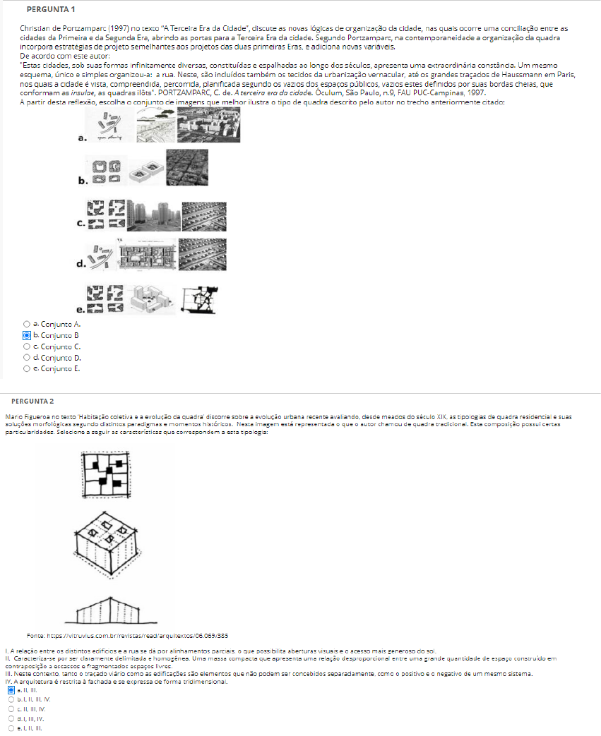 <p>PERGUNTA 1 Christian de (1997) no texto "A Terceira Era da Cidade", discute as novas lógicas de organização da cidade, nas quais ocorre uma conciliação entre as cidades da Primeira e da Segunda Era, abrindo as portas para a Terceira Era da cidade. Segundo na contemporaneidade a organização da quadra incorpora estratégias de projeto semelhantes aos projetos das duas primeiras Eras, e adicional novas De acordo com este autor: "Estas cidades, sob suas formas infinitamente diversas, constituídas e espalhadas ao longo dos apresenta uma extraordinária constância Um mesmo esquema, único e simples organizou-a: a rua. Neste, são incluídos também os tecidos da urbanização vernacular, até os grandes traçados de Haussmann em Paris, nos quais a cidade é vista, compreendida, percorrida, planificada segundo os vazios dos espaços públicos, vazios estes definidos por suas bordas cheias, que conformam as as quadras A terceira era do cidade. Óculum, São Paulo, FAU PUC-Campinas, 1997. A partir desta reflexão, escolha conjunto de imagens que melhor ilustra o tipo de quadra descrito pelo autor no trecho anteriormente a. b. d. e. a. Conjunto A. b.Conjunto B Conjunto C. d. Conjunto D. e. Conjunto E. PERGUNTA 2 Mario Figueroa no texto coletiva e a evolução da quadra discorre sobre a evolução urbana recente desde meados do século as tipologias de quadra residencial e suas soluções morfológicas segundo distintos paradigmas e momentos Nesta imagem está representada o que o autor chamou de quadra tradicional Esta composição possui certas Selecione a seguir as características que correspondem a esta tipologia: A relação entre os distintos edifícios a rua se dá por alinhamentos que possibilita aberturas visuais e acesso mais generoso do sol. Caracteriza-se por ser claramente delimitada e homogênea Uma massa compacta que apresenta uma relação desproporcional entre uma grande quantidade de espaço construído em contraposição a escassos e fragmentados espaços livres. III. Neste tanto o traçado viário como as edificações são elementos que não podem ser concebidos como positivo e negativo de um mesmo IV. A arquitetura é restrita à fachada e se expressa de forma III. IV. IV.</p><p>PERGUNTA 3 A urbanização contemporânea inclui novas formas de implantação e relações entre edifício e cidade que se manifestam sobre desenho dos espaços comuns e configuração dos alinhamentos. A respeito dos modelos atuais de quadra aberta, tais como os utilizados no setor Massena, do projeto Paris Rive Gauche e Almere, pode-se dizer que: Fonte: a. Valorizam o acesso pedonal e a permeabilidade no miolo de quadra, mas tendem a uma uniformidade volumétrica. b. Os espaços livres tendem a se distribuir em diferentes espaços hierarquizados, mas os térreos são fechados para promover segurança. Os edifícios possuem alinhamentos parciais e tendem a ocupar a testada do lote, trazendo atividade para as d. Caracterizam-se pela monofuncionalidade, apesar de valorizarem a diversidade de e. Apresentam uma arquitetura homogênea e bem integrada com o entorno. PERGUNTA 4 Atualmente, os grandes centros urbanos estão sendo caracterizados por alto adensamento, verticalização, e há edifícios que estão acompanhando as demandas desses processos, oferecendo funções de diversos que geram presença de pessoas em horários diferentes, com espaços abertos no térreo e que reúnem subsídios para uma melhor qualificação urbana. Esses edifícios dotados de múltiplas funções podem garantir a diversidade, e fazem com que convívio entre distintas atividades, como morar, trabalhar, passear, comprar, conviver e outras, se tornem a base da vitalidade do espaço. Com respeito a este tema, relacione as imagens e as afirmações a seguir e avalie quais são corretas: https://www.archdaily.com.br/br/806566/maison-ste phane-hessel-jds-architects Conjunto Nacional pode ser considerado o primeiro edifício multiuso do Brasil. II. o Conjunto Nacional é um prédio localizado no Rio de Janeiro que se destaca pela mistura de usos, e por conter uma escola, um centro comercial e uma lâmina de edifício de escritórios. projeto também é reconhecido pela boa qualidade do pavimento térreo, altamente permeável, e pela presença de um terraço jardim onde diferentes públicos interagem. III. o edifício Maison Stephane Hessel, de JDS Architects, em Lille na França, representa um bom exemplo de edifício por que mistura atividades variadas que se integram em uma praça central. E, ao mesmo tempo em que estabelece uma boa relação com a rua, constrói acessos bem marcados. Escolha a alternativa que indique as afirmações corretas: a III. III. e</p><p>PERGUNTA 5 Conjunto Nacional é um edifício multifuncional de autoria do arquiteto David Libeskind e se caracteriza por ser um dos primeiros grandes edifícios modernos multifuncionais implantados na cidade de São Paulo. Em 2005, a edificação foi tombada pelo Condephaat conselho estadual de defesa do patrimônio histórico e arquitetônico. Fonte: Sobre esta obra, é correto afirmar que: I. Tem diferentes distribuídos segundo o tipo de uso. II. Tem uma planta tipo que se repete desde o pavimento III. complexo caracteriza-se pela mistura de diferentes usos: institucional, creche e PERGUNTA 6 o complexo Brascan Century Plaza, no bairro Itaim em São Paulo, é composto por três torres integradas por espaços livres de acesso público. Os acessos dos pedestres no térreo ocorrem basicamente por três entradas, uma em cada rua, e se configura como um da arquitetura multifuncional Sobre este projeto, é correto afirmar que: I. Possui um sistema de espaços livres bem organizado e hierarquizado, distribuído em 3 praças de tamanhos Possui um cinema no bloco central, que atrai vida urbana durante a III. Não apresenta grande variação de uso, já que mistura essencialmente atividades de serviços, e umas poucas lojas IV. Corresponde a um tipo de quadra con