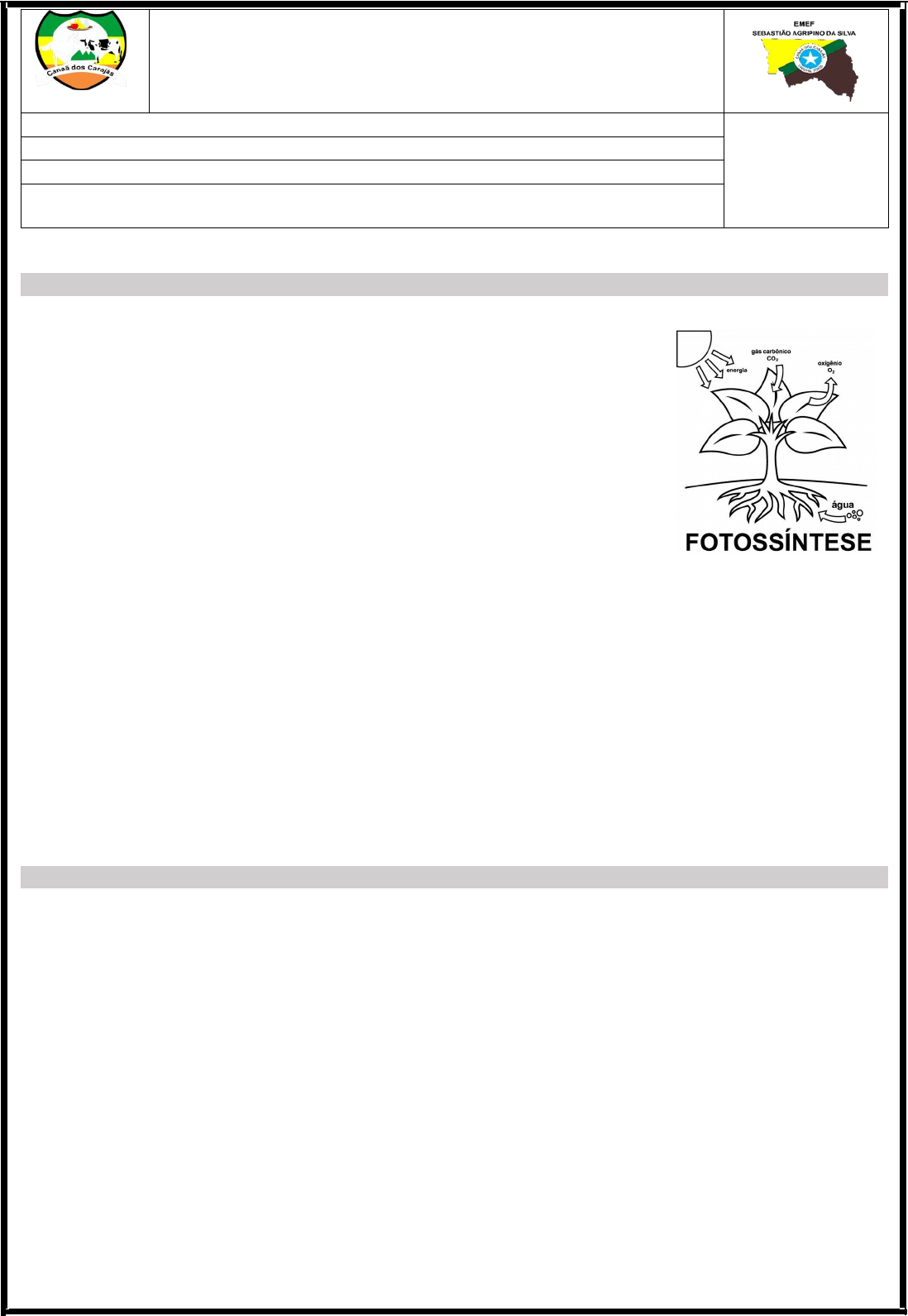 <p>PREFEITURA MUNICIPAL DE CANAÃ DOS CARAJÁS</p><p>SECRETARIA MUNICIPAL DE EDUCAÇÃO – SEMED</p><p>EMEF. SEBASTIÃO AGRIPINO DA SILVA</p><p>Aluno(a):</p><p>Avaliação:</p><p>Atividades:</p><p>Média Geral:</p><p>Professor(a):</p><p>Data: / /2024 Ano Escolar: 2º Turma: Turno:</p><p>Avaliação de Ciências - 2º Bimestre</p><p>QUESTÃO 01</p><p>(EF02CI06) AS PLANTAS PRECISAM DE ÁGUA, LUZ E GÁS CARBÔNICO PARA CRESCER. ELAS UTILIZAM A LUZ DO SOL E A ÁGUA NO PROCESSO DE FOTOSSÍNTESE PARA PRODUZIR SUA PRÓPRIA ALIMENTAÇÃO. CONSIDERANDO A IMPORTÂNCIA DA ÁGUA E DA LUZ, MARQUE A OPÇÃO DE COMO A FALTA DESSES DOIS FATORES ESSENCIAIS PARA O DESENVOLVIMENTO DAS PLANTAS PODE PREJUDICAR A REALIZAÇÃO DA FOTOSSÍNTESE. (0,5)</p><p>a) A FALTA DE LUZ E ÁGUA IMPEDE A REALIZAÇÃO DA FOTOSSÍNTESE, PREJUDICANDO A PRODUÇÃO DE ALIMENTOS E O CRESCIMENTO DAS PLANTAS.</p><p>b) O EXCESSO DE ÁGUA PODE ACELERAR A FOTOSSÍNTESE, RESULTANDO EM UM CRESCIMENTO MAIS RÁPIDO DAS PLANTAS.</p><p>c) A LUZ DO LUAR É SUFICIENTE PARA GARANTIR A REALIZAÇÃO DA FOTOSSÍNTESE PELAS PLANTAS DURANTE A NOITE.</p><p>d) SE AS PLANTAS RECEBEREM APENAS ÁGUA, SEM A PRESENÇA DE LUZ SOLAR, ELAS PODERÃO CONTINUAR A CRESCER NORMALMENTE.</p><p>QUESTÃO 02</p><p>(EF02CI05) OBSERVE A TIRINHA ABAIXO:</p><p>O QUE MILENA, ESTÁ FAZENDO? (0,5)</p><p>a) MILENA ESTÁ PLANTANDO UMA FLOR.</p><p>b) MILENA ESTÁ CUIDANDO DO SOLO.</p><p>c) MILENA ESTÁ PLANTANDO UMA ÁRVORE.</p><p>d) MILENA ESTÁ BRINCANDO COM O COELHO DA MÔNICA.</p><p>QUESTÃO 03</p><p>(EF02CI04)</p><p>OS SERES VIVOS</p><p>https://www.tudosaladeaula.com/2023/02/atividade-sobre-os-seres-vivos-e-nao-vivos-com-texto-e-gabarito.html</p><p>SÃO AQUELES QUE NASCEM, CRESCEM, SE REPRODUZEM E MORREM, COMO AS PESSOAS, AS ÁRVORES E OS ANIMAIS. OS SERES VIVOS SÃO DEFINIDOS COMO ORGANISMOS QUE REÚNEM PROPRIEDADES INDISPENSÁVEIS, POSSIBILITANDO DIFERENCIÁ-LOS DOS SERES NÃO VIVOS. ASSIM, UMA PLANTA, POR EXEMPLO, É UM SER VIVO, POIS TEM PROPRIEDADES, COMO NASCIMENTO, CRESCIMENTO, REPRODUÇÃO E ORGANIZAÇÃO CELULAR.</p><p>MARQUE A ALTERNATIVA QUE APRESENTA SOMENTE EXEMPLOS DE SERES VIVOS. (0,5)</p><p>a) TEMPERATURA, UMIDADE, TERRA E SOLO.</p><p>b) FUNGO, ÁRVORE, ELEFANTE E PORCO.</p><p>c) VEGETAL, ANIMAL, ÁGUA E HOMEM.</p><p>d) CHUVA, SOLO, PLANTA E HOMEM.</p><p>QUESTÃO 04</p><p>(EF02CI04)</p><p>OS SERES NÃO VIVOS</p><p>https://www.tudosaladeaula.com/2023/02/atividade-sobre-os-seres-vivos-e-nao-vivos-com-texto-e-gabarito.html</p><p>SERES NÃO VIVOS SÃO TODOS OS SERES INANIMADOS, POIS NÃO TÊM VIDA. ESTES INCLUEM A TERRA, O AR, O SOLO E AS PEDRAS. TODOS ESSES SÃO SERES NÃO VIVOS, JÁ QUE NÃO NASCEM, NÃO CRESCEM E NÃO MORREM, ENTRETANTO, FAZEM PARTE DA NATUREZA. A ÁGUA, POR EXEMPLO, NÃO TEM VIDA, TODAVIA, QUEM MORA NA ÁGUA POSSUI VIDA, COMO AS PLANTAS AQUÁTICAS E OS PEIXES.</p><p>OS SERES NÃO VIVOS TAMBÉM FAZEM PARTE DA NATUREZA, PORÉM ELES</p><p>a. NÃO IMPORTAM.</p><p>b. NÃO MORREM.</p><p>c. SE REPRODUZEM.</p><p>d. PRECISAM RESPIRAR.</p><p>QUESTÃO 05</p><p>(EF02CI04) ALGUNS ANIMAIS FORAM DOMESTICADOS PELO SER HUMANO E, ASSIM, PASSARAM A APRESENTAR COMPORTAMENTOS QUE LHES POSSIBILITAM CONVIVER COM AS PESSOAS. POR APRESENTAREM ESSAS CARACTERÍSTICAS, ELES SÃO CHAMADOS ANIMAIS DOMESTICADOS.</p><p>OS ANIMAIS CRIADOS PELO SER HUMANO PRECISAM RECEBER ALGUNS CUIDADOS.</p><p>IDENTIFIQUE O CUIDADO COM O ANIMAL APRESENTADO EM CADA FOTO. PARA ISSO, ENUMERE CADA CUIDADO DE ACORDO COM O QUE A FOTO REPRESENTA. (0,5)</p><p>( ) ASSISTÊNCIA VETERINÁRIA.</p><p>( ) ALOJAMENTOS ADEQUADOS.</p><p>( ) VACINAÇÃO CONTRA DOENÇAS.</p><p>( ) ALIMENTAÇÃO ADEQUADA.</p><p>QUESTÃO 06</p><p>(EF02CI04) DESDE A ANTIGUIDADE, O SER HUMANO TEM UMA RELAÇÃO PRÓXIMA COM OS ANIMAIS. OS EGÍPCIOS REGISTRARAM ESSA RELAÇÃO POR MEIO DE PINTURAS E DESENHOS.</p><p>OBSERVE A SEGUIR A IMAGEM DE UMA DESSAS PINTURAS.</p><p>Pintura egípcia na tumba de Nebamun, no Egito, criada em 1350 a.C.</p><p>ESSA IMAGEM REPRESENTA UMA CRIAÇÃO DE: (0,5)</p><p>a. CAVALOS</p><p>b. GALINHAS</p><p>c. PORCOS</p><p>d. BOIS</p><p>QUESTÃO 07</p><p>(EF02CI04) OS ANIMAIS TÊM SEUS ABRIGOS NA NATUREZA. ESSES ABRIGOS PODEM SER EM ÁRVORES, NA TERRA, NA ÁGUA E É CHAMADO DE HÁBITAT. EXISTEM ANIMAIS QUE CHAMAMOS DE TERRESTRES PORQUE NASCEM E VIVEM NA TERRA. SEU HÁBITAT É O SOLO. OS QUE HABITAM AS ÁGUAS SÃO CHAMADOS DE AQUÁTICOS.</p><p>COLOQUE AS CLASSIFICAÇÕES AQUÁTICAS OU TERRESTRES NOS ANIMAIS ABAIXO, DE ACORDO COM O SEU HÁBITAT. (1,0)</p><p>QUESTÃO 08</p><p>(EF02CI04) OS INVERTEBRADOS SÃO ENCONTRADOS NOS MAIS VARIADOS AMBIENTES, NÃO SENDO POSSÍVEL DESCREVER APENAS UM HABITAT PARA ESSAS ESPÉCIES. ENCONTRAMO-LOS, POR EXEMPLO, NO AMBIENTE MARINHO E DE ÁGUA DOCE E NO AMBIENTE TERRESTRE. OS ANIMAIS INVERTEBRADOS PODEM OCUPAR DIFERENTES HABITAT, SENDO O AQUÁTICO UM DELES. EXISTEM ESPÉCIES QUE VIVEM EM ÁGUA DOCE E TAMBÉM EM ÁGUA SALGADA E SALOBRA.</p><p>ESCREVA O NOME DESTES ANIMAIS MARINHOS. (1,0)</p><p>QUESTÃO 09</p><p>(EF02CI04) OS MAMÍFEROS SÃO ANIMAIS QUE SE DESTACAM PELA PRESENÇA DE PELOS E GLÂNDULAS MAMÁRIAS, AS QUAIS PRODUZEM LEITE, ALIMENTO ESSENCIAL PARA OS FILHOTES.</p><p>ESCREVA O NOME DESTE ANIMAL MAMIFERO MARINHO. (1,0)</p><p>_________________________________________________________</p><p>QUESTÃO 10</p><p>(EF02CI04) OBSERVE ESTA CENA E RESPONDA AO QUE SE PEDE.</p><p>A CENA ACIMA REPRESENTA:</p><p>a. VIDA MARINHA</p><p>b. VIDA TERRESTRE</p><p>image3.jpeg</p><p>image4.png</p><p>image5.png</p><p>image6.png</p><p>image7.png</p><p>image8.png</p><p>image9.png</p><p>image10.png</p><p>image11.jpeg</p><p>image12.jpeg</p><p>image1.png</p><p>image2.png</p>