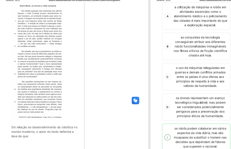 <p>Sobre os drones vidas humanas a utilização de máquinas e robôs e Na missão espacial mais ambiciosa dos atividades essenciais como Curiosity pousou recentemente no solo marciano um ambiente inóspito para seres hu- A atendimento médico e policiamen manos A imagem da conquista de umplaneta longin- por uma dois sonhos de ficção das cidades é mais importante do cientifica - a criação de exploração espa- cial que pousou em Marte é apenas o exem a exploração plo mais recente e eloquente de uma realidade que tempos dos livros e filmes para entrar em nosso dia a dia mais de 8 milhões de aqui mesmo na Terra em atividades tão distintas quanto as conquistas da tecnologia aspirar da auxiliar médicos em cirurgias dirigir vigiar as fronteiras conseguiram atribuir aos diferente - em seu uso mais controverso - matar inimigos em armados B robôs funcionalidades Na os nos filmes e livros de ficção meçam a tomar conta de diferentes aspectos da criados até hoje. sa vida Até que ponto devemos a máquinas tarefas que consideramos essencialmente humanas 20 ou mesmo a tomada de decisões que envolvem vidas e valores fundamentais? Qual risco representado pelos drones os comandados a distan- uso de máquinas teleguiadas en conseguem exterminar inimigo com elevado grau de precisão? Que tipo de aplicação essa nova guerras e demais conflitos armado realidade tem sobre a sociedade e sobre a visão que temos de humanidade? C entre os países é uma ofensa aos questões representam um dos maiores princípios de respeito à vida e aos safos que deveremos enfrentar neste Serial valores da humanidade. um deixar de aproveitar as conquistas da para atividades tão rias quanto a policiamento ou mesmo a limpeza Mas também seria ingênuo acre- ditar que ou podem um dia nos subs- os drones representam um em decisões que envolvem menos um cálculo racional mais emoções ou crenças Parao tecnológico inigualável, mas poder prenunciam-se perguntas mais mais desafiadoras - e até ameaçadoras - do que aque- D ser considerados potencialmente las relativas ao uso de drones Perguntas cuja res- nenhum poderá perigosos para a preservação do princípios éticos da GUROVITZ Revista Epoca 13 Adaptado Em relação ao desenvolvimento da no os robôs podem colaborar em mundo moderno, O autor do texto defende a aspectos da vida diária, mas são tese de que: E incapazes de substituir homem in decisões que dependam de fatore que superem</p>