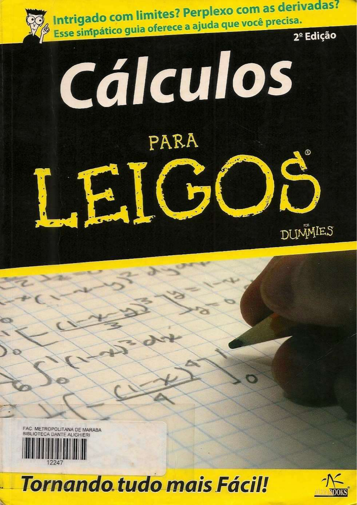 <p>Intrigado com limites? Perplexo com as derivadas? Esse simpático guia oferece a ajuda que você precisa. 2° Edição Cálculos PARA R DUMMIES FAC METROPOLITANA DE MARABA BIBLIOTECA DANTE ALIGHIERI 12247 Tornando.tudo mais Fácil! BOOKS</p><p>Leigos Fotha de Cola Tabela geométrica muito boa Todos os triângulos Setor do Cilindro circular reto, Prisma reto A = 1/2 base altura (pense no pedaço de pizza) ou caixa Área = Volume = A.h (A é a área da base) (0 é o ângulo central) = 4 Comprimento do arco= Área da superfície lateral = P. altura 360° Triângulo retângulo (Comprimento do arco é (P é 0 perímetro [ou Teorema de Pitágoras: comprimento da casca) circunferência] da base) (c é a hipotenusa) Esfera Geometria de Coordenadas Paralelogramo Área = base altura Dados dois pontos Área da superfície e Trapézio Inclinação = Área = base, + altura Cone da pirâmide 2 (base plana, topo pontudo) Distância= + Círculo Volume = 3 (A é a área da base) Ponto médio = X1 + 2 X2 V1 + 2 Circuferência = = Tabela trigonométrica rápida Trigonometria do retângulo Identidades Fórmulas SohCahToa: Fórmulas do ângulo-metade: 1 cosec sen A + 1 Fórmulas dos ângulos duplos: Graus e Radianos: Identidades quociente: sen20 = 2senOcos6 = 360° radianos = 60° radianos = 45° cos20 = - 1 = 180° Fórmulas de redução: radianos = 90° radianos = 30° 6 sen(-0) Para converter de radianos para 180° Identidade Pitagoreana: cos(-0) = graus, multiplique por 1 Para converter de graus para tg20+ 1 = radianos, multiplique por = cosec20 180°</p><p>de Cola Tabela elegante da derivada Regra do Regra do quociente: senx = COSX cosecx = cotgx 1 arccosx = -1 19. 1 dx arccosecx = Tabela elegante e útil da integral 1. 3. 5. 7. senxdx = 8. = 9. + 10. cotgxdx In senx + C 11. secxdx In +C 12. cosecxdx = In cosecx cotx + = 14. cosec2xdx = 15. secx tgx dx = secx + C 16. cosecx cotgx dx = - arcsen + C 19. X arcsec + C Para Leigos : Coleção de sucesso para iniciantes</p><p>Cálculos PARA LEIGOS Mark Ryan BIBLIOTECA ALIGHIERI de Registro: Tombo 12247 CDD: 555 Cutter: Forma de Aquisição: Data Aquisição: 10/11/09</p><p>BIBLIOTECA DANTE ALIGHIERI</p><p>Cálculos PARA LEIGOS Mark Ryan ALTA BOOKS Rio de Janeiro .2009</p><p>Cálculos para Leigos edição Calculus For Dummies Original English language edition Copyright 2003 by Wiley Publishing, Inc. by Mark Ryan. All rights reserved including the right of reproduction in whole or in part in any form. This translation published by arrangement with Wiley Publishing, Inc Cálculos para Leigos Edição original em português Copyright 2009 da Starlin Alta Con. Com. Ltda. Todos os direitos reservados incluindo o direito de reprodução total ou parcial, seja qual for a forma. A tradução publicada foi autorizada pela Wiley Publishing, Inc. Todos os direitos reservados e protegidos pela Lei 5988 de 14/12/73. Nenhuma parte deste livro, sem autorização prévia por escrito da editora, poderá ser reproduzida ou transmitida sejam quais forem os meios empregados: eletrônico, mecânico, fotográfico, gravação ou quais- quer outros. Todo o esforço foi feito para fornecer a mais completa e adequada informação, contudo a editora e o(s) autor(es) não assumem responsabilidade pelos resultados e usos da informação fornecida. Recomendamos aos leitores testar a informação, bem como tomar todos os cuidados necessários (como o backup), antes da efetiva utilização. Este livro não contém CD-ROM, disquete ou qualquer outra mídia. Erratas e atualizações: Sempre nos esforçamos para entregar a leitor, um livro livre de erros técnicos ou de conteúdo; porém, nem sempre isso é conseguido, seja por motivo de alteração de software, interpretação ou mesmo quando alguns deslizes constam na versão original de alguns livros que traduzimos. Sendo assim, criamos em nosso site, a seção Er- ratas, onde relataremos, com a devida correção, qualquer erro encontrado em nossos livros. Avisos e Renúncia de Direitos: Este livro é vendido como está, sem garantia de qualquer tipo, seja expressa ou implícita. Marcas Registradas: Todos os termos mencionados e reconhecidos como Marca Registrada e/ ou comercial são de responsabilidade de seus proprietários. A Editora informa não estar asso- ciada a nenhum produto e/ou fornecedor apresentado no livro. No decorrer da obra, imagens, nomes de produtos e fabricantes podem ter sido utilizados, e desde já a Editora informa que o uso é apenas ilustrativo e/ou educativo, não visando ao lucro, favorecimento ou desmereci- mento do produto/fabricante. Produção Editorial: Editora Alta Books Coordenação Editorial: Marcelo Utrine Coordenador Administrativo e Contratação: Anderson Câmara Tradução: Marcia Danielle Revisão: Carla Ayres Diagramação: Nathanael dos Santos Souza Revisão Técnica: Bruno Ceirão Fechamento: Equipe Alta Books Impresso no Brasil código de propriedade intelectual de 1° de Julho de 1992 proíbe expressamente o uso cole- tivo sem autorização dos detentores do direito autoral da obra, bem como a cópia ilegal do original. Esta prática generalizada nos estabelecimentos de ensino, provoca uma brutal baixa nas vendas dos livros a ponto de impossibilitar os autores de criarem novas obras. ALTA BOOKS Rua Viúva 291 Bairro Industrial do Jacaré Rio de Janeiro RJ CEP 20970-031 Tel: 21 3278-8069 Fax: 21 3277-1253</p><p>Sobre Autor Pós-graduado pela Universidade de Brown e pela Universidade de Direito de Wisconsin e membro do Conselho Nacional de Professores de Mark Ryan, vem ensinando matemática desde 1989. Ele dirige o Centro de Matemática em Winnetka, Illinois onde ensina nos cursos de matemática do ensino médio incluindo uma introdução ao cálculo e um workshop para os pais baseado em um programa que ele mesmo desenvolveu: Os 10 hábitos dos estudantes de matemática mais bem sucedidos. No ensino médio, ele conseguiu obter, duas vezes, uma pontuação de 800 na prova de matemática do SATE 