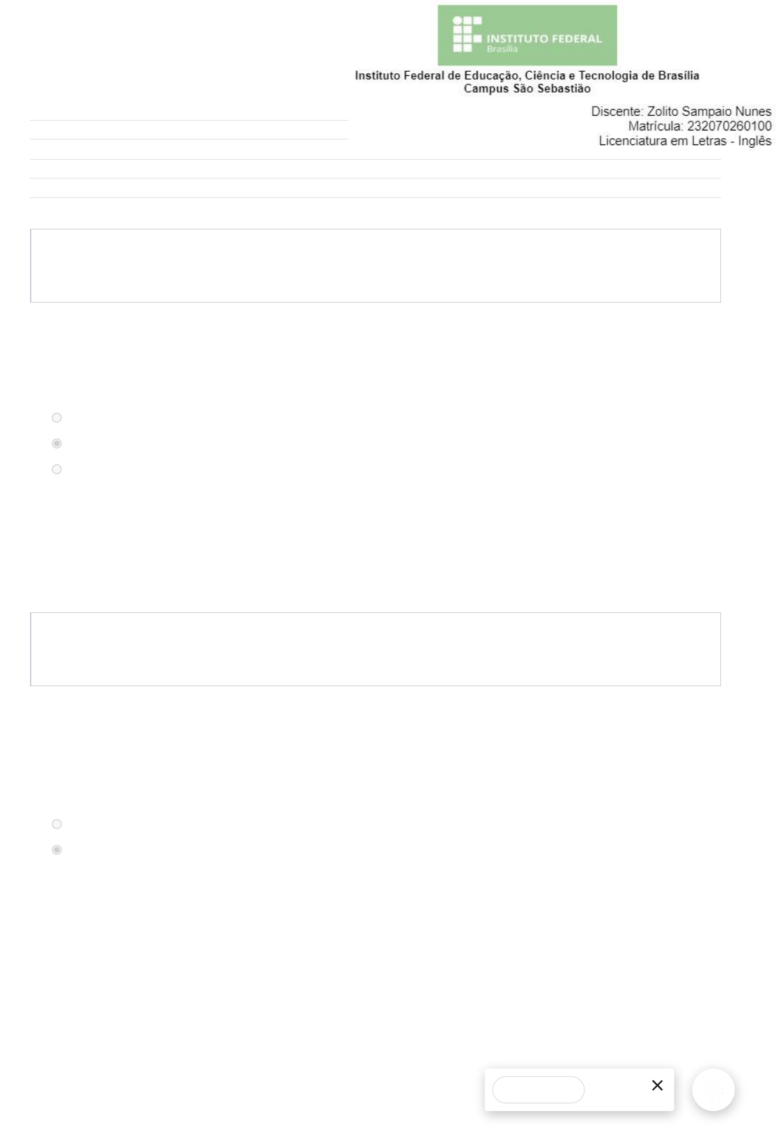 <p>Iniciado em sábado, 31 ago. 2024, 20:16</p><p>Estado Finalizada</p><p>Concluída em sábado, 31 ago. 2024, 20:26</p><p>Tempo empregado 10 minutos 1 segundo</p><p>Avaliar 10,000 de um máximo de 10,000(100%)</p><p>Questão 1</p><p>Correto</p><p>Atingiu 1,000 de 1,000</p><p>Questão 2</p><p>Correto</p><p>Atingiu 1,000 de 1,000</p><p>This course is fundamentally about Morphosyntax. Please make a content review before you get started. Then, read the sentences</p><p>carefully and choose the appropriate option.</p><p>About Morphosyntax, we can state that, in basic terms, it is the study of language concerning:</p><p>a. morphology and semantics.</p><p>b. morphology and syntax. </p><p>c. morphology and pragmatics.</p><p>Sua resposta está correta.</p><p>A resposta correta é:</p><p>morphology and syntax.</p><p>Read the text about Morphosyntax again and answer the following questions regarding free and bound morphemes, inflectional and</p><p>derivational morphemes, accordingly.</p><p>"The core part, which usually sit anywhere within a word, can function as an independent word or can stand on its own because it</p><p>carries meaning" is called a:</p><p>a. Bound morpheme</p><p>b. Free morpheme </p><p>Sua resposta está correta.</p><p>A resposta correta é:</p><p>Free morpheme</p><p>Posso ajudar?</p><p>Questão 3</p><p>Correto</p><p>Atingiu 1,000 de 1,000</p><p>Questão 4</p><p>Correto</p><p>Atingiu 1,000 de 1,000</p><p>Questão 5</p><p>Correto</p><p>Atingiu 1,000 de 1,000</p><p>Simple Present or Present Continuous?</p><p>Wildfires __________ (affect) a lot of Brazilian cities right now.</p><p>a. are affecting right now</p><p>b. went</p><p>c. go</p><p>d. affect</p><p>Sua resposta está correta.</p><p>As respostas corretas são:</p><p>are affecting,</p><p>go</p><p>Simple Present or Present Continuous?</p><p>We ____________ (to have) class every Wednesday at 7pm.</p><p>a. are having</p><p>b. have "Every Wednesday" - we usually use simple present to talk about routines and habits.</p><p>Sua resposta está correta.</p><p>A resposta correta é:</p><p>have</p><p>I __________ (go) to JK Airport yesterday.</p><p>a. go</p><p>b. went </p><p>Sua resposta está correta.</p><p>A resposta correta é:</p><p>went</p><p>Posso ajudar?</p><p>Questão 6</p><p>Correto</p><p>Atingiu 1,000 de 1,000</p><p>Questão 7</p><p>Correto</p><p>Atingiu 1,000 de 1,000</p><p>Questão 8</p><p>Correto</p><p>Atingiu 1,000 de 1,000</p><p>Bound and Free morphemes?</p><p>In the adjective "honest", "hon" is the free morpheme and "est" is the bound morpheme for the superlative form.</p><p>a. Correct</p><p>b. Incorrect </p><p>Sua resposta está correta.</p><p>A resposta correta é:</p><p>Incorrect</p><p>In "higher", "er" is the bound morpheme for the comparative whereas "high" is called a free morpheme or root.</p><p>a. Correct </p><p>b. Incorrect</p><p>Sua resposta está correta.</p><p>A resposta correta é:</p><p>Correct</p><p>The adjective "honest" is the free morpheme and it adds a bound morpheme "y" to form the noun "honesty" and "ly" to form the</p><p>adverb - honestly. Both "y" and "ly" are called derivational morphemes because when added to "honest" (adjective), they form new</p><p>words that belong to different categories - honesty (noun) and honestly (adverb).</p><p>a. False</p><p>b. True </p><p>Sua resposta está correta.</p><p>A resposta correta é:</p><p>True</p><p>Posso ajudar?</p><p>Questão 9</p><p>Correto</p><p>Atingiu 1,000 de 1,000</p><p>Questão 10</p><p>Correto</p><p>Atingiu 1,000 de 1,000</p><p>Comparative or Superlatives?</p><p>Ruth is ____________ (tall) person in the class.</p><p>a. the tallest </p><p>b. taller</p><p>Sua resposta está correta.</p><p>A resposta correta é:</p><p>the tallest</p><p>Which sentences are syntactically appropriate?</p><p>A) Me need you.</p><p>B) I need you.</p><p>C) You need I.</p><p>D) You need me.</p><p>a. "B" and "C"</p><p>b. "C" and "D"</p><p>c. "A" and "C"</p><p>d. "B" and "D" </p><p>e. "A" and "B"</p><p>Sua resposta está correta.</p><p>A resposta correta é:</p><p>"B" and "D"</p><p>Posso ajudar?</p>