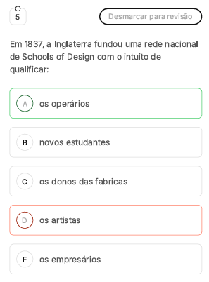 <p>5 Desmarcar para revisão Em 1837, a Inglaterra fundou uma rede nacional de Schools of Design com intuito de qualificar: A os operários B novos estudantes C os donos das fabricas D os artistas E os empresários</p>