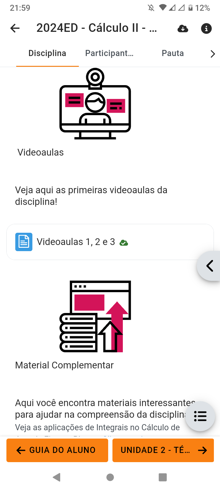 <p>21:59 12% 2024ED - Cálculo II - i Disciplina Participant. Pauta > Videoaulas Veja aqui as primeiras videoaulas da disciplina! Videoaulas 1,2 e 3 Material Complementar Aqui você encontra materiais para ajudar na compreensão da Veja as aplicações de Integrais no Cálculo de GUIA DO ALUNO UNIDADE 2 - TÉ...</p>