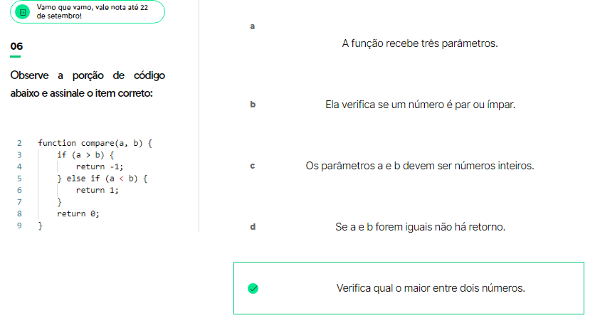 <p>Vamo que vamo, vale nota até 22 de setembro! a 06 A função recebe três parâmetros. Observe a porção de código abaixo e assinale item correto: b Ela verifica se um número é par ou impar. 2 function b) { 3 if 4 return -1; Os parâmetros a e b devem ser números inteiros. 5 } else if 6 return 1; 7 } 8 return 0; 9 ) d Se a e b forem iguais não há retorno. Verifica qual maior entre dois números.</p>