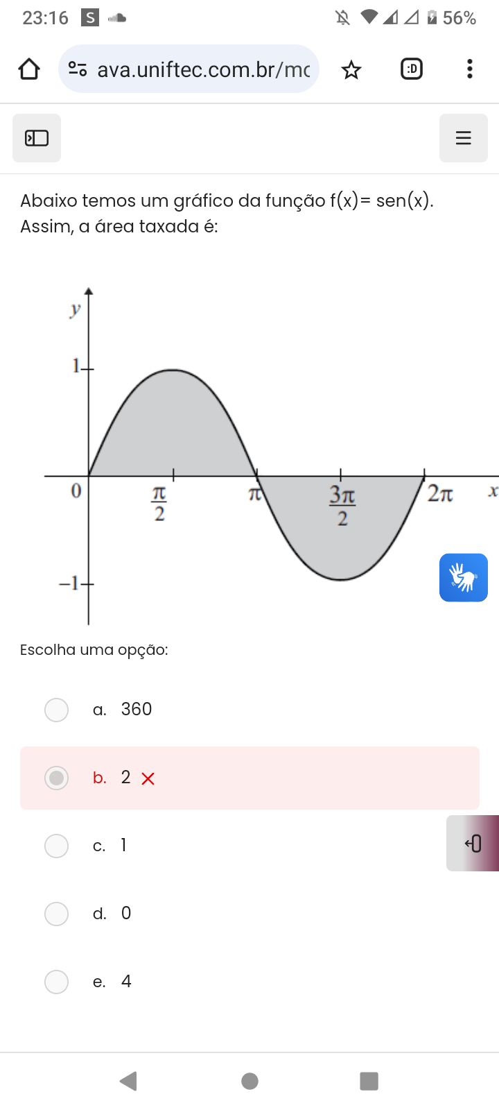 <p>23:16 S 56% :D Abaixo temos um gráfico da função f(x)=sen(x). Assim, a área taxada é: y 1 0 2 2 2 Escolha uma opção: a. 360 b. 2 X C. 1 d. 0 e. 4</p>