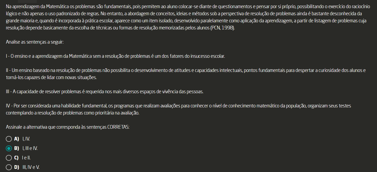 <p>Na aprendizagem da Matemática problemas são fundamentais, pois permitem ao aluno colocar-se diante de questionamentos e pensar por si próprio, possibilitando exercício do raciocínio lógico e não apenas USO padronizado de regras. No entanto, a abordagem de conceitos, ideias e métodos sob a perspectiva de resolução de problemas ainda é bastante desconhecida da grande maioria e, quando é incorporada à prática escolar, aparece como um item isolado, desenvolvido paralelamente como aplicação da aprendizagem, a partir de listagem de problemas cuja resolução depende basicamente da escolha de técnicas ou formas de resolução memorizadas pelos alunos (PCN, 1998). Analise as sentenças a seguir: - 0 ensino e a aprendizagem da Matemática sem a resolução de problemas é um dos fatores do insucesso II - Um ensino baseado na resolução de problemas não possibilita desenvolvimento de atitudes e capacidades intelectuais, pontos fundamentais para despertar a curiosidade dos alunos e torná-los capazes de lidar com novas situações. III - A capacidade de resolver problemas é requerida nos mais diversos espaços de vivência das pessoas. IV - Por ser considerada uma habilidade fundamental, os programas que realizam avaliações para conhecer nível de conhecimento matemático da população, organizam seus testes contemplando a resolução de problemas como prioritária na avaliação. Assinale a alternativa que corresponda às sentenças CORRETAS: A) B) I, III e IV. C) I e II. D) III, IV e V.</p>