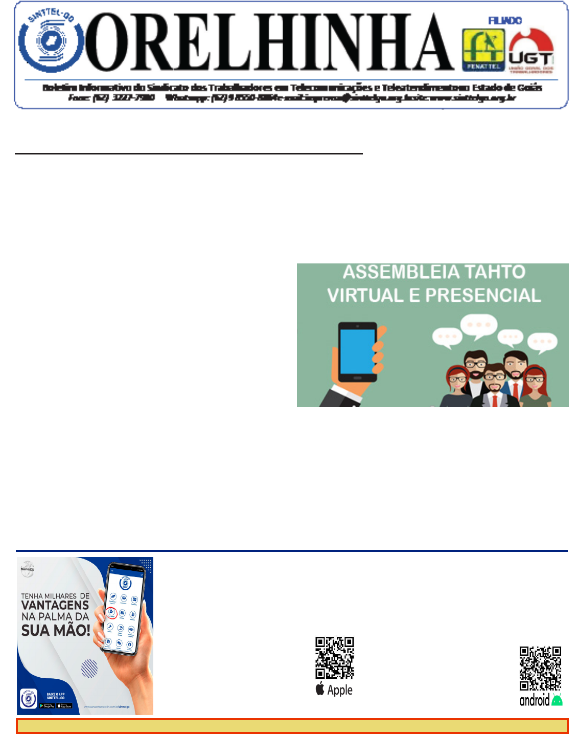 <p>Goiânia, 04 de março de 2024/N18</p><p>ASSEMBLEIA TAHTO</p><p>SINTTEL-GO CONVOCA TRABALHADORES</p><p>PARA DELIBERAÇÃO DO ACT 2024</p><p>Após 4 rodadas de negociações entre a</p><p>Comissão de Negociação, da qual o SINTTEL-GO</p><p>faz parte, e os negociadores da empresa TAHTO,</p><p>a empresa apresentou uma proposta final a ser</p><p>apresentada à categoria.</p><p>Foram negociações exaustivas, mas ape-</p><p>sar das dificuldades e intransigência por parte da</p><p>empresa, conseguimos quebrar as barreiras e</p><p>avançar nas cláusulas econômicas. A exemplo ci-</p><p>tamos o ganho real no VA/VR (Vale Alimentação/</p><p>Refeição), também conseguimos aumento real na</p><p>ajuda de custo Home Office. No reajuste salarial</p><p>garantimos a reposição da inflação (INPC).</p><p>Sobre a mudança do Auxílio Excepcional</p><p>imposto pela empresa na proposta final, o SINT-</p><p>TEL-GO salienta que não concorda com nenhum</p><p>tipo de redução dos benefícios já conquistados.</p><p>Deixamos claro na mesa de negociações que não</p><p>apoiamos esta mudança.</p><p>Votação será realizada nos dias 06, 07 e 08 de março de 2024 pelo aplicativo</p><p>SINTTELGO e de forma presencial na sede da empresa.</p><p>O SINTTEL-GO negociou, mas quem deci-</p><p>de é você trabalhador! Por isso convocamos todos</p><p>para participarem da Assembleia Geral que será</p><p>realizada pelo aplicativo SINTTELGO das 00h do</p><p>dia 06 de março (quarta-feira) às 16h do dia 08</p><p>de março de 2024. E na sede da empresa das 9h</p><p>às 16h do dia 08/03/2024 (sexta-feira). Este é o</p><p>momento de você trabalhador (a) participar ativa-</p><p>mente desta campanha salarial. Participe!</p><p>MUITA ATENÇÃO TRABALHADORES</p><p>DA TAHTO</p><p>Reiteramos mais um vez a necessidade</p><p>de todos participarem da assembleia do Acordo</p><p>Coletivo de Trabalho nos dias 23 e 24 do corrente</p><p>mês. O Sinttel/GO é o primeiro sindicato no setor de</p><p>telecomunicações que traz o APP para facilitar a vida</p><p>dos seus associados.</p><p>Essa ferramenta veio garantir e dar</p><p>oportunidade a todos trabalhadores filiados pela</p><p>primeira vez de votar no conforto de sua privacidade</p><p>democraticamente; e o Sindicato com essa ferramenta</p><p>terá absoluta certeza do que seus filiados realmente</p><p>desejam nas assembleias de acordo coletivo de</p><p>trabalho.</p><p>COMO VOTAR</p><p>Filiados</p><p>Trabalhadores associados ao se cadastrar não</p><p>será descontada sua contribuição em duplicidade,</p><p>mas é necessário fazer o recadastramento em FILIE-</p><p>SE no APP. Segue passo a passo abaixo:</p><p>1)Utilize o QR Code compatível com seu aparelho;</p><p>2)Em seguida clicar em FILIE-SE;</p><p>3)Preencha todos os dados e mantenha sempre</p><p>atualizados para ter todas informações do</p><p>Sindicato em suas mãos.</p><p>4)Após 30min do preenchimento ir no botão</p><p>Assembleia para votar.</p><p>Não Filiados</p><p>Você não associado tem a oportunidade de</p><p>fortalecer a luta por melhores condições de trabalho e</p><p>ter os mesmos benefícios do associado.</p><p>Segue passo a passo abaixo:</p><p>1)Utilize o QR Code compatível com seu aparelho;</p><p>2)Em seguida clicar em FILIE-SE;</p><p>3)Preencha todos os dados e mantenha sempre</p><p>atualizados para ter todas informações do</p><p>Sindicato em suas mãos.</p><p>4)Após 30min do preenchimento ir no botão</p><p>Assembleia para votar.</p><p>Goiânia, 22 de junho de 2022/N40</p><p>Goiânia, 14 de janeiro 2022-Nº02</p><p>SINTTEL-GO conquista adicional de periculosidade</p><p>para os trabalhadores de rede da Claro</p><p>O Sinttel-GO em defesa dos</p><p>direitos dos trabalhadores de redes da</p><p>CLARO S/A ingressou com ação</p><p>judicial solicitando o pagamento</p><p>integral de 30% do adicional de</p><p>periculosidade. Além disso pagou</p><p>perícia técnica, tendo em vista que o</p><p>laudo nos traz a realidade das</p><p>operações. Fomos bem sucedidos na</p><p>primeira audiência onde o juiz solicitou</p><p>que as partes tentassem um proposta</p><p>de acordo para resolver a questão.</p><p>Em virtude de buscar melhores</p><p>condições de trabalho, o SINTTEL-</p><p>Goiás teve avanço na petição e a</p><p>empresa sabendo que provavelmente</p><p>terá que pagar os direitos a seus</p><p>colaboradores, fez uma proposta</p><p>abrangido as seguintes funções:</p><p>Técnico de MDU 1, 2, e 3;</p><p>Técnico de Rede 1, 2, e 3.</p><p>Os técnicos da Claro são</p><p>expostos diariamente a condições de</p><p>risco por choque elétrico, pois</p><p>trabalham próximos a equipamentos</p><p>energizados e da rede elétrica.</p><p>Portanto o SINTTEL-GO continuará</p><p>lutando para que a Claro inclua os</p><p>demais técnicos abrangidos pelo</p><p>direito, garantindo assim a você</p><p>trabalhador de receber o adicional de</p><p>periculosidade.</p><p>A boa notícia que esses</p><p>trabalhadores terão acréscimo de 30%</p><p>no seu salário nominal, aposentadoria</p><p>antecipada com garantia do PPP</p><p>(Perfil Profissiográfico Previdenciário)</p><p>para uma aposentadoria antecipada,</p><p>como previsto na legislação.</p><p>O SINTTEL-GO como sempre</p><p>em defesa de melhores condições de</p><p>trabalho, obteve mais essa conquista</p><p>e solicita que os trabalhadores</p><p>possam de maneira organizada</p><p>manter essa entidade fortalecida</p><p>sempre.</p><p>Para mais informações confira o processo número: 0011188-94.2019.5.18.0002</p><p>O SINTTEL-GOIÁS. NOSSA MISSÃO É CUIDAR DE VOCÊ.</p><p>FILIADO</p><p>Boletim Informativo do Sindicato dos Trabalhadores em Telecomunicações e Teleatendimentono Estado de Goiás</p><p>Fone: (62) 3227-7900 Whatsapp: (62) 9 8550-8864e-mail:imprensa@sinttelgo.org.brsite:www.sinttelgo.org.br</p><p>Nº: 76/19 DATA:25/11/2019</p><p>ASSEMBLEIA TAHTO</p><p>Goiânia,20 de junho de 2022/Nº39</p><p>Sindicato traz mais uma melhoria</p><p>para os filiados</p><p
