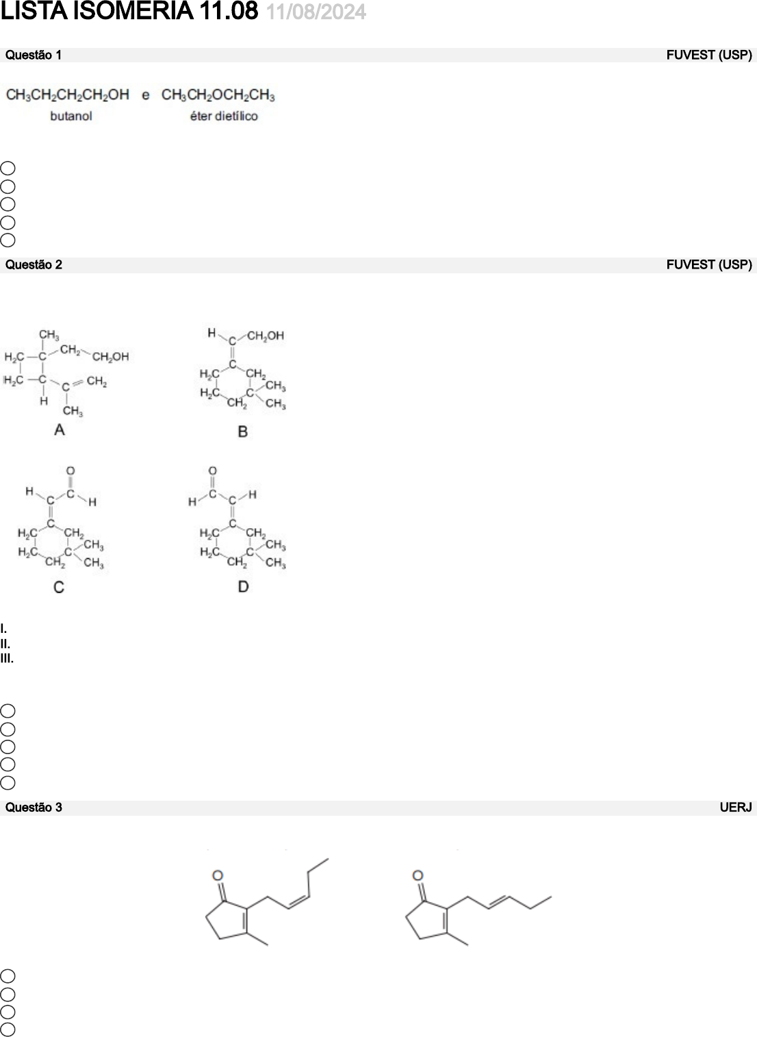 <p>LISTA ISOMERIA 11.08 11/08/2024</p><p>FUVEST (USP)Questão 1</p><p>Considere os seguintes compostos isoméricos:</p><p>Certas propriedades de cada uma dessas substâncias dependem das interações entre as moléculas que a compõem (como, por</p><p>exemplo, as ligações de hidrogênio). Assim, pode-se concluir que,</p><p>a a uma mesma pressão, o éter dietílico sólido funde a uma temperatura mais alta do que o butanol sólido.</p><p>b a uma mesma temperatura, a viscosidade do éter dietílico líquido é maior do que a do butanol líquido.</p><p>c a uma mesma pressão, o butanol líquido entra em ebulição a uma temperatura mais alta do que o éter dietílico líquido.</p><p>d a uma mesma pressão, massas iguais de butanol e éter dietílico liberam, na combustão, a mesma quantidade de calor.</p><p>e nas mesmas condições, o processo de evaporação do butanol líquido é mais rápido do que o do éter dietílico líquido.</p><p>FUVEST (USP)Questão 2</p><p>Uma espécie de besouro, cujo nome científico é Anthonomus grandis, destrói plantações de algodão, do qual se alimenta. Seu organismo</p><p>transforma alguns componentes do algodão em uma mistura de quatro compostos, A, B, C e D, cuja função é atrair outros besouros da</p><p>mesma espécie:</p><p>Considere as seguintes afirmações sobre esses compostos:</p><p>I. Dois são álcoois isoméricos e os outros dois são aldeídos isoméricos.</p><p>II. A quantidade de água produzida na combustão total de um mol de B é igual àquela produzida na combustão total de um mol de D.</p><p>III. Apenas as moléculas do composto A contêm átomos de carbono assimétricos.</p><p>É correto somente o que se afirma em</p><p>a I</p><p>b II</p><p>c III</p><p>d I e II</p><p>e I e III</p><p>UERJQuestão 3</p><p>A flor do jasmim é popular no Brasil, sendo admirada por sua beleza e aroma agradável. Os principais compostos responsáveis por seu</p><p>aroma estão representados a seguir.</p><p>Analisando as fórmulas estruturais desses compostos, identifica-se que a isomeria espacial existente entre eles é a denominada:</p><p>a óptica</p><p>b de cadeia</p><p>c de posição</p><p>d geométrica</p><p>Texto base 1</p><p>Entre os sanitizantes de mão mais difundidos no mundo, estão os produzidos à base de álcool, cuja composição inclui etanol, propanol,</p><p>isopropanol ou uma mistura deles, e água. A concentração de álcool nos sanitizantes geralmente varia de 60% a 95% em massa, sendo</p><p>70% a concentração ótima para desinfecção, no caso do etanol. Para aumentar a eficiência do composto, adiciona-se a ele carbômero,</p><p>um polímero produzido a partir do monômero ácido acrílico, que aumenta a viscosidade do material e facilita a sua aplicação por fricção</p><p>das mãos. Esse produto é conhecido como álcool em gel.</p><p>UnBQuestão 4</p><p>PARA RESPONDER À QUESTÃO, LEIA O TEXTO BASE 1</p><p>Propanol e isopropanol são isômeros de cadeia.</p><p>a Certo</p><p>b Errado</p><p>ENEM DigitalQuestão 5</p><p>Os feromônios de insetos são substâncias responsáveis pela comunicação química entre esses indivíduos. A extração de feromônios</p><p>para uso agronômico no lugar de pesticidas convencionais geralmente é inviável, pois são encontrados em baixa concentração nas</p><p>glândulas de armazenamento. Uma das formas de solucionar essa limitação é a síntese em laboratório dos próprios feromônios ou de</p><p>isômeros que apresentem a mesma atividade. Suponha que o composto apresentado seja um feromônio natural e que seu tautômero</p><p>seja um potencial substituto.</p><p>Com base na estrutura química desse feromônio, seu potencial substituto é representado pela substância:</p><p>a</p><p>b</p><p>c</p><p>d</p><p>e</p><p>UERJQuestão 6</p><p>Observe abaixo as fórmulas estruturais espaciais dos principais compostos do óleo de citronela, produto empregado como repelente de</p><p>mosquitos.</p><p>Considerando essas fórmulas estruturais, a quantidade de compostos que apresentam isômeros espaciais geométricos é igual a:</p><p>a 1</p><p>b 2</p><p>c 3</p><p>d 4</p><p>ENEM LIBRASQuestão 7</p><p>A figura representa a estrutura química do principal antiviral usado na pandemia de gripe H1N1, que se iniciou em 2009.</p><p>Qual é o número de enantiômeros possíveis para esse antiviral?</p><p>a 1</p><p>b 2</p><p>c 6</p><p>d 8</p><p>e 16</p><p>ENEMQuestão 8</p><p>A talidomida é um sedativo leve e foi muito utilizado no tratamento de náuseas, comuns no início da gravidez. Quando foi lançada, era</p><p>considerada segura para o uso de grávidas, sendo administrada como uma mistura racêmica composta pelos seus dois enantiômeros (R</p><p>e S). Entretanto, não se sabia, na época, que o enantiômero S leva à malformação congênita, afetando principalmente o desenvolvimento</p><p>normal dos braços e pernas do bebê.</p><p>Essa malformação congênita ocorre porque esses enantiômeros</p><p>a reagem entre si.</p><p>b não podem ser separados.</p><p>c não estão presentes em partes iguais.</p><p>d interagem de maneira distinta com o organismo.</p><p>e são estruturas com diferentes grupos funcionais.</p><p>UERJQuestão 9</p><p>Em uma das etapas do ciclo de Krebs, a enzima aconitase catalisa a isomerização de citrato em isocitrato, de acordo com a seguinte</p><p>equação química:</p><p>A isomeria plana que ocorre entre o citrato e o isocitrato é denominada de:</p><p>a cadeia</p><p>b função</p><p>c posição</p><p>d compensação</p><p>Texto base 2</p><p>Muito se ouve falar do colesterol bom e ruim, mas pouco se explica sobre seu real significado. O colesterol — molécula presente em</p><p>todas as células dos organismos animais — é essencial para a formação das membranas das células, a síntese de hormônios, como</p><p>testosterona, estrogênio, cortisol e outros, a digestão de alimentos gordurosos, a formação da mielina e a metabolização de algumas</p><p>vitamina