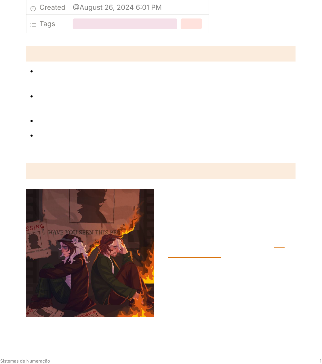 <p>Sistemas de Numeração 1</p><p>Sistemas de Numeração</p><p>Created</p><p>Tags arquitertura de computadores facu</p><p>Na cumputação Função</p><p>Decimal: para a entrada e saída dos dados, uma vez que os sistema de</p><p>numeração decimal é o mais utilizado na nossa sociedade.</p><p>Binária: para os cálculos internos, uma vez que que os circuitos digitais</p><p>utilizam a lógica binária.</p><p>Octal: utilizada como forma compactada de representação interna.</p><p>Hexadecimal: utilizada também como forma compactada de representação</p><p>interna.</p><p>Sistema Decimal–Números Decimais</p><p>A base de um sistema é a quantidade</p><p>de algarismos disponível na</p><p>representação. Na base 10, dispomos</p><p>de 10 algarismos para a representação</p><p>do número: 0, 1, 2, 3, 4, 5, 6, 7, 8 e 9.</p><p>O sistema decimal é um sistema de</p><p>valor posicional, então o valor de cada</p><p>dígito irá depender da posição em que</p><p>o número se encontra. O que definirá o</p><p>peso de cada dígito, de acordo com a</p><p>posição, será uma potência de 10. Para</p><p>entender isso vamos observar o</p><p>exemplo da Figura 1.</p><p>August 26, 2024 601 PM</p><p>Sistemas de Numeração 2</p><p>Sabemos que no número 539 o dígito 5 representa 500 ou 5 centenas, o dígito 3</p><p>representa 30 ou 3 dezenas e o dígito 9 representa 9 unidades. Essa</p><p>nomenclatura (centena, dezena, unidade) é dada justamente por causa dos pesos</p><p>que as potências de 10 fornecem a cada algarismo. No fim, o número formado é a</p><p>soma do produto do valor de cada dígito pelo seu valor posicional (potência de</p><p>10, ou seja, 500309539.</p><p>Sistema Binário</p><p>No sistema binário, existem somente</p><p>dois símbolos possíveis: 0 e 1. Com</p><p>somente esses dois algarismos</p><p>podemos representar qualquer</p><p>quantidade que também pode ser</p><p>representada em decimal ou em</p><p>qualquer outro sistema de numeração.</p><p>A diferença é que o sistema binário vai</p><p>utilizar um maior número de dígitos</p><p>para representar um valor.</p><p>Chamamos de BIT abreviatura de</p><p>Binary Digit ) os zeros e uns</p><p>utilizados no sistema binário.</p><p>O bit é a menor unidade</p><p>computacional.</p><p>Um bit pode assumir valor “0ˮ ou</p><p>valor “1ˮ</p><p>Sistemas de Numeração 3</p><p>Chamamos de Byte a um conjunto</p><p>de 8 bits</p><p>Passos do jeito 1</p><p>� Dividir o numero(vermelho) por</p><p>dois.</p><p>� Se o numero for lmpar coloca</p><p>1(laranja em baixo) e se for par</p><p>0(laranja em baixo)</p><p>� ler ao contrario 11001</p><p>Passos do jeito 2</p><p>� faz uma tabela com as potencias</p><p>de 2 os numeros em vermelho sao</p><p>os resultados)</p><p>� Tem que somar os resltados ate</p><p>formar o numero que quer.Como o</p><p>numero é 25 a gente soma ate</p><p>chegar nele. 1681 25</p><p>� depois nos numeros que usamos</p><p>colocamos 1 e o que não usamos</p><p>coloca 0</p><p>Sistema Octal – Números Octais</p><p>Na base 8 (octal), dispomos de 8 algarismos para a representação do número: 0,</p><p>1, 2, 3, 4, 5, 6 e 7</p><p>Sao usados para compactar dados</p><p>Sistemas de Numeração 4</p><p>Sistema Hexadecimal –Números</p><p>Hexadecimais</p><p>Os números hexadecimais são</p><p>amplamente utilizados na operação</p><p>dos microprocessadores. Eles são</p><p>muito menores do que os números</p><p>binários. Isto os torna mais fáceis de</p><p>escrever e de lembrar. Além disso,</p><p>podemos convertê-los mentalmente à</p><p>forma binária, sempre que necessário.</p><p>Hexadecimal significa 16. O sistema de</p><p>numeração hexadecimal tem base ou</p><p>raiz igual a 16.</p><p>Isto significa que ele utiliza 16 dígitos</p><p>para representar todos os números.</p><p>Os dígitos são: 0, 1, 2, 3, 4, 5, 6,</p><p>7, 8, 9, A, B, C, D, E e F.</p><p>Sao usados para compactar dados</p><p>Conveter binario para base 8</p><p>Sistemas de Numeração 5</p><p>seprara em 3 e tre</p><p>Conveter binario para base 16</p><p>sepra em 4 e 4</p><p>→ e para numeros maires que 9</p><p>Sistemas de Numeração 6</p><p>ai usa letra</p><p>Conveter base 8 para binario</p><p>Conveter base 16 para binario</p><p>Sistemas de Numeração 7</p>