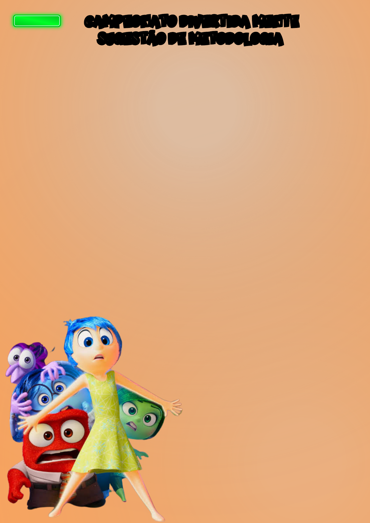 <p>CAMPEONATO DIVERTIDA MENTE</p><p>SUGESTÃO DE METODOLOGIA</p><p>CAMPEONATO DIVERTIDA MENTE</p><p>SUGESTÃO DE METODOLOGIA</p><p>@GAMIFICaporTUGUES</p><p>Esse campeonato consiste em um material gamificado, com questões elaboradas com base em</p><p>alguns descritores da disciplina. No material, as questões não são numeradas, como de</p><p>costume. Elas são identificadas pelas emoções dos filmes Divertida Mente.</p><p>No arquivo, você perceberá que há:</p><p>Primeiramente uma sequência com cinco questões (cinco emoções do primeiro filme) - Essa é</p><p>a primeira fase do campeonato;</p><p>Depois vem uma sequência com mais quatro questões (quatro novas emoções que aparecem</p><p>no filme) - Essa é a segunda fase;</p><p>E por último, vem mais nove questões (todas as emoções), totalizando 18 questões no jogo.</p><p>Em cada fase, o professor deverá registrar as pontuações, à medida que acertam as questões.</p><p>Para a realização do campeonato, você pode dividir os alunos em duas ou quatro equipes, a</p><p>depender do número de alunos de sua turma. Cada equipe pode escolher o estudante que o</p><p>representará, para se direcionar ao computador e clicar, conforme a sua equipe for</p><p>respondendo ou levantando a plaquinha. (Poderão mudar o representante, toda vez que a</p><p>equipe for responder. Fica a seu critério.)</p><p>Alguns professores, optam por apresentar as questões e pedir que os alunos apenas registrem</p><p>as respostas no cartão da página 3 deste arquivo. Neste caso, não dá para realizar o</p><p>campeonato.</p><p>A expressão campeonato é apenas para motivar a</p><p>participação.</p><p>O arquivo do jogo é enviado para você no formato</p><p>de apresentação, para que eu consiga garantir que</p><p>os efeitos de sons e botões clicáveis funcionem</p><p>com você, assim como apresento no vídeo. Quando o</p><p>estudante acerta ou erra uma questão, o arquivo</p><p>direciona o estudante para outra página que</p><p>apresenta o resultado do item. Todos esses detalhes,</p><p>tornam o material bem interativo.</p><p>Normalmente, o arquivo do jogo abre</p><p>desconfigurado pelo celular, mas pelo computador,</p><p>após o download, abre direitinho.</p><p>CAMPEONATO DIVERTIDA MENTE CAMPEONATO DIVERTIDA MENTE@GAMIFICaporTUGUES</p><p>IDENTIFICAR E CLASSIFICAR FIGURAS PLANAS: QUADRADO,</p><p>RETÂNGULO, TRIÂNGULO E CÍRCULO, DESTACANDO ALGUMAS DE</p><p>SUAS CARACTERÍSTICAS (NÚMERO DE LADOS E TIPO DE</p><p>ÂNGULOS).</p><p>RESOLVER PROBLEMA ENVOLVENDO INFORMAÇÕES</p><p>APRESENTADAS EM TABELAS OU GRÁFICOS.</p><p>RESOLVER PROBLEMA COM NÚMEROS INTEIROS ENVOLVENDO</p><p>SUAS OPERAÇÕES.</p><p>RESOLVER SITUAÇÃO-PROBLEMA QUE ENVOLVA EQUAÇÕES DE 1º</p><p>GRAU.</p><p>RESOLVER PROBLEMA COM NÚMEROS RACIONAIS ENVOLVENDO</p><p>SUAS OPERAÇÕES.</p><p>RESOLVER PROBLEMAS USANDO A MÉDIA ARITMÉTICA.</p><p>RESOLVER SITUAÇÃO PROBLEMA UTILIZANDO PORCENTAGEM.</p><p>RESOLVER PROBLEMA ENVOLVENDO O CÁLCULO DE ÁREA DE</p><p>FIGURAS PLANAS.</p><p>GABARITO - 8º E 9º ANOGABARITO - 8º E 9º ANO</p><p>RESOLVER SITUAÇÃO-</p><p>PROBLEMA ENVOLVENDO</p><p>EQUAÇÃO DO 2º GRAU.</p><p>RESOLVER PROBLEMA</p><p>ENVOLVENDO JUROS SIMPLES.</p><p>RESOLVER PROBLEMAS</p><p>ENVOLVENDO NOÇÕES DE</p><p>VOLUME.</p><p>CAMPEONATO DIVERTIDA MENTE CAMPEONATO DIVERTIDA MENTE@GAMIFICaporTUGUES</p><p>FASE 1 - DIVERTIDA MENTE 1</p><p>ALEGRIA - D</p><p>RAIVA - C</p><p>MEDO - A</p><p>NOJINHO - B</p><p>TRISTEZA - B</p><p>FASE 2 - DIVERTIDA MENTE 2</p><p>INVEJA - C</p><p>ANSIEDADE - C</p><p>VERGONHA - B</p><p>TÉDIO - C</p><p>HABILIDADES CONTEMPLADAS - 8º E 9º ANOHABILIDADES CONTEMPLADAS - 8º E 9º ANO</p><p>ALEGRIA - D</p><p>RAIVA - C</p><p>MEDO - A</p><p>NOJINHO - D</p><p>TRISTEZA - C</p><p>INVEJA - D</p><p>ANSIEDADE - D</p><p>VERGONHA - B</p><p>TÉDIO - A</p><p>FASE 3 - DIVERTIDA MENTE DOS</p><p>DESCRITORES</p>