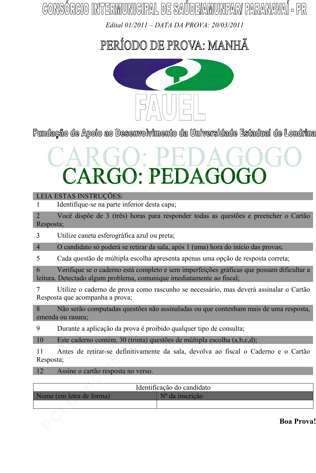 <p>pcimarkpci MjgwNDoyOWI4OjUwMTc6ZmExZDplMDBkOjVkZTA6NzQ3MzozNGQy:U3VuLCAyNSBBdWcgMjAyNCAxNDoyNzoyMSAtMDMwMA==</p><p>www.pciconcursos.com.br</p><p>Edital 01/2011 – DATA DA PROVA: 20/03/2011</p><p>LEIA ESTAS INSTRUÇÕES:</p><p>1 Identifique-se na parte inferior desta capa;</p><p>2 Você dispõe de 3 (três) horas para responder todas as questões e preencher o Cartão</p><p>Resposta;</p><p>3 Utilize caneta esferográfica azul ou preta;</p><p>4 O candidato só poderá se retirar da sala, após 1 (uma) hora do início das provas;</p><p>5 Cada questão de múltipla escolha apresenta apenas uma opção de resposta correta;</p><p>6 Verifique se o caderno está completo e sem imperfeições gráficas que possam dificultar a</p><p>leitura. Detectado algum problema, comunique imediatamente ao fiscal;</p><p>7 Utilize o caderno de prova como rascunho se necessário, mas deverá assinalar o Cartão</p><p>Resposta que acompanha a prova;</p><p>8 Não serão computadas questões não assinaladas ou que contenham mais de uma resposta,</p><p>emenda ou rasura;</p><p>9 Durante a aplicação da prova é proibido qualquer tipo de consulta;</p><p>10 Este caderno contém, 30 (trinta) questões de múltipla escolha (a,b,c,d);</p><p>11 Antes de retirar-se definitivamente da sala, devolva ao fiscal o Caderno e o Cartão</p><p>Resposta;</p><p>12 Assine o cartão resposta no verso.</p><p>Identificação do candidato</p><p>Nome (em letra de forma) Nº da inscrição</p><p>Boa Prova!</p><p>pcimarkpci MjgwNDoyOWI4OjUwMTc6ZmExZDplMDBkOjVkZTA6NzQ3MzozNGQy:U3VuLCAyNSBBdWcgMjAyNCAxNDoyNzoyMiAtMDMwMA==</p><p>www.pciconcursos.com.br</p><p>2</p><p>Gente desaparecida</p><p>Cecília Meireles</p><p>Por que desaparecem tanta gente, todos os dias, em redor de nós?</p><p>Ouço pelo rádio as famílias, os amigos, os conhecidos que indagam, inquietos, que reclamam, descrevem, dão</p><p>sinais, indicam pistas. Há desaparecidos de todas as idades e cores, e ambos os sexos, das mais variadas condições</p><p>sociais; quem tiver notícias de seu paradeiro, é favor informar às pessoas aflitas que os procuram.</p><p>Mas quem vai saber o paradeiro da mocinha de blusa cor-de-rosa e saia amarela que, assim colorida, bateu asas</p><p>sem se despedir dos parentes? Quem viu o menino de blusão verde e sapatos novos que saiu de casa pela tardinha e lá se</p><p>foi andando – e irá andando enquanto tiver boas solas de sapatos – por muito que os pais inconsoláveis o estejam</p><p>chorando e os vizinhos não possam entender tamanha ingratidão? Que foi feito da velhinha, um pouco desmemoriada,</p><p>que saiu para a missa e depois entrou por um caminho desconhecido, com seu vestido cinzento, sua bolsinha de verniz e</p><p>duas travessas no cabelo?</p><p>Há os desaparecidos recentes: de ontem, da semana passada, de há um mês ou dois. Assim mesmo recentes,</p><p>não se encontram vestígios seus em parte alguma. Foram raptados? Ficaram debaixo do trem? Subiram para algum</p><p>disco voador? Afogaram-se? Partiram para um secreto paraíso onde não querem ser importunados? Embarcaram para</p><p>Citera? Quem sabe o que lhes aconteceu?</p><p>Mais comovente, porém, é a busca de desaparecidos antigos: “Procura-se uma conhecida que _____ três anos</p><p>não se encontra...” Para onde foi a jovem Marília que _____ cinco anos disse que ia trabalhar no Rio de Janeiro?... Que</p><p>é feito do rapaz moreno, com um sinal no queixo, que usava um cordãozinho de ouro com a imagem de São Jorge?</p><p>Todas essas pessoas e muitas outras estão sendo procuradas pacientemente, com anúncios pelos jornais e nas</p><p>emissoras. Uma incansável busca. Gente de todos os Estados do Brasil, gente com vários compromissos: eram noivos,</p><p>eram chefes de família, eram donas de casa... Gente miúda, que não se esperava fosse capaz de meter-se em aventuras:</p><p>meninotas e rapazinhos em idade escolar; mocinhas que pareciam tímidas, moços ainda sem emprego...</p><p>Pois desapareceram. Para onde foram? Isso é o que se deseja saber. Não quiseram mais nada com pai nem mãe,</p><p>avós nem irmãos, casa, comida, sono, afeto – nada. Desejaram sumir, sumiram. Ou foram arrastados violentamente e</p><p>não tiveram forças para resistir. Talvez se sintam mais felizes. Talvez estejam arrependidos e envergonhados. Talvez</p><p>não existam mais. Pode ser que um dia voltem... Pode ser que, por enquanto, estejam dando a volta ao mundo num</p><p>veleiro imaginário... Pode ser que estejam cansados. Pode ser que não se cansem jamais... Enquanto não regressam, boa</p><p>viagem, senhores desaparecidos! Se não regressarem, boa viagem, também!</p><p>Mas os afetos vigilantes continuam, inconformados, a recordar os ausentes – todos os dias novos, todos os dias</p><p>mais numerosos – e, por humildes lugares, famílias tristes cultivam longos canteiros de saudades.</p><p>(MEIRELES, Cecília. Escolha seu sonho. 3. ed. Rio de Janeiro, Record, 1968. p. 47-9.)</p><p>01 - Assinale a alternativa que preenche corretamente as lacunas do 5º parágrafo:</p><p>a) faz e à. c) haviam e haviam.</p><p>b) há e há. d) fazem e há.</p><p>02 - Quanto à acentuação gráfica das palavras do texto analise as afirmativas:</p><p>I - As palavras rádio, famílias e anúncios são paroxítonas e são acentuadas porque terminam em ditongo.</p><p>II - As palavras paraíso e miúdas são acentuadas porque o i e o u são tônicos do hiato.</p><p>III - As palavras vestígios e tímidas obedecem à mesma regra de acentuação gráfica.</p><p>Quais afirmativas estão corretas?</p><p>a) apenas I e II. c) apenas I e III.</p><p>b) apenas II e III. d) todas as afirmativas estão corretas.</p><p>03 - Em “Enquanto não regressam, boa viagem, senhores desaparecidos! Se não regressarem, boa viagem</p><p>também!” (7º parágrafo).</p><p>Assinale a alternativa em que estão corretamente identificadas as relações de sentido estabelecidas na frase pelos</p><p>elementos coesivos em