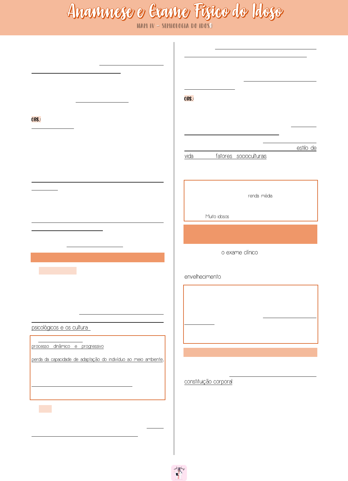 <p>1</p><p>Júlia Morbeck – @med.morbeck</p><p>↠ No Brasil, de 1960 a 2017, a esperança de vida</p><p>aumentou 27,9 anos, passando de 48 para 75,9 anos. A</p><p>previsão do IBGE é de que, no ano 2030, a expectativa</p><p>de vida ao nascer chegue a 78,6 anos.</p><p>↠ Esse processo, caracterizado por redução nas taxas</p><p>de natalidade e aumento da expectativa de vida, é</p><p>conhecido como transição demográfica e resulta no</p><p>envelhecimento populacional.</p><p>Deve-se acrescentar a estas mudanças demográficas os</p><p>pacientes centenários, os quais precisam ser estudados em seus</p><p>aspectos biológicos - anatômicos, fisiológicos, bioquímicos, imunológicos</p><p>- e psicossociais para serem adequadamente cuidados. Tais</p><p>conhecimentos serão necessários para interpretar os resultados de</p><p>exames laboratoriais e de imagem, além de indispensáveis para as</p><p>propostas terapêuticas, clínicas ou cirúrgicas.</p><p>↠ Com o envelhecimento populacional, verifica-se a</p><p>transição entre as principais causas de morbidade e</p><p>mortalidade (transição nosológica), de tal modo que as</p><p>doenças não transmissíveis e as causas externas passam</p><p>a predominar sobre as doenças transmissíveis, pois, à</p><p>medida que as pessoas alcançam idades avançadas,</p><p>aumenta o risco de que elas adquiram doenças crônicas</p><p>e desenvolvam incapacidades, acarretando importante</p><p>sobrecarga ao sistema de saúde. A esse fenômeno deu-</p><p>se o nome de transição epidemiológica.</p><p>Processo de envelhecimento e conceito de idoso</p><p>↠ Envelhecimento: É um termo aparentemente simples,</p><p>que, a princípio, dispensa definição, uma vez que mesmo</p><p>uma criança é capaz de diferenciar um jovem de um</p><p>velho, ou até um velho saudável de outro frágil e doente.</p><p>Em contrapartida, conceituar envelhecimento não é</p><p>tarefa simples. É necessário incluir não apenas os</p><p>aspectos biológicos, mas também os sociais, os</p><p>psicológicos e os culturais.</p><p>Do ponto de vista biológico, conceitua-se o envelhecimento como um</p><p>processo dinâmico e progressivo, no qual há modificações</p><p>morfológicas, funcionais, bioquímicas e psicológicas que determinam</p><p>perda da capacidade de adaptação do indivíduo ao meio ambiente,</p><p>ocasionando maior vulnerabilidade e maior incidência de processos</p><p>patológicos que terminam por levá-lo à morte.</p><p>Ninguém envelhece igual a outro da mesma espécie, mesmo que os</p><p>seus genótipos sejam praticamente idênticos, como os gêmeos</p><p>monozigóticos.</p><p>↠ Idoso: É impossível estabelecer o momento exato em</p><p>que um indivíduo se torna idoso. Na verdade, o processo</p><p>de envelhecimento faz parte de um contínuo que se inicia</p><p>com a concepção e só termina com a morte.</p><p>↠ Como é necessário estabelecer limites cronológicos</p><p>para estudos e planejamentos administrativos, a</p><p>Organização das Nações Unidas (ONU) e também a</p><p>Organização Mundial da Saúde (OMS), com base em</p><p>fatores socioeconômicos, consideram idoso todo indivíduo</p><p>com 60 anos ou mais.</p><p>No Brasil, do ponto de vista legal, idoso é toda pessoa maior de</p><p>60 anos de idade (Lei n. 8.842, de janeiro de 1994, e Lei no 10.741, de</p><p>outubro de 2003).</p><p>↠ Existem enormes variações individuais, pois o processo</p><p>de envelhecimento é muito heterogêneo e guarda pouca</p><p>relação com a idade cronológica, sofrendo influência não</p><p>só da passagem do tempo como também do estilo de</p><p>vida e de fatores socioculturais, além dos fatores</p><p>genéticos, que podem ser decisivos no processo de</p><p>envelhecimento.</p><p>Tanto a ONU como a OMS adotam os seguintes limites cronológicos:</p><p>• Idosos em países de renda média ou baixa: 60 anos ou</p><p>mais</p><p>• Idosos em países de renda alta: 65 anos ou mais</p><p>• Muito idosos: 80 anos ou mais.</p><p>Modificações anatômicas e funcionais no processo de</p><p>envelhecimento</p><p>↠ Para realizar o exame clínico do paciente idoso, deve-</p><p>se ter em mente alguns conceitos relacionados com as</p><p>características anatômicas e fisiológicas do processo de</p><p>envelhecimento.</p><p>Uma das principais preocupações sempre foi distinguir quais seriam as</p><p>modificações estruturais e funcionais provocadas exclusivamente pelo</p><p>processo do envelhecimento (senescência) daquelas causadas pelas</p><p>doenças que podem acometer o idoso (senilidade). Na maioria das</p><p>vezes, essa tarefa é impossível, pois há estreita relação entre esses</p><p>dois fenômenos, o fisiológico e o patológico.</p><p>Desse modo, o processo de envelhecimento modifica e é modificado</p><p>pelas doenças.</p><p>MODIFICAÇÕES SISTÊMICAS</p><p>↠ Dentre as modificações gerais ocasionadas pelo</p><p>envelhecimento destacam-se as alterações da</p><p>constituição corporal:</p><p>• Diminuição da massa óssea;</p><p>• Diminuição da massa muscular (sarcopenia);</p><p>• Redução da água intracelular;</p><p>• Aumento com redistribuição da gordura corporal, que se</p><p>acumula nos omentos, lóbulos das orelhas, regiões</p><p>paracardíaca e perirrenais;</p><p>• Diminuição do tecido celular subcutâneo dos membros e</p><p>aumento no tronco;</p><p>HAM IV – SEMIOLOGIA DO IDOSO</p><p>2</p><p>Júlia Morbeck – @med.morbeck</p><p>• Aumento dos diâmetros da caixa torácica e do crânio;</p><p>• Diminuição da estatura em cerca de 1 cm por década a</p><p>partir dos 40 anos, em decorrência da acentuação das</p><p>curvaturas da coluna vertebral e do achatamento dos arcos</p><p>dos pés e dos discos intervertebrais.</p><p>↠ A taxa de metabolismo basal diminui cerca de 10 a 20%</p><p>no idoso, o que reduz suas necessidades calóricas. Essas</p><p>modificações devem ser valorizadas principalmente</p><p>qu