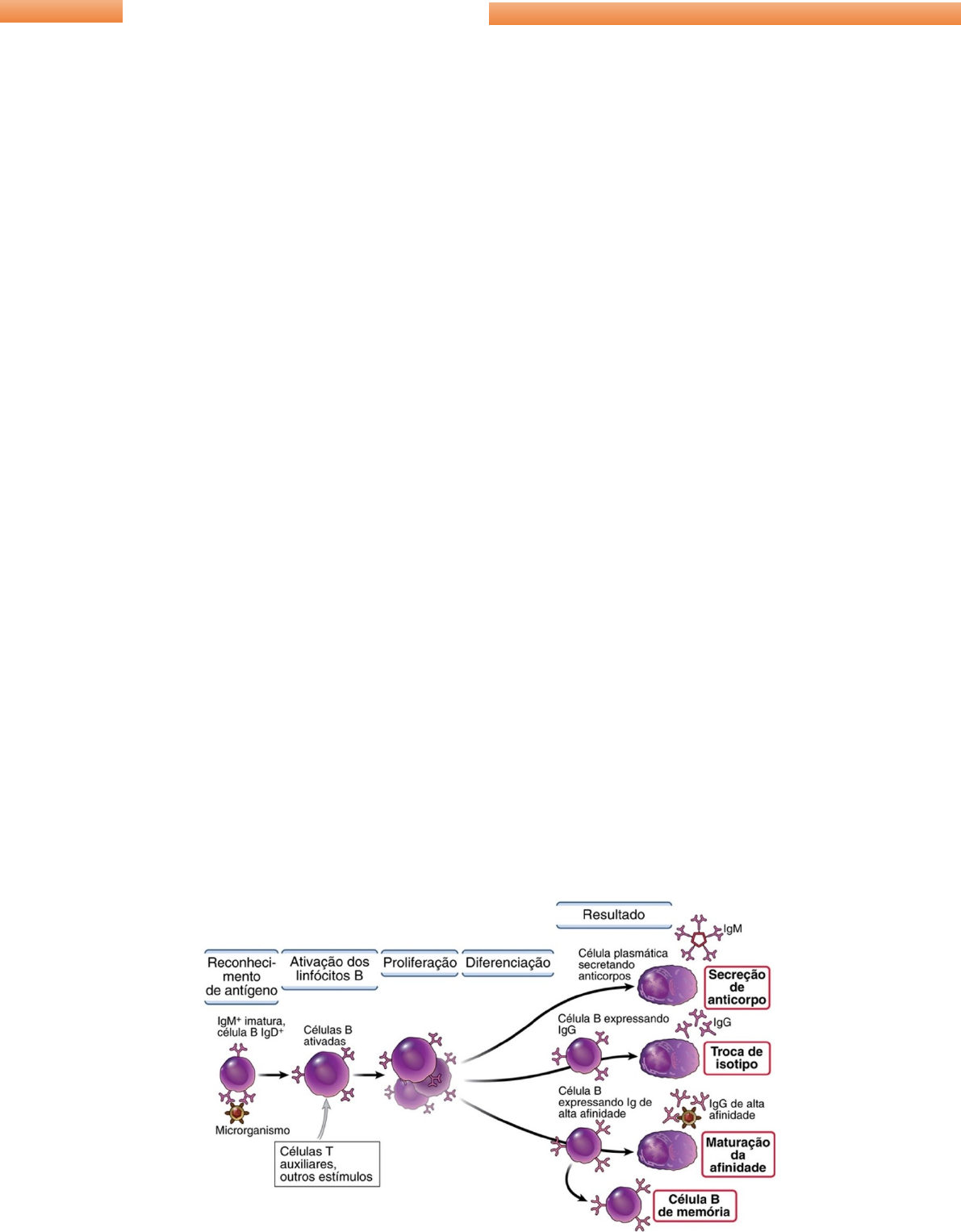 <p>Aulas 8 e 9 – Imunologia</p><p>Imunidade Humoral</p><p>- É mediada por anticorpos e tem a função de neutralizar e eliminar microrganismos extracelulares e toxinas microbianas, sendo o principal mecanismos de defesa contra patógenos com cápsulas ricas e polissacarídeos e lipídios;</p><p>- As células B respondem e produzem anticorpos especificos, enquanto que as células T, que são mediadoras da imunidade celular, reconhecem e respondem apenas aos antígenos proteicos que estão internalizados ou sintetizados nas células;</p><p>- Os linfócitos B podem ser ativados por diferentes antígenos, como proteínas, polissacarídeos, lipídios, ácidos nucleicos;</p><p>- Os antígenos proteicos são processados nas APC e identificados pelos LT auxiliares;</p><p>-As células T auxiliares são importantes para a ativação de células B e são potentes indutores da troca de cadeia pesada e maturação da afinidade;</p><p>Fases das respostas Imunes Humorais</p><p>- Os linfócitos B naive, expressam IgM e IgD, imunoglobulinas que funcionam como receptores para os antígenos;</p><p>- A proliferação de células antígéno- especificas ( expansão clonal) e sua diferenciação em plasmócito, são resultados da ativação dos linfócitos B;</p><p>- Os plasmócitos são as células efetoras da imunidade humoral e secretam ativamente anticorpos;</p><p>Resumindo: Tudo se inicia com o reconhecimento do antígeno pelos linfócitos B virgens; as células T auxiliares, ativam as células B, quando se inicia a proliferação celular ( expansão clonal), para a diferenciação em células efetoras de anticorpos. O resultado é um grande número de linfócitos B e logo depois uma grande produção de anticorpos, garantindo assim que a defesa acompanhe a expansão da infecção. Além disso, as células B ativadas sofrem troca de isotipo de cadeia pesada e maturação da afinidade, tornando-se células de memória de longa duração;</p><p>1. Fase de reconhecimento:</p><p>O antigeno é carregado pelos macrofagos, que o apresenta aos linfócitos que possuem receptores na superficie de sua membrana citoplasmática, reconhecendo separadamente as estruturas moleculares e caracterizando o antígeno;</p><p>2. Fase de proliferação clonal:</p><p>Ocorre quando o antígeno é reconhecido pelo linfócito e desencadeia a multiplicação das células e a síntese de moléculas de reconhecimento, a produção de anticorpos pelos linfócitos B – já na forma de plasmócitos – e de seus receptores especificos na superficie dos linfocitos T, funcionalmente similares a porção variável das imunoglobulinas;</p><p>3. Fase efetora:</p><p>É a fase que ocorre a reação dos anticorpos ou dos receptores dos linfócitos T com o antígeno neutralizado e sua eliminação. Nesta fase, outras células podem intervir, como os mastócitos, polimorfonucleares e basofilos, podendo levar a reação alérgica.</p><p>- As respostas dos anticorpos a diferentes antígenos, podem ser Dependentes de T ou indepententes de T, dependendo da necessidade de célula T auxiliar;</p><p>Tipos de Respostas Imunes</p><p>T- Dependentes</p><p>- Antígenos proteicos necessitam da resposta combinada com linfócitos T;</p><p>- As respostas, mas sofisticadas e efetivas do anticorpo são geradas sob a influência das células T auxiliares;</p><p>Como ocorre este processo?</p><p>- O linfócito B reconhece o antígeno e o processa para apresentá-lo ao linfócito TCD4. Ao se ligar ao linfócito T, este se torna ativo e começa a secretar citocinas que sinalizam para outros linfócitos B que são ativados e produzem anticorpos de maior afinidade ao antígeno que ali está.</p><p>T- independentes</p><p>- Antígenos lipídicos e polissacarídeos não precisam de resposta combinada com linfócitos T, portanto, antígenos não proteicos estimulam a produção de anticorpos sem o comprometimento de células T auxiliares;</p><p>- Respostas relativamente simples;</p><p>image4.jpeg</p><p>image1.jpeg</p><p>image2.png</p><p>image3.jpeg</p>
