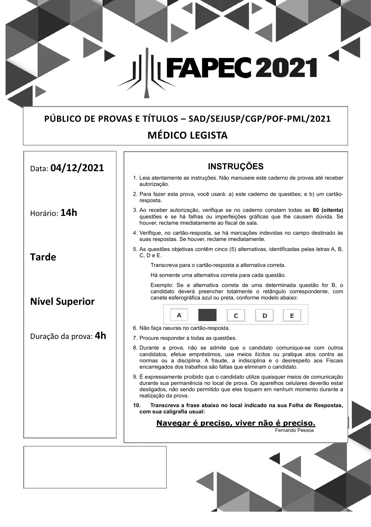 <p>pcimarkpci MjgwNDowMTRjOjViNzM6ODNiNzpkMWJkOjYxODE6NWE0NjoyZTFl:VHVlLCAyOCBGZWIgMjAyMyAyMjo1NzowOSAtMDMwMA==</p><p>www.pciconcursos.com.br</p><p>PÚBLICO DE PROVAS E</p><p>Data: 04/12/2021</p><p>Horário: 14h</p><p>Tarde</p><p>Nível Superior</p><p>Duração da prova: 4h</p><p>1. Leia atentamente as instruções. Não manuseie este caderno de provas até receber</p><p>autorização.</p><p>2. Para fazer</p><p>resposta.</p><p>3. Ao receber autorização, verifique se no caderno constam todas as</p><p>questões e se há falhas ou imperfeições gráficas que lhe causem dúvida. Se</p><p>houver, reclame imediatamente ao fiscal de sala.</p><p>4. Verifique, no cartão</p><p>suas respostas. Se houver, reclame imediatamente.</p><p>5. As</p><p>C, D e E.</p><p>6. Não faça rasuras no cartão</p><p>7. Procure responder a todas as questões.</p><p>8. Durante a prova, n</p><p>candidatos, efetue empréstimos, use meios ilícitos ou pratique atos contra as</p><p>normas ou a disciplina. A fraude, a indisciplina e o desrespeito aos Fiscais</p><p>encarregados dos trabalhos são faltas que elimin</p><p>9. É expressamente proibido que o candidato utilize quaisquer meios de comunicação</p><p>durante sua permanência no local de prova. Os aparelhos celulares deverão estar</p><p>desligados, não sendo permitido que eles toquem em nenhum momento durante a</p><p>rea</p><p>10.</p><p>com sua caligrafia usual:</p><p>PÚBLICO DE PROVAS E TÍTULOS – SAD/SEJUSP/CGP/POF</p><p>MÉDICO LEGISTA</p><p>INSTRUÇÕES</p><p>Leia atentamente as instruções. Não manuseie este caderno de provas até receber</p><p>autorização.</p><p>Para fazer esta prova, você usará: a) este caderno de questões; e b) um cartão</p><p>resposta.</p><p>Ao receber autorização, verifique se no caderno constam todas as</p><p>questões e se há falhas ou imperfeições gráficas que lhe causem dúvida. Se</p><p>houver, reclame imediatamente ao fiscal de sala.</p><p>Verifique, no cartão-resposta, se há marcações indevidas no campo destinado às</p><p>suas respostas. Se houver, reclame imediatamente.</p><p>As questões objetivas contêm cinco (5) alternativas, identificadas pelas letras A, B,</p><p>C, D e E.</p><p>Transcreva para o cartão-resposta a alternativa correta.</p><p>Há somente uma alternativa correta para cada questão.</p><p>Exemplo: Se a alternativa correta de uma determinada questão for B, o</p><p>candidato deverá preencher totalmente o retângulo correspondente, com</p><p>caneta esferográfica azul ou preta, conforme modelo abaixo:</p><p>Não faça rasuras no cartão-resposta.</p><p>Procure responder a todas as questões.</p><p>Durante a prova, não se admite que o candidato comunique</p><p>candidatos, efetue empréstimos, use meios ilícitos ou pratique atos contra as</p><p>normas ou a disciplina. A fraude, a indisciplina e o desrespeito aos Fiscais</p><p>encarregados dos trabalhos são faltas que eliminam o candidato.</p><p>É expressamente proibido que o candidato utilize quaisquer meios de comunicação</p><p>durante sua permanência no local de prova. Os aparelhos celulares deverão estar</p><p>desligados, não sendo permitido que eles toquem em nenhum momento durante a</p><p>realização da prova.</p><p>10. Transcreva a frase abaixo no local indicado na sua Folha de Respostas,</p><p>com sua caligrafia usual:</p><p>Navegar é preciso, viver não é preciso.</p><p>A C D</p><p>SAD/SEJUSP/CGP/POF-PML/2021</p><p>Leia atentamente as instruções. Não manuseie este caderno de provas até receber</p><p>esta prova, você usará: a) este caderno de questões; e b) um cartão-</p><p>Ao receber autorização, verifique se no caderno constam todas as 80 (oitenta)</p><p>questões e se há falhas ou imperfeições gráficas que lhe causem dúvida. Se</p><p>resposta, se há marcações indevidas no campo destinado às</p><p>questões objetivas contêm cinco (5) alternativas, identificadas pelas letras A, B,</p><p>resposta a alternativa correta.</p><p>Há somente uma alternativa correta para cada questão.</p><p>determinada questão for B, o</p><p>candidato deverá preencher totalmente o retângulo correspondente, com</p><p>caneta esferográfica azul ou preta, conforme modelo abaixo:</p><p>ão se admite que o candidato comunique-se com outros</p><p>candidatos, efetue empréstimos, use meios ilícitos ou pratique atos contra as</p><p>normas ou a disciplina. A fraude, a indisciplina e o desrespeito aos Fiscais</p><p>am o candidato.</p><p>É expressamente proibido que o candidato utilize quaisquer meios de comunicação</p><p>durante sua permanência no local de prova. Os aparelhos celulares deverão estar</p><p>desligados, não sendo permitido que eles toquem em nenhum momento durante a</p><p>Transcreva a frase abaixo no local indicado na sua Folha de Respostas,</p><p>Navegar é preciso, viver não é preciso.</p><p>Fernando Pessoa</p><p>E</p><p>pcimarkpci MjgwNDowMTRjOjViNzM6ODNiNzpkMWJkOjYxODE6NWE0NjoyZTFl:VHVlLCAyOCBGZWIgMjAyMyAyMjo1NzowOSAtMDMwMA==</p><p>www.pciconcursos.com.br</p><p>Página 2 de 17</p><p>LÍNGUA PORTUGUESA</p><p>As questões de 01 a 06 referem-se ao texto a seguir e avaliam conhecimentos sobre diferentes itens do</p><p>conteúdo previsto para a prova.</p><p>Quando não há mais vida, resta à medicina estabelecer a verdade. A missão de desvendar as</p><p>causas reais de uma morte pertence aos médicos legistas, profissionais que comemoram o seu dia em 7</p><p>de abril. Mas, apesar de a ideia recorrente sobre a área remeter ao trabalho com cadáveres, essa é a</p><p>menor demanda na rotina de um Instituto Médico-Legal. No Paraná, por exemplo, foram 53.322</p><p>atendimentos a vítimas vivas e 9.052 casos de óbito em 2015.</p><p>“O trabalho realizado por todos os profissionais do Instituto Médico-Legal é muito difícil, sensível,</p><p>técnico e vem ao encontro da população e demais profissionais da Segurança Pública em momentos</p><p>críticos. Então, devemos todo respeito, toda consideraç